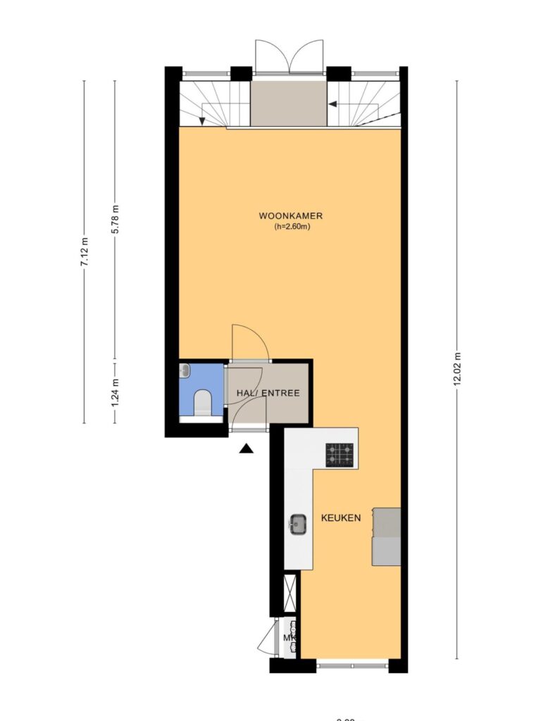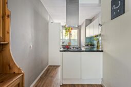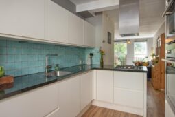 Via de entree/voordeur stap je binnen in de hal met modern toilet. Vanuit hier kom je in de woonkamer met vide en een grote glazen achterpui, waardoor de ruimte heerlijk licht en ruimtelijk aanvoelt. Aan de voorzijde bevindt zich de open keuken met eetgedeelte. De moderne keuken is uitgevoerd met witte kasten, een donker granieten werkblad en diverse inbouwapparatuur.