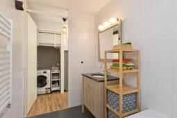 Een open trap leidt naar het souterrain. De overloop is verrassend licht dankzij dubbele tuindeuren en een extra raam, en geeft direct toegang tot de tuin. Onder de trap is een praktische bergruimte met uitschuifbare kledingkast gemaakt. Vanuit de overloop bereik je een ruime slaapkamer met achtergelegen berging en de moderne badkamer. De badkamer is voorzien van een ligbad met douche, een wastafelmeubel en een kast met de cv-installatie (2025).