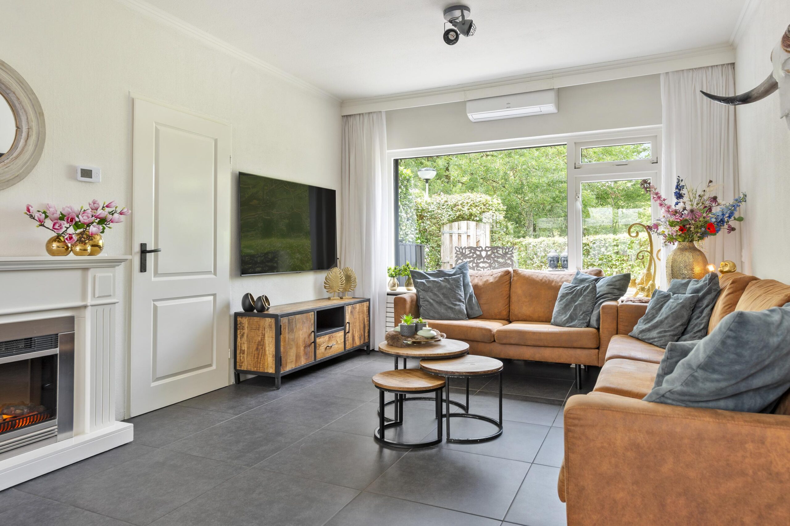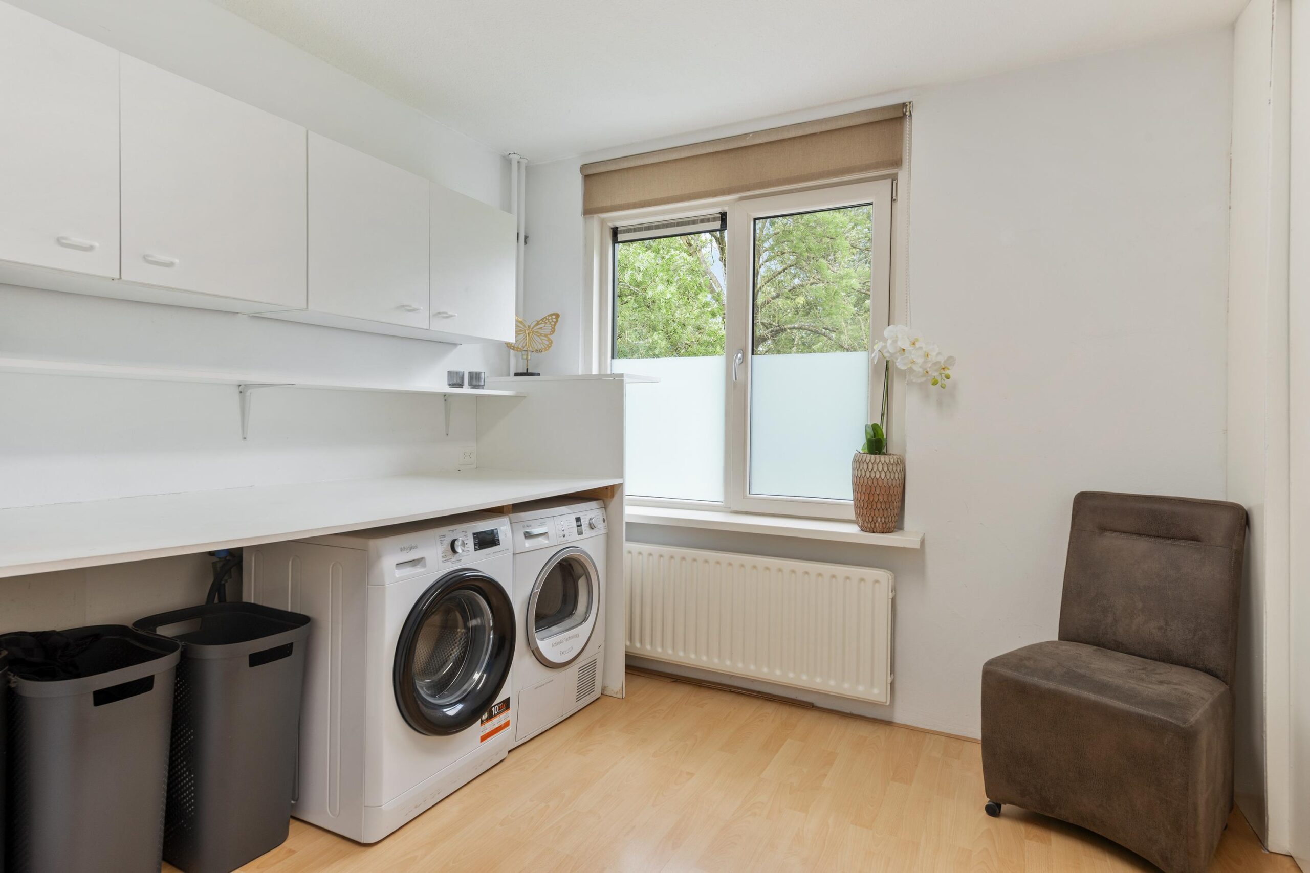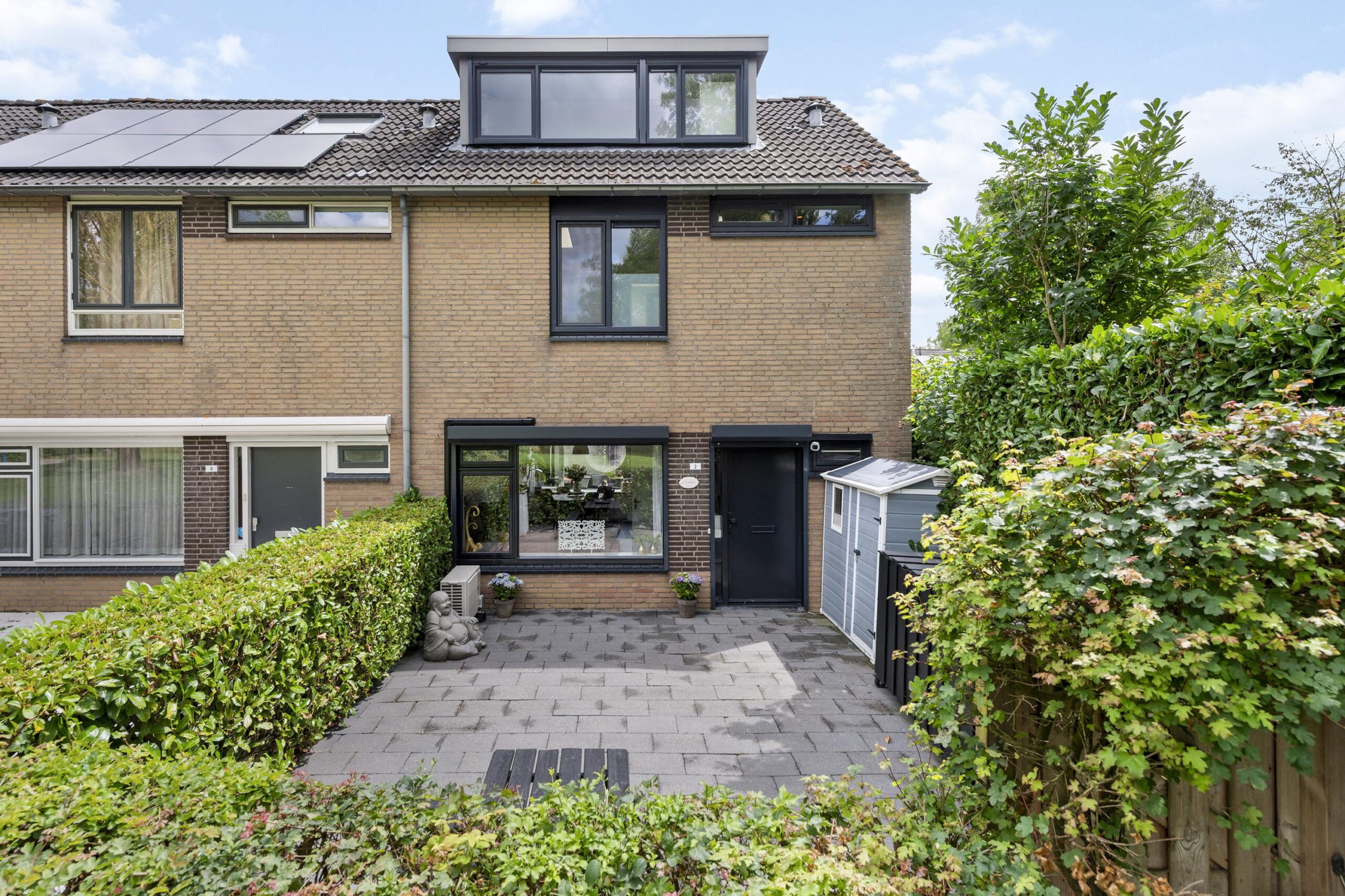 De fraai aangelegde voortuin, gelegen aan de groenstrook met vrij uitzicht, leidt naar de entree. Vanuit de hal met moderne meterkast, trapkast en modern toilet met fonteintje, bereik je de lichte, ruime woonkamer met grote raampartijen, airco en een fraaie plavuizen vloer. De moderne open keuken is uitgerust met diverse inbouwapparatuur en geeft via een tuindeur toegang tot de achtertuin.