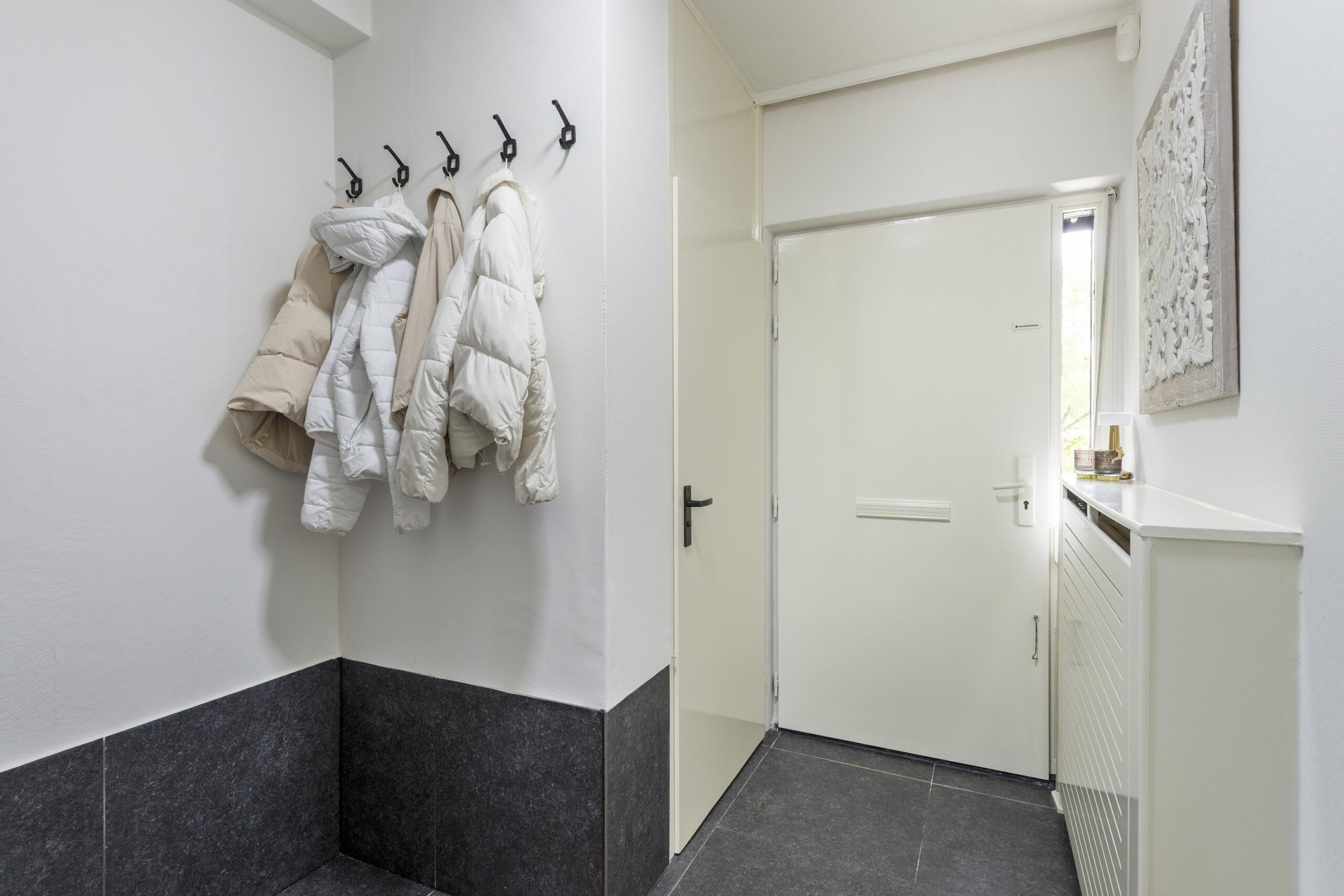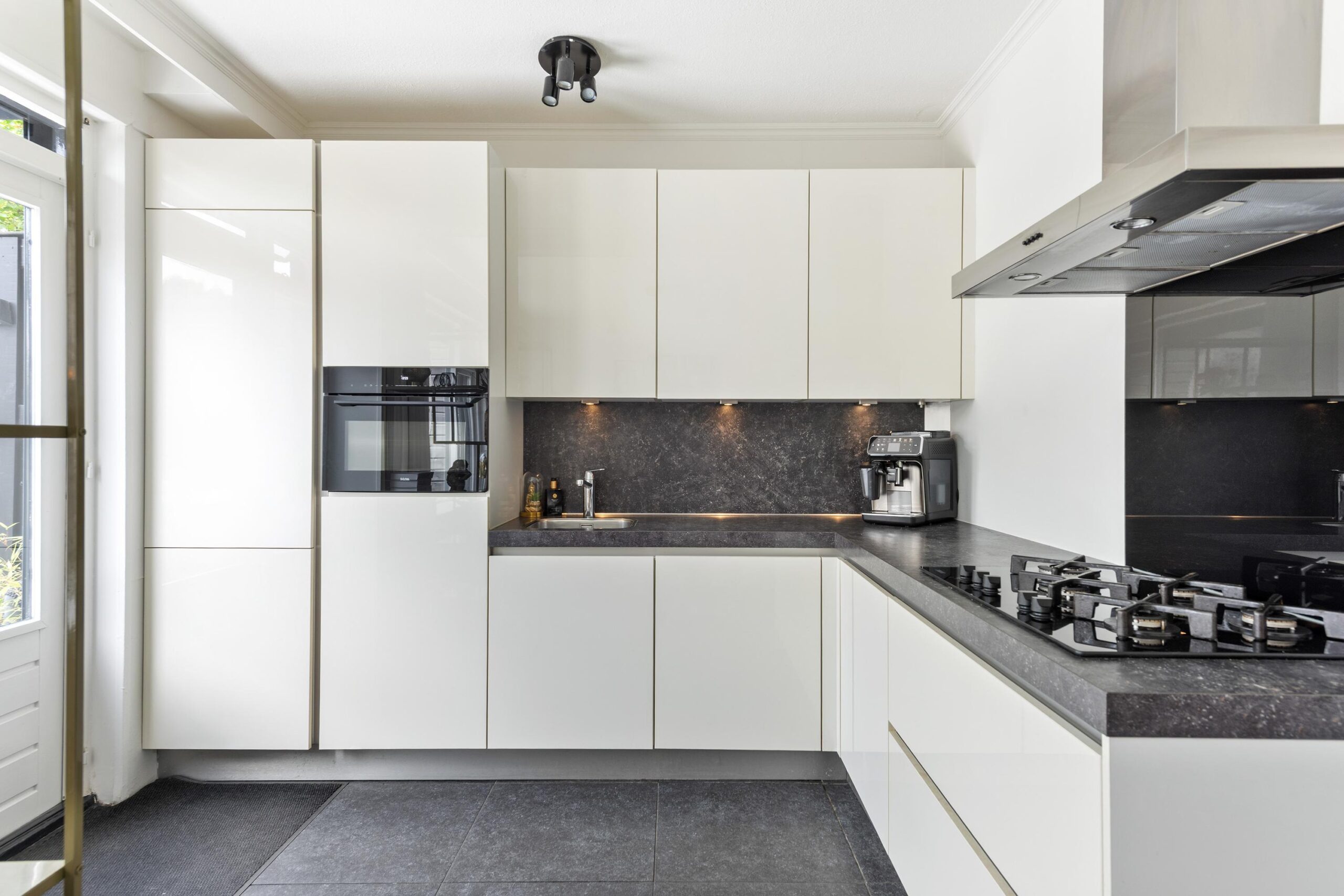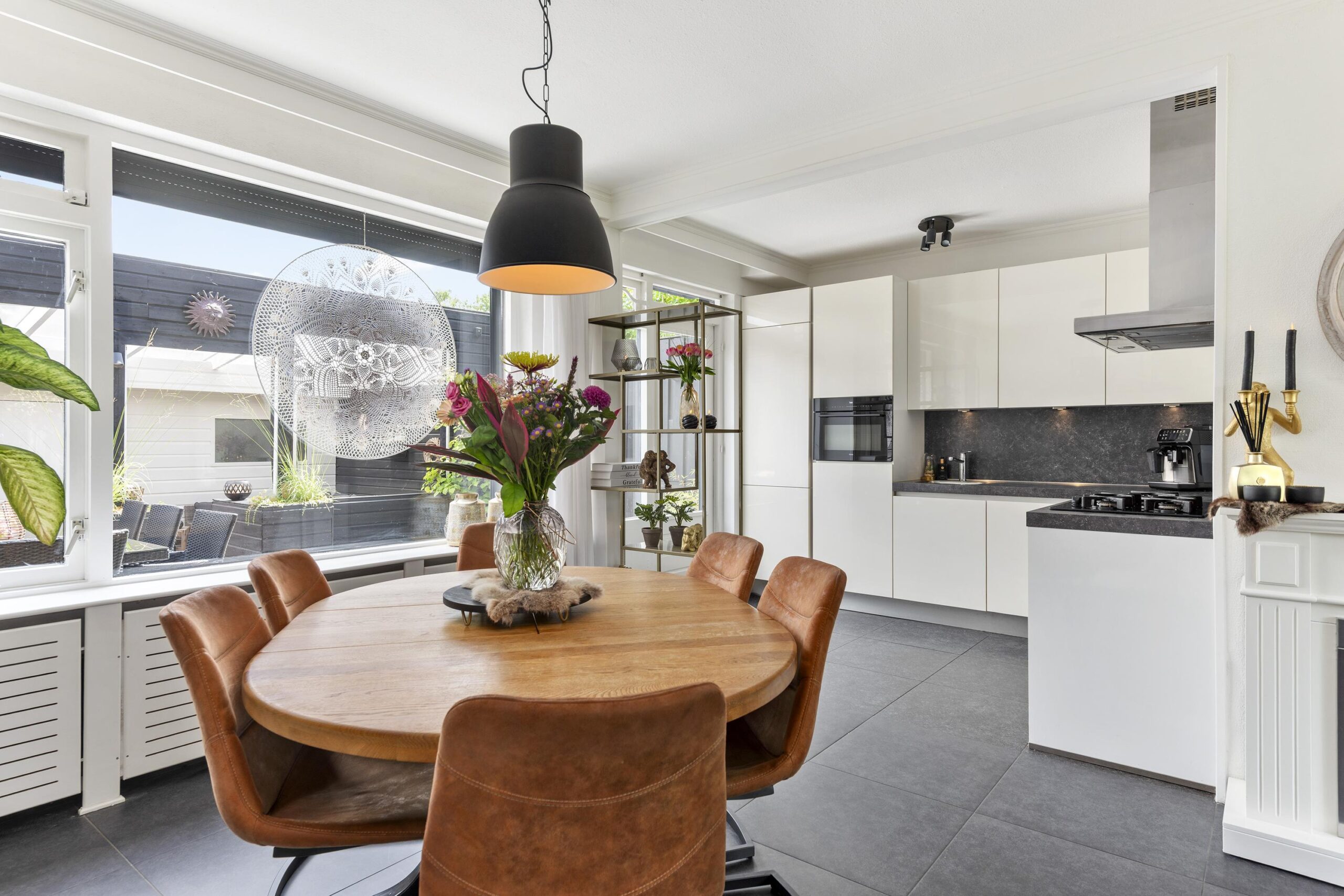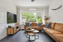 De fraai aangelegde voortuin, gelegen aan de groenstrook met vrij uitzicht, leidt naar de entree. Vanuit de hal met moderne meterkast, trapkast en modern toilet met fonteintje, bereik je de lichte, ruime woonkamer met grote raampartijen, airco en een fraaie plavuizen vloer. De moderne open keuken is uitgerust met diverse inbouwapparatuur en geeft via een tuindeur toegang tot de achtertuin.