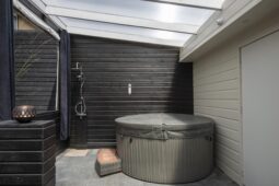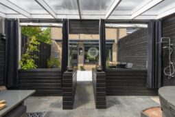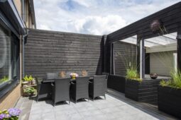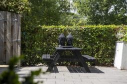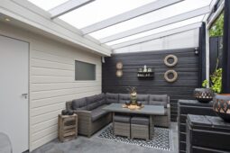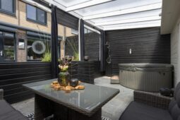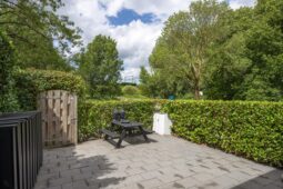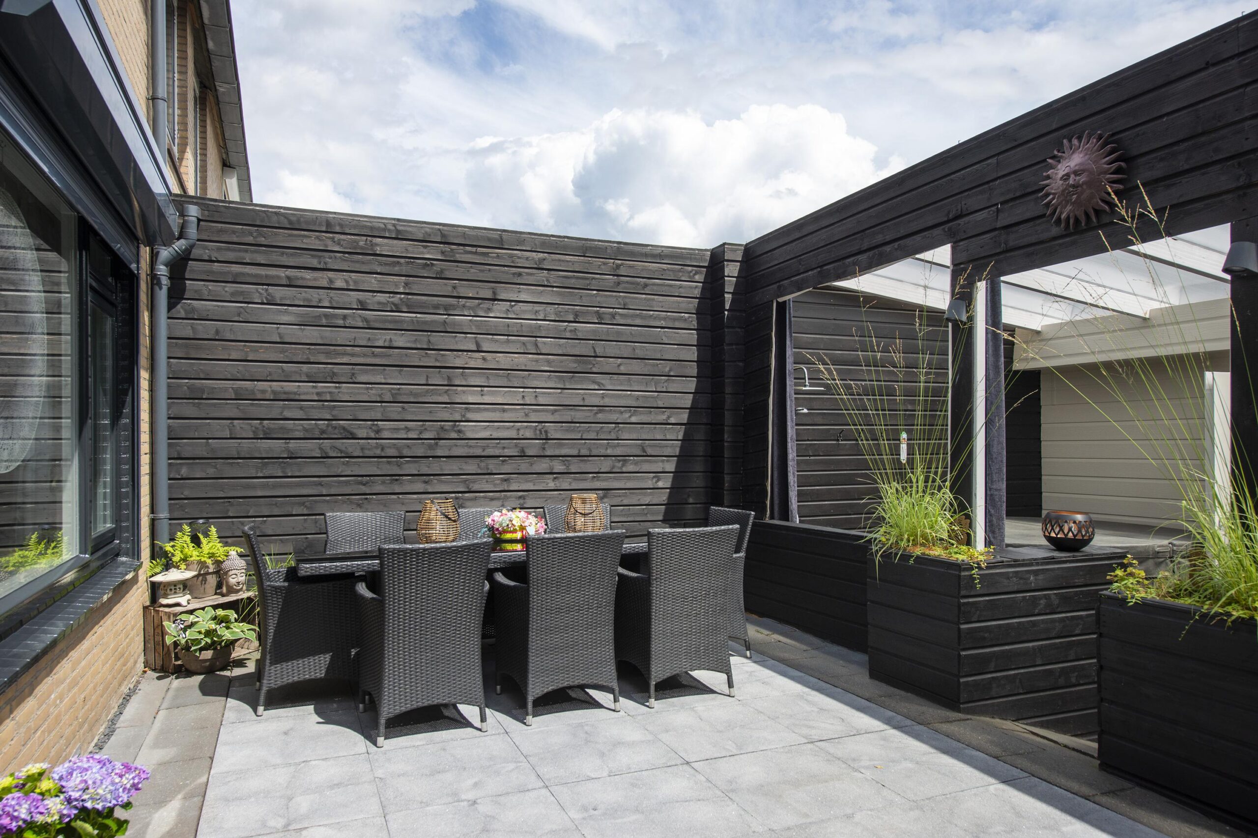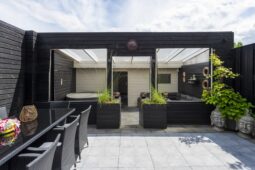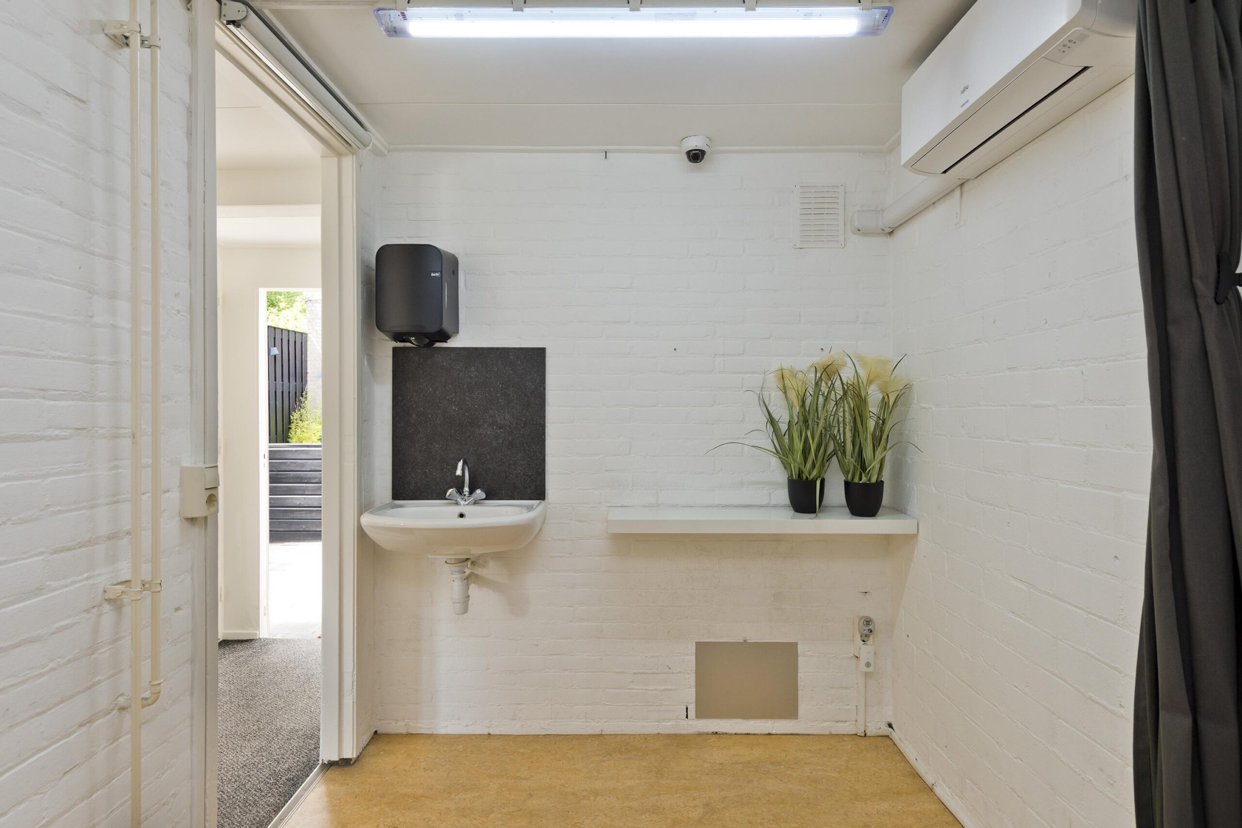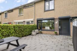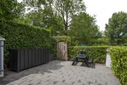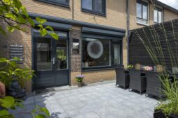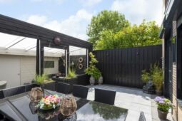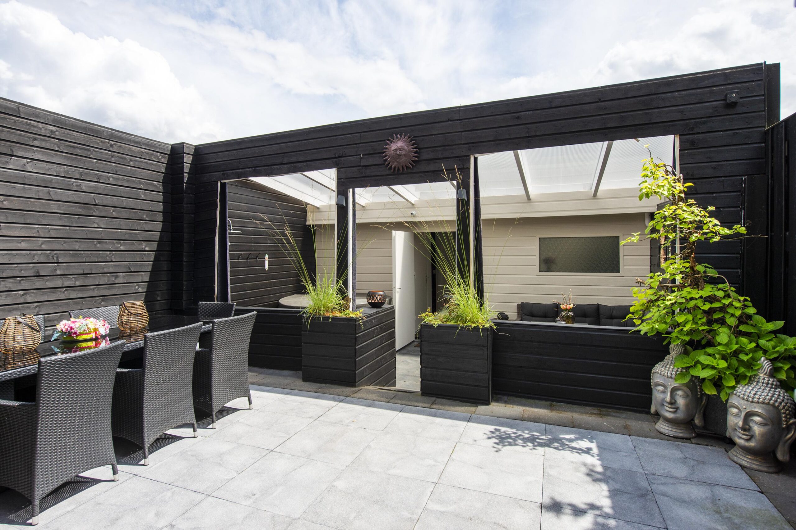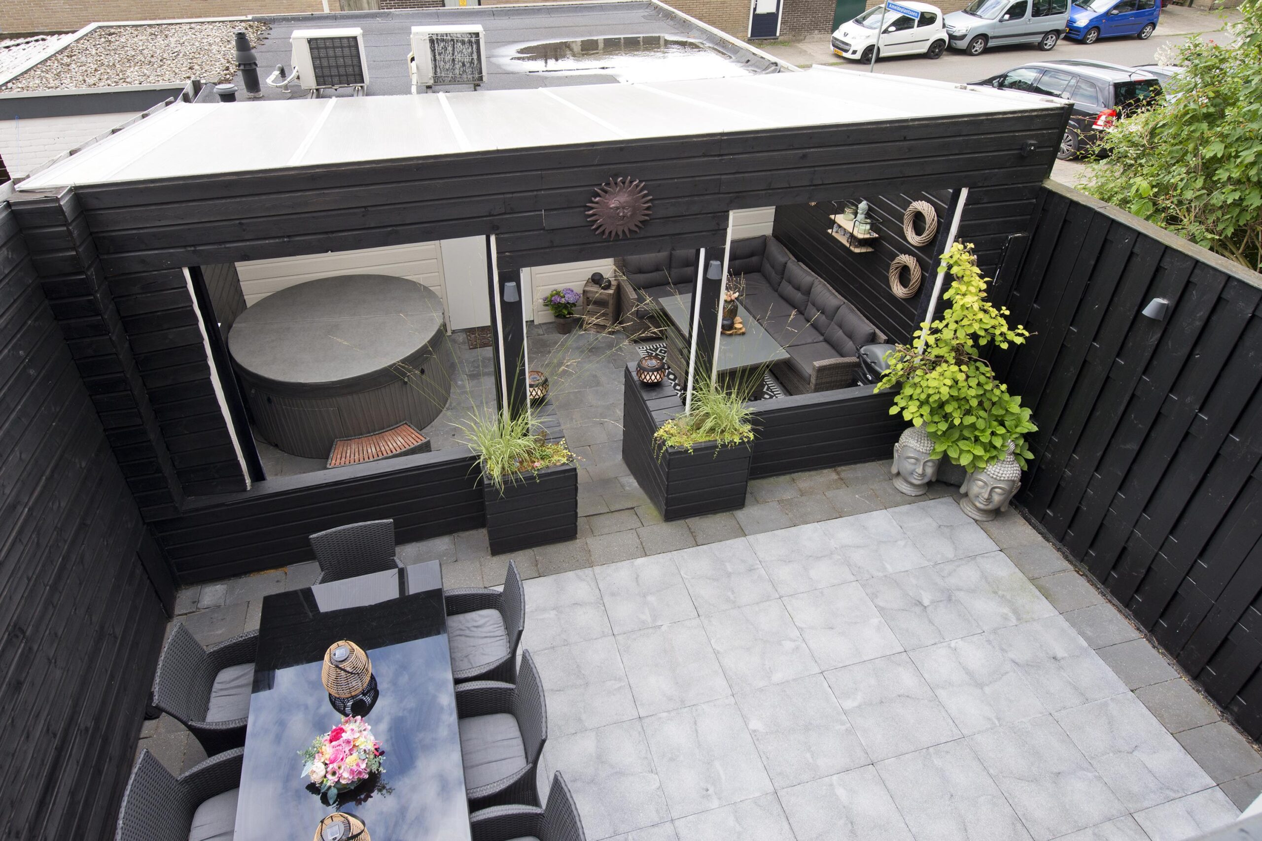 De onderhoudsvriendelijke achtertuin is modern ingericht en beschikt over een terras met overkapping. Vanuit de tuin is het multifunctionele bijgebouw bereikbaar. Dit beschikt over diverse ruimtes, een eigen ingang, toilet, kitchenette, wastafel, cv-ketel en airco.