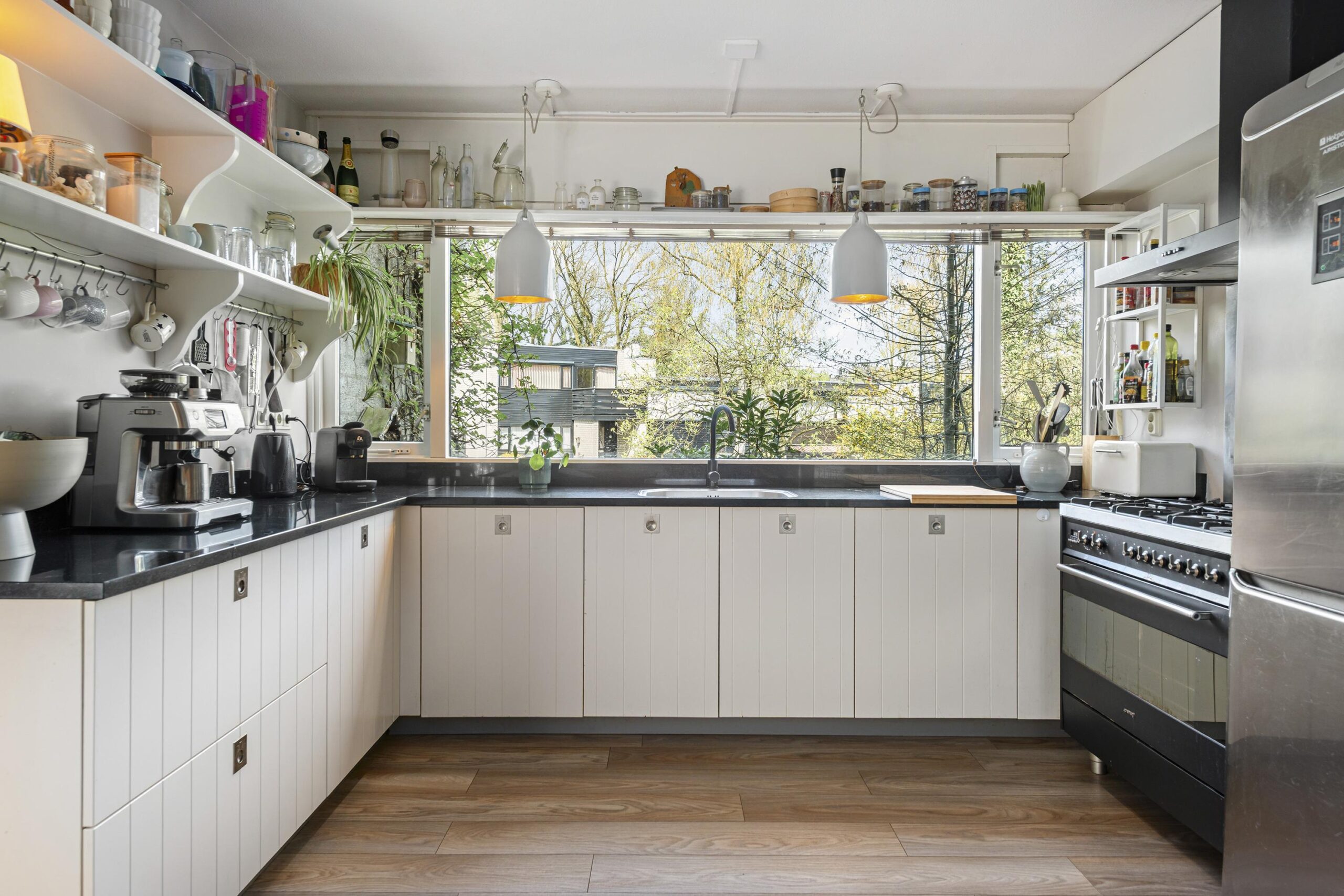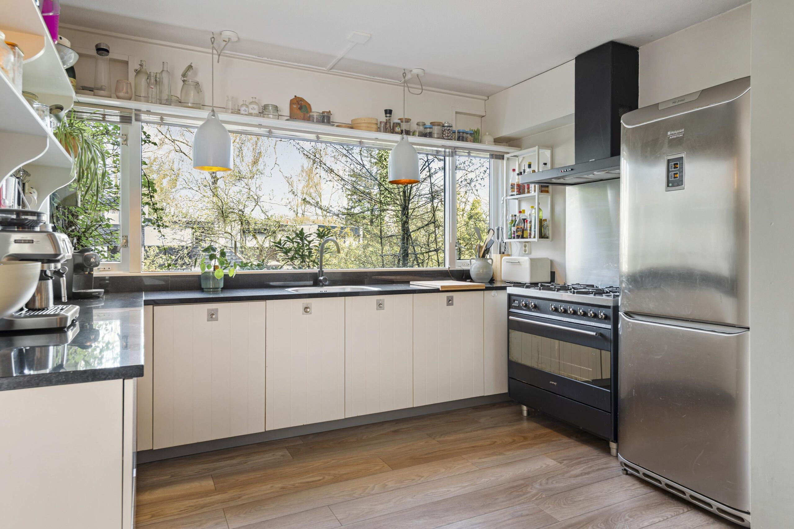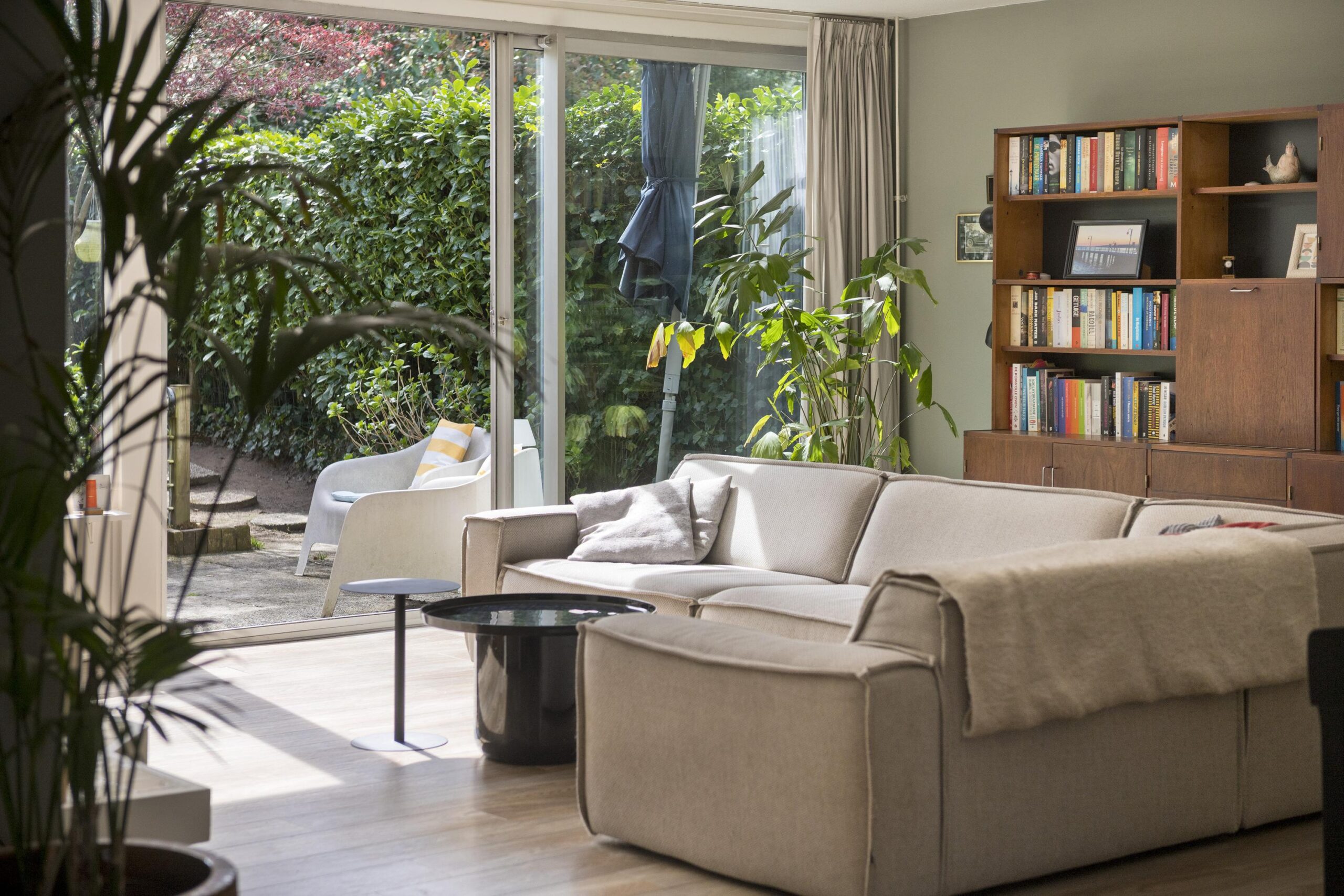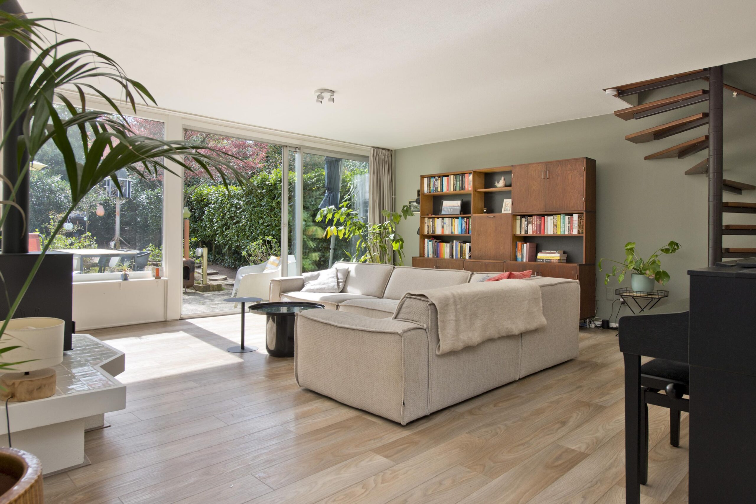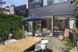 De lichte, tuingerichte woonkamer met schuifpui vormt het hart van de woning en biedt direct toegang tot de zonnige, circa 11,5 meter diepe achtertuin op het zonnige zuiden. De open keuken is voorzien van een eigentijdse inbouwkeuken. Vanuit de keuken bereikt u via een inloopkast, waar tevens de hybride warmtepomp is geplaatst, middels een molenaarstrap het praktische souterrain, ideaal voor opslag of hobbyruimte.