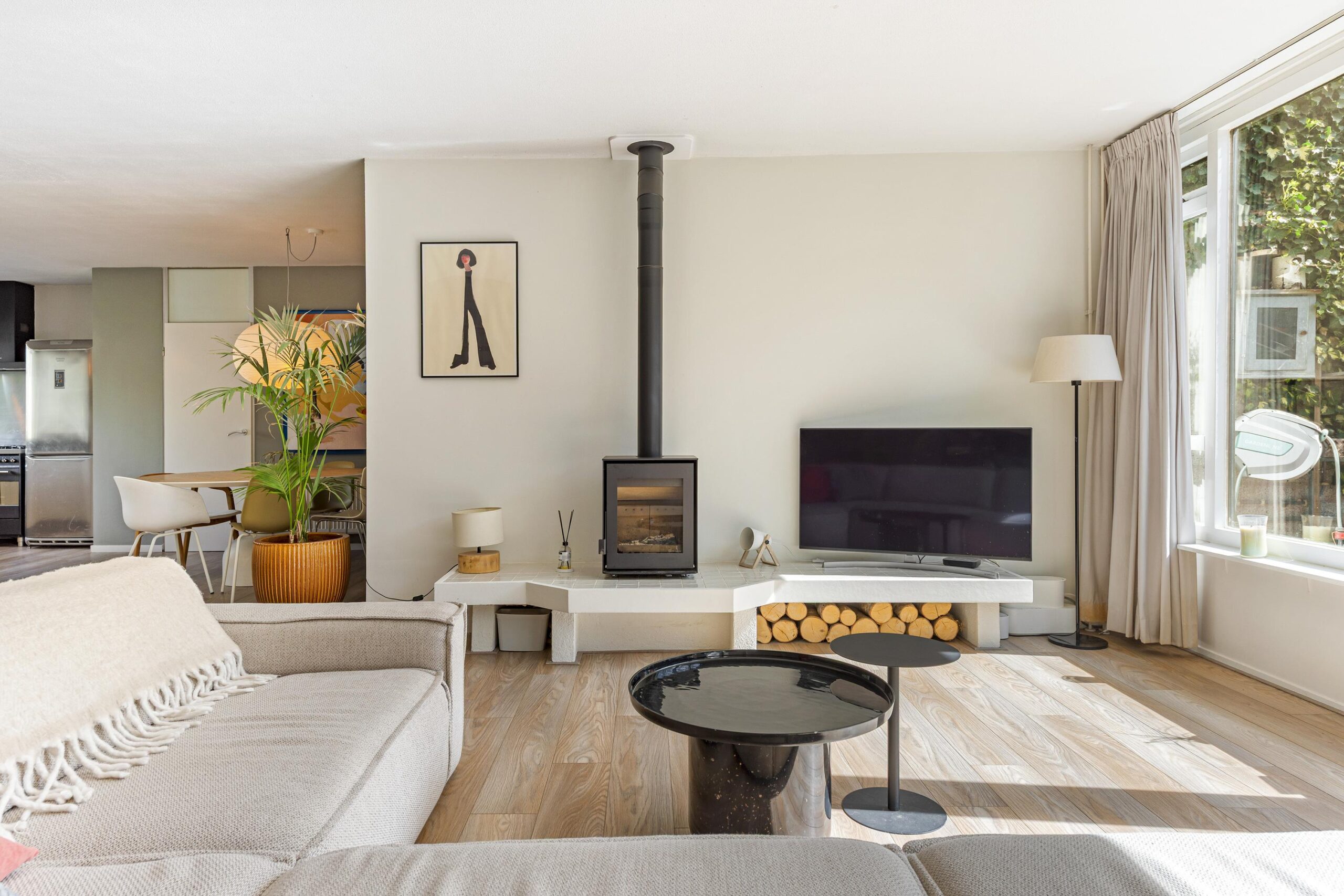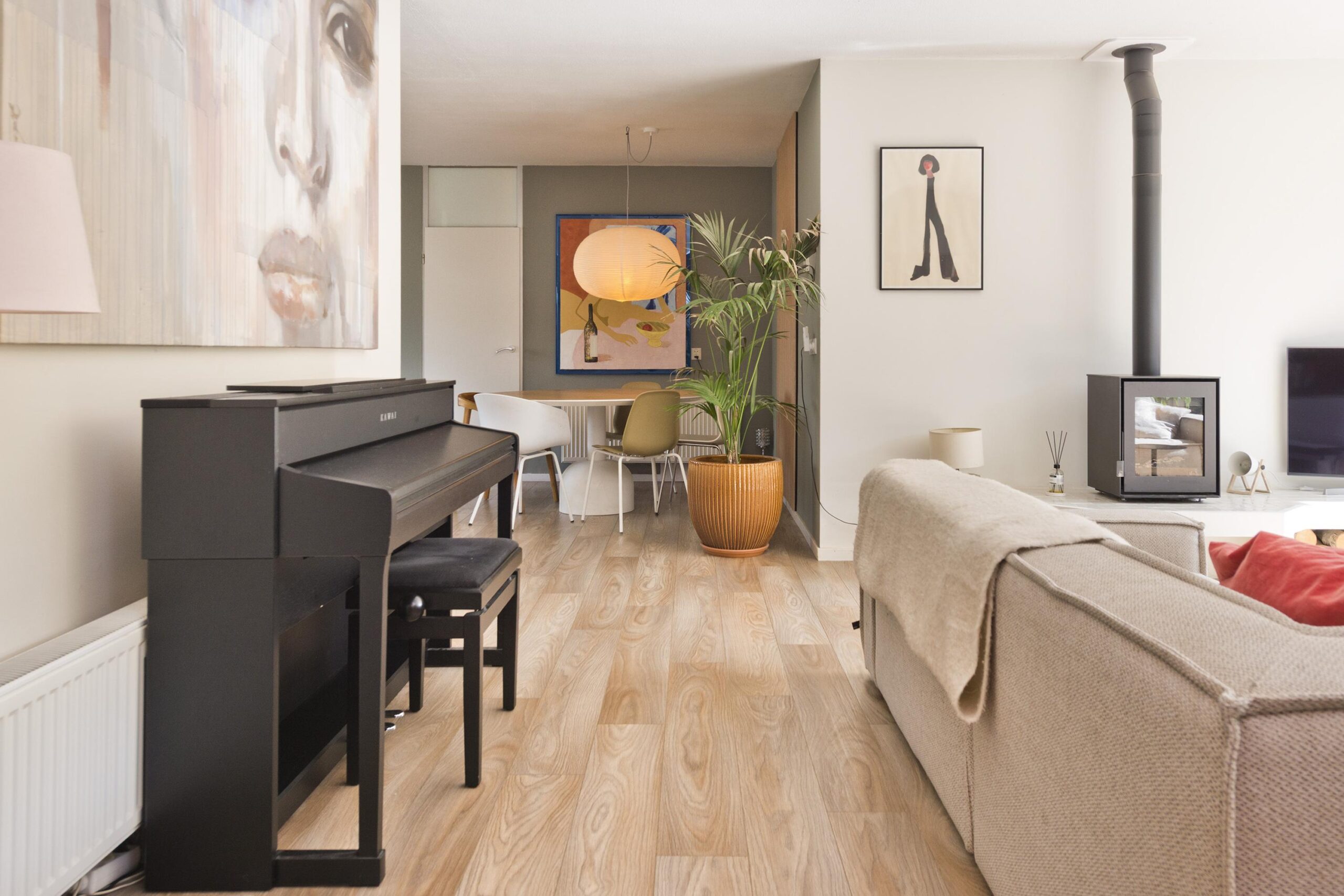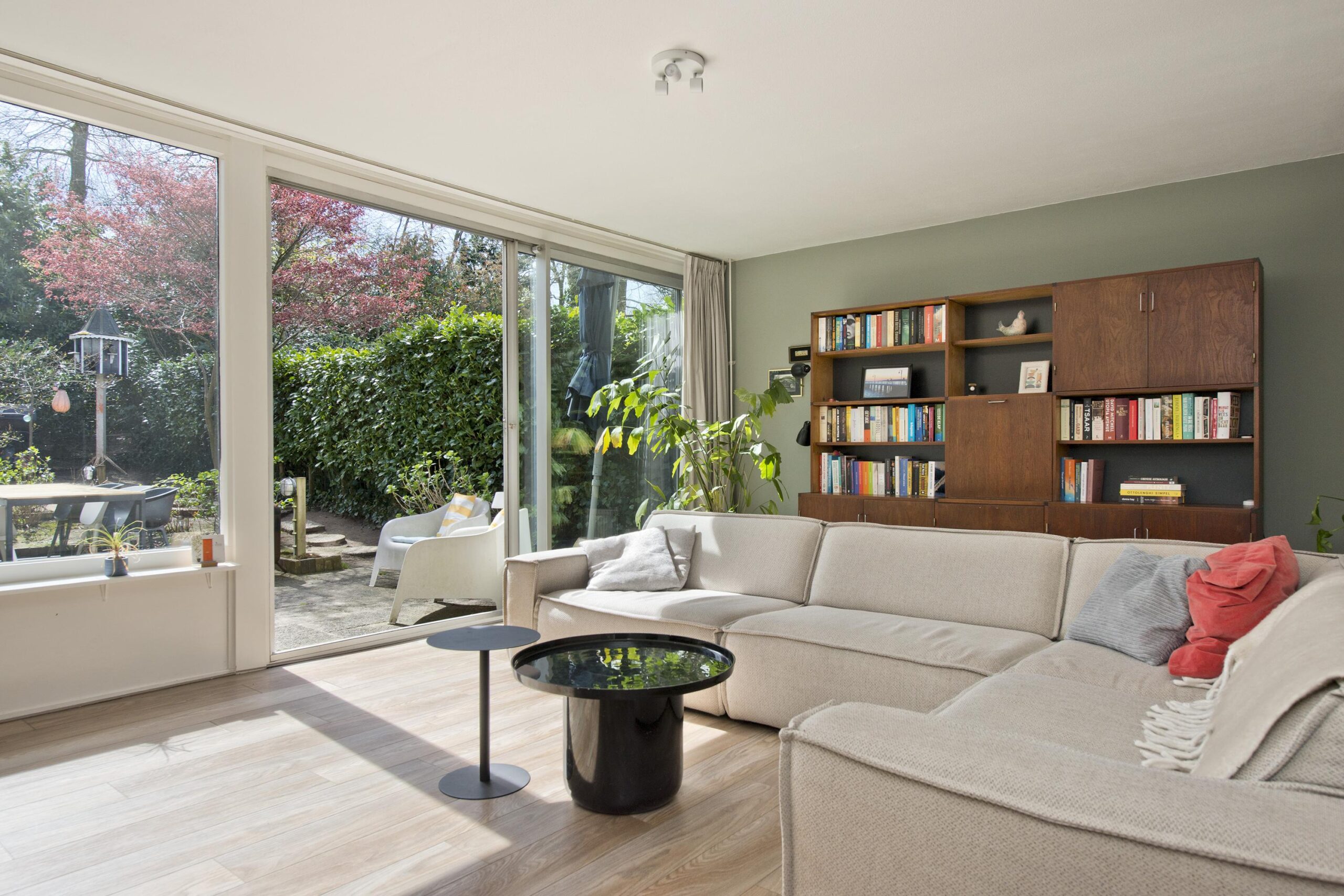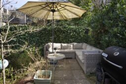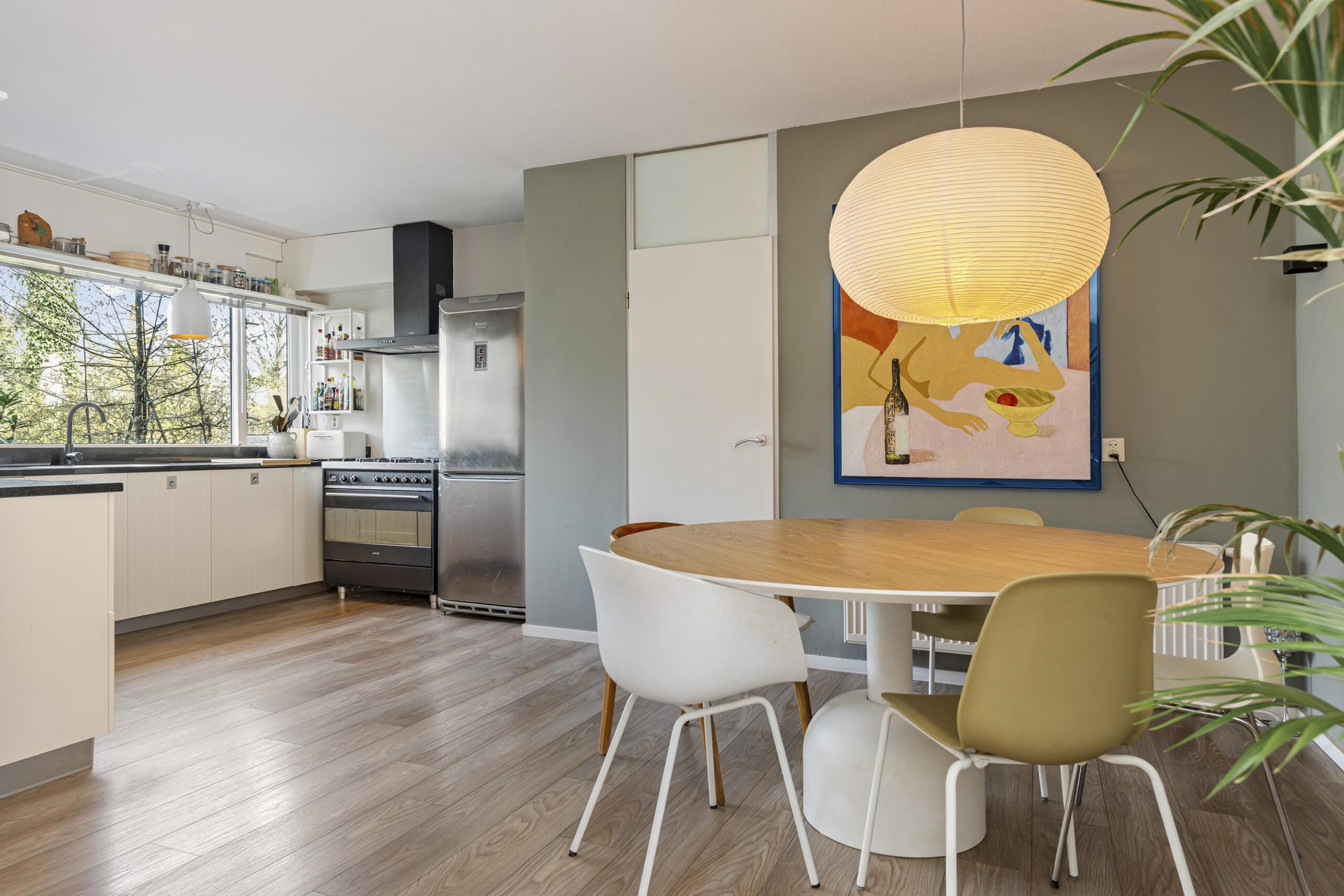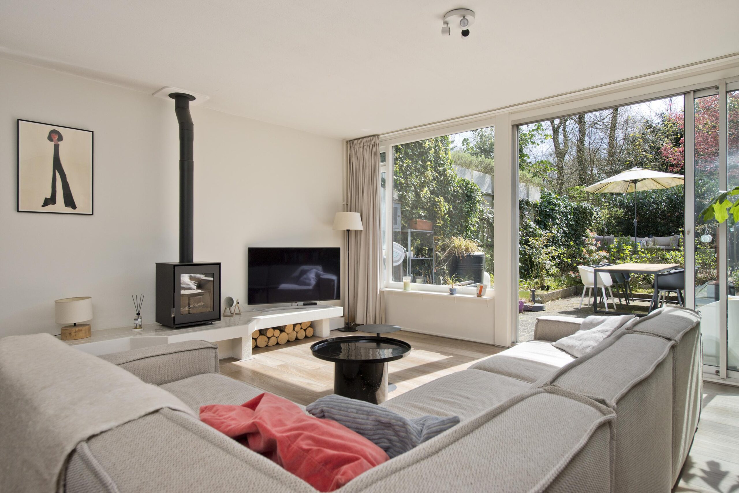 De lichte, tuingerichte woonkamer met schuifpui vormt het hart van de woning en biedt direct toegang tot de zonnige, circa 11,5 meter diepe achtertuin op het zonnige zuiden. De open keuken is voorzien van een eigentijdse inbouwkeuken. Vanuit de keuken bereikt u via een inloopkast, waar tevens de hybride warmtepomp is geplaatst, middels een molenaarstrap het praktische souterrain, ideaal voor opslag of hobbyruimte.