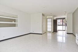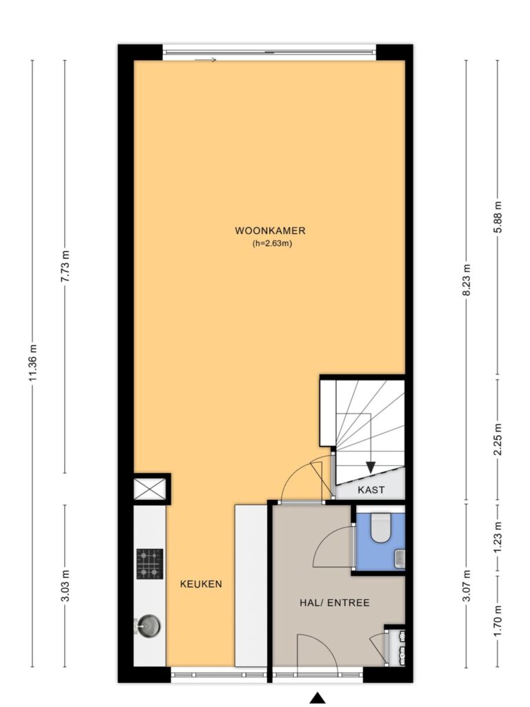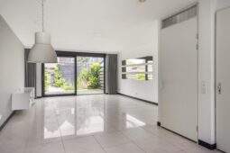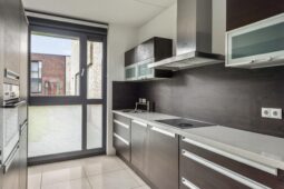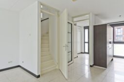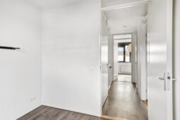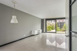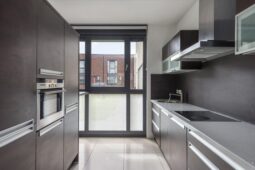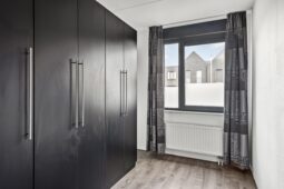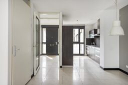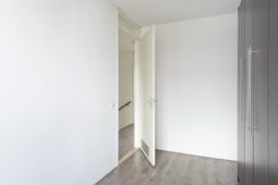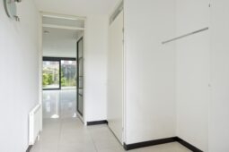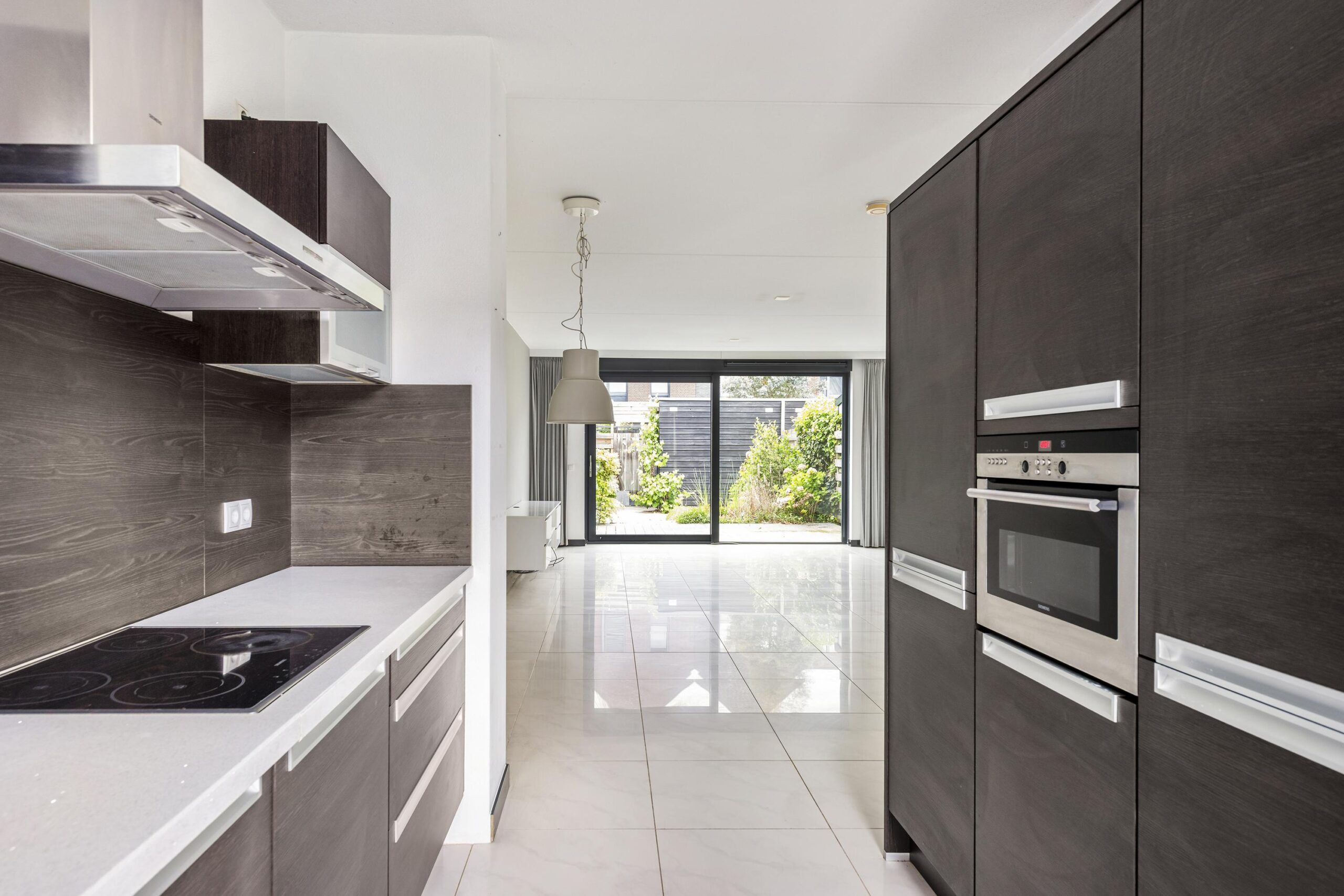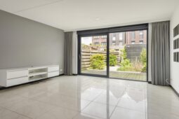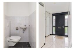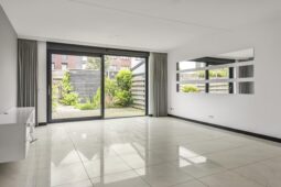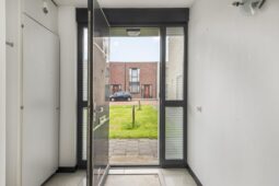 Begane grond: binnenkomst in de ruime hal met garderobe en een modern toilet met fonteintje. De royale, lichte woonkamer beschikt over een praktische trapkast, stijlvolle grote vloertegels en een schuifpui naar de tuin die zorgt voor veel natuurlijk licht. Aan de voorzijde vind je de eethoek en een moderne open keuken met een strak werkblad, veel opbergruimte en complete inbouwapparatuur: inductiekookplaat, RVS afzuigkap, koelkast, vriezer en vaatwasser. De hele begane grond is voorzien van comfortabele vloerverwarming.