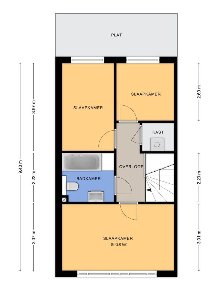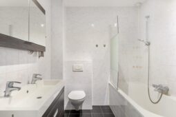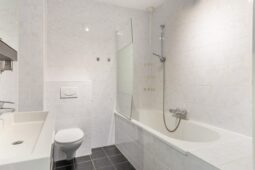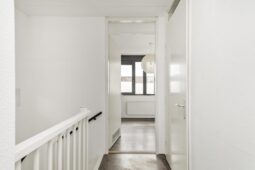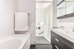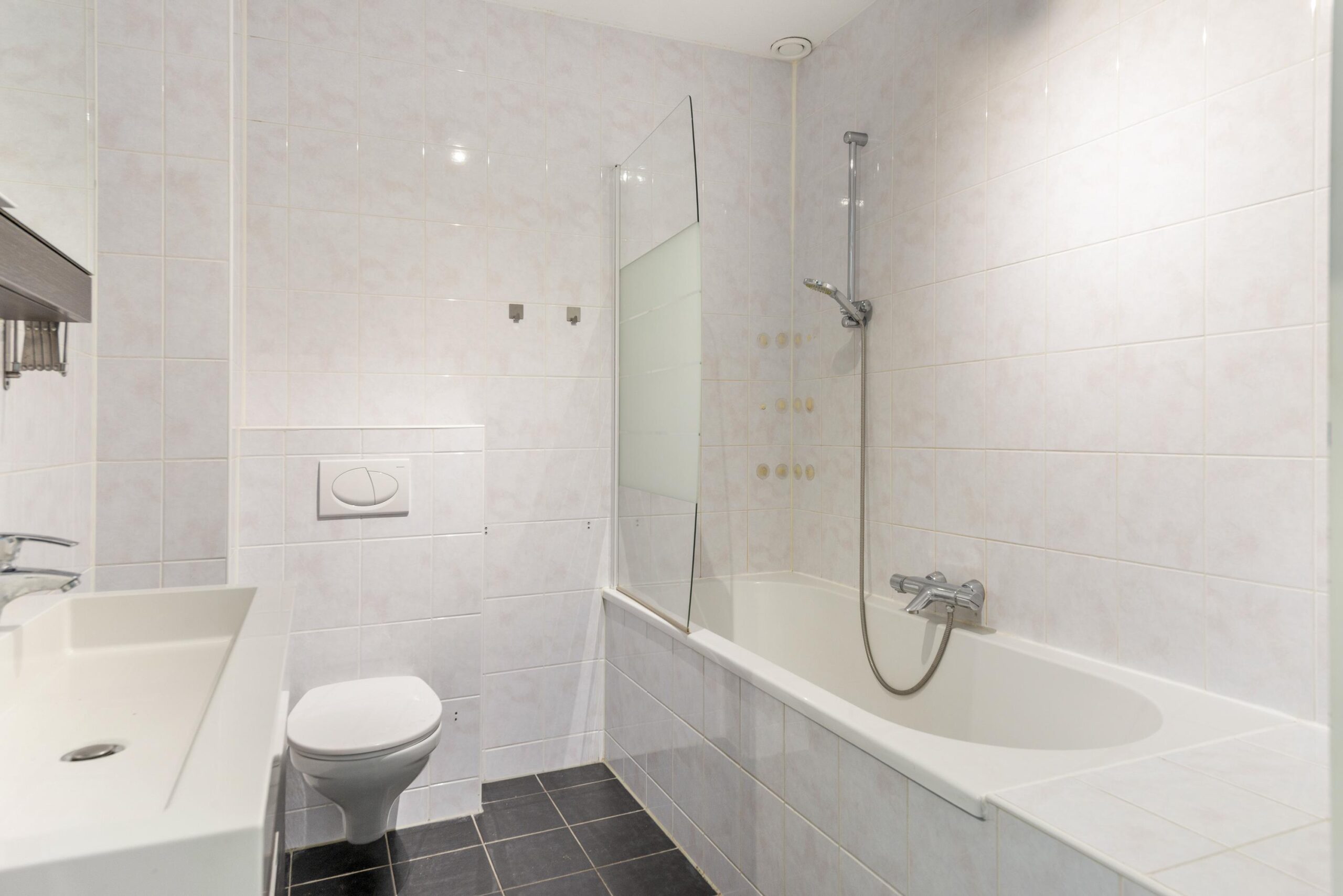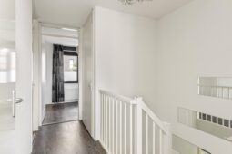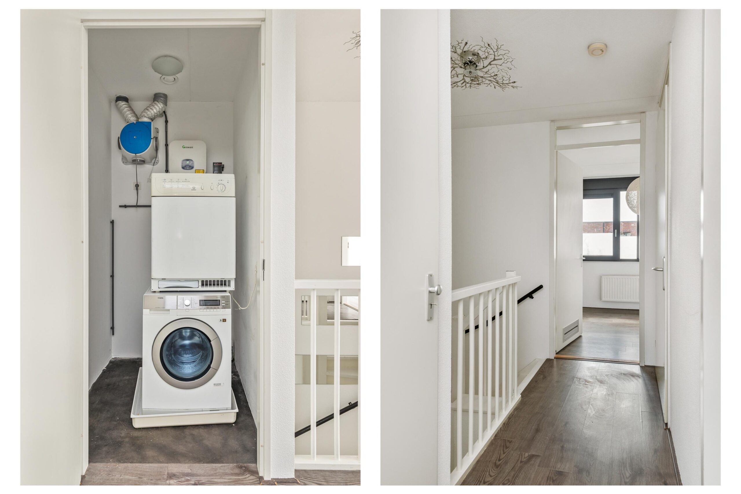 Eerste verdieping: overloop met toegang tot drie lichte slaapkamers, een aparte wasruimte en een nette badkamer. De badkamer beschikt over een tweede toilet, een wastafelmeubel met dubbele kraan en een bad-/douchecombinatie. De hoofdslaapkamer aan de voorzijde is maar liefst 15 m² en biedt volop ruimte.