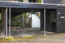 Voortuin met eigen oprit en carport, houten (fietsen)berging met elektra en pad naar de voordeur.