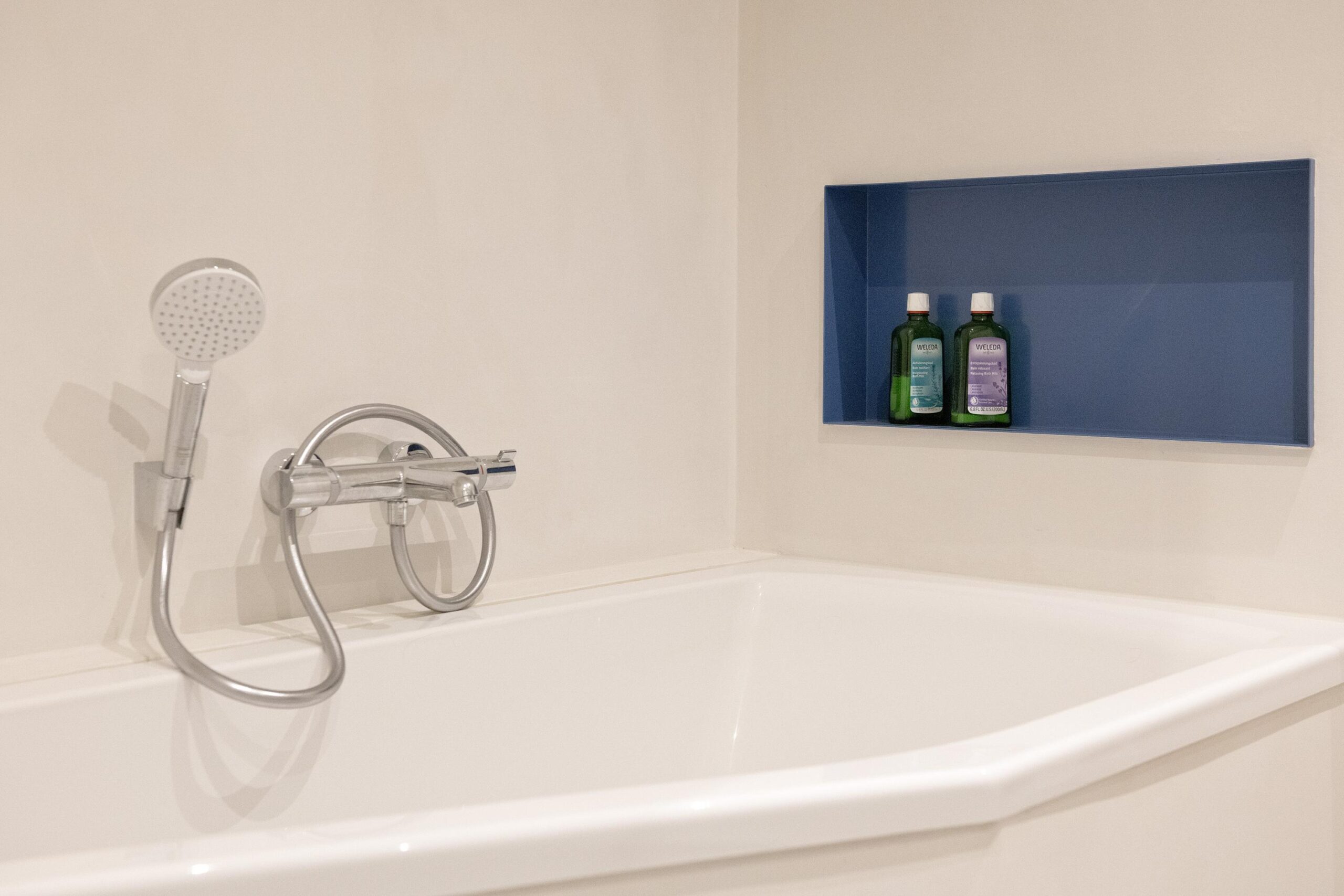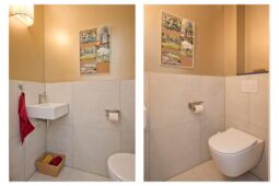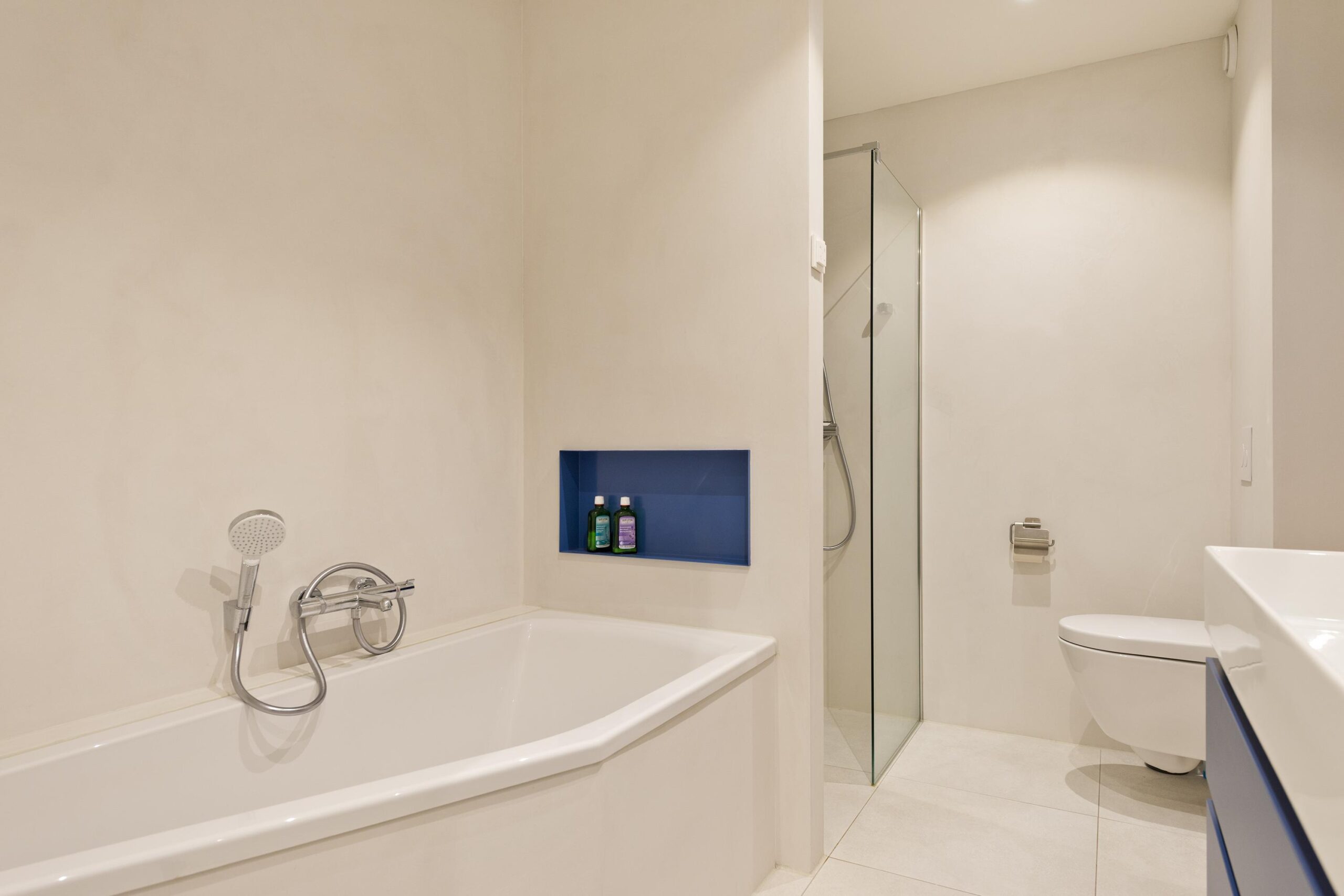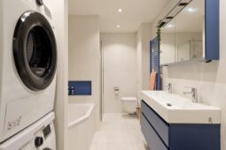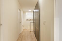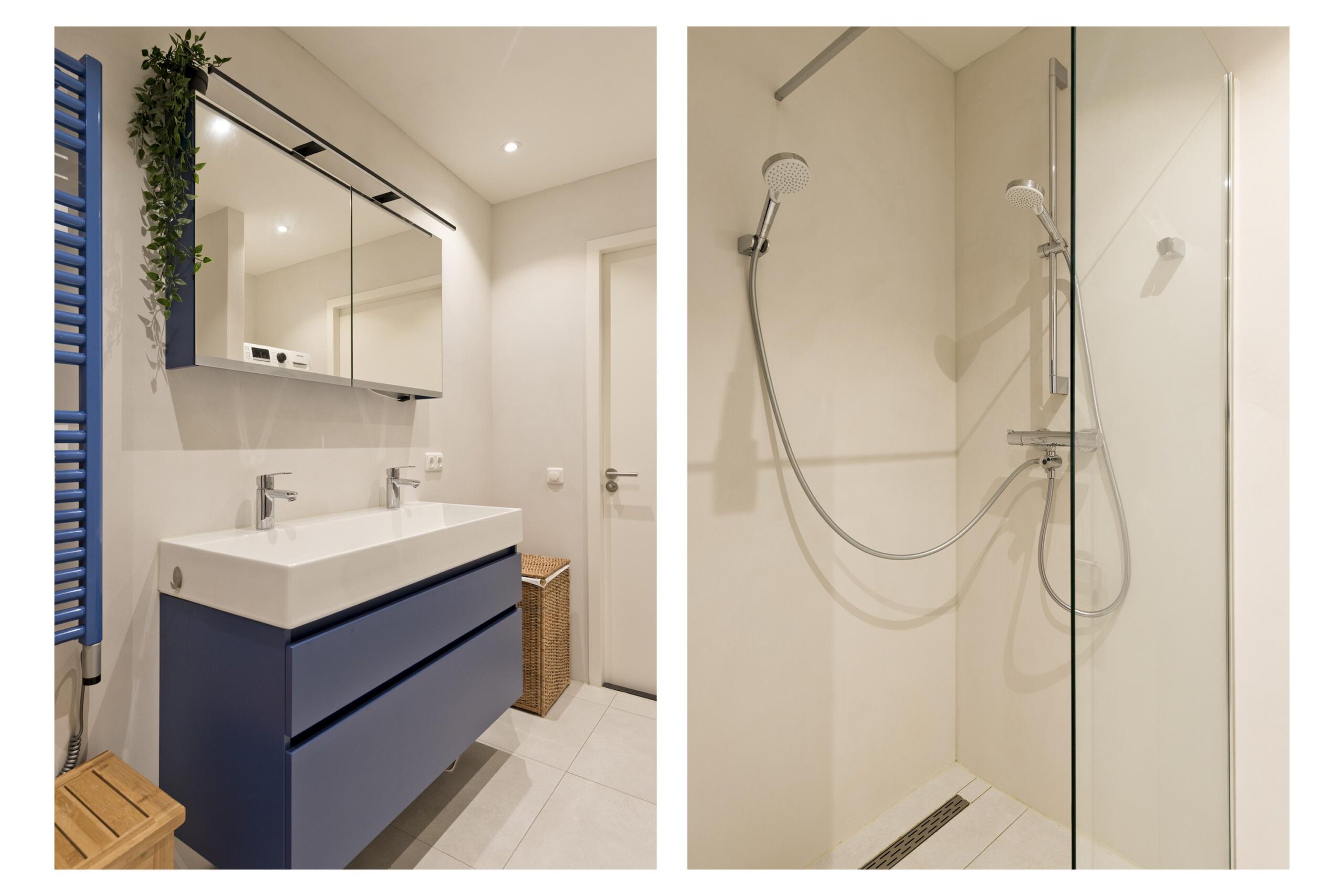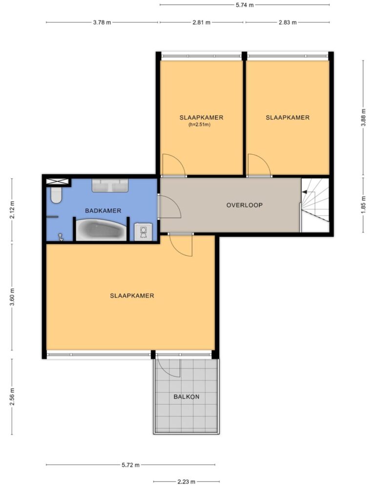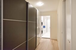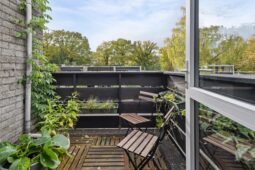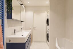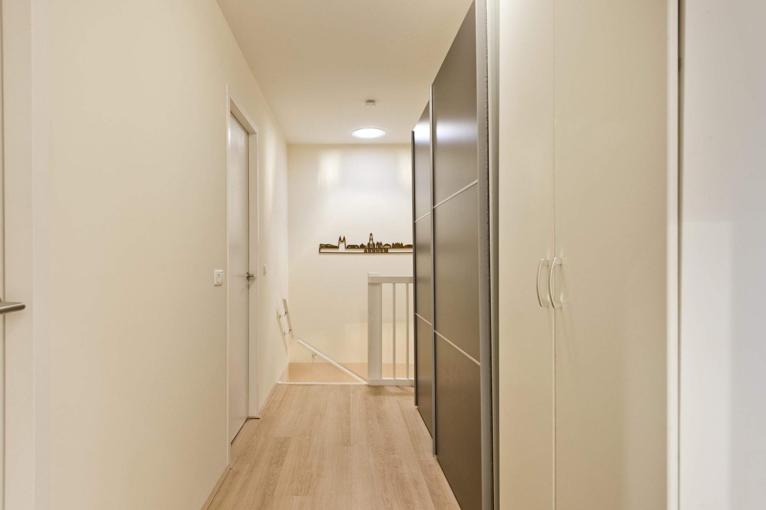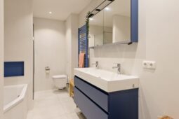 Overloop, moderne badkamer met inloopdouche, ligbad, toilet, wastafelmeubel en aansluiting voor wasapparatuur. Drie ruime slaapkamers, waaronder een royale ouderslaapkamer met toegang tot een eigen balkon.