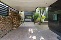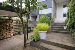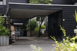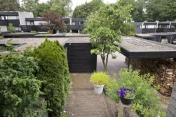 Parkeren doe je op eigen terrein onder de carport. Daarnaast vind je hier een vrijstaande houten (fietsen)berging met elektra, een eigen entree naar het souterrain én de hoofdentree van de woning.