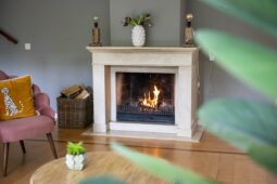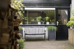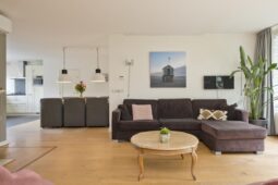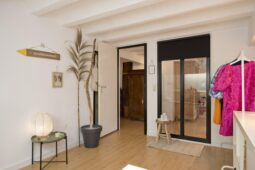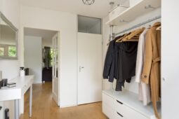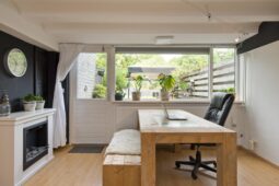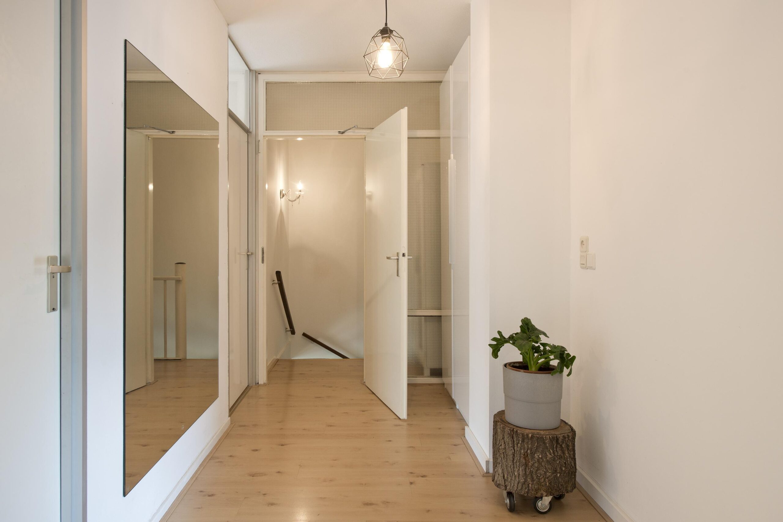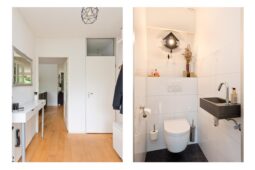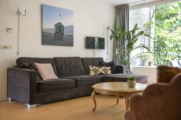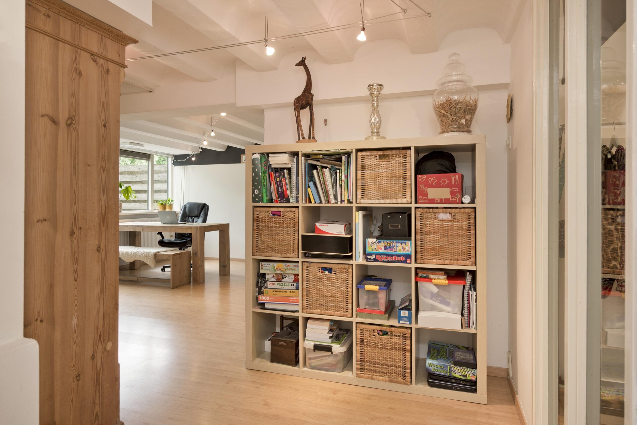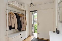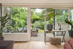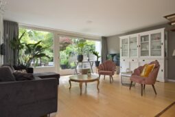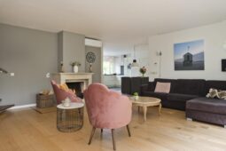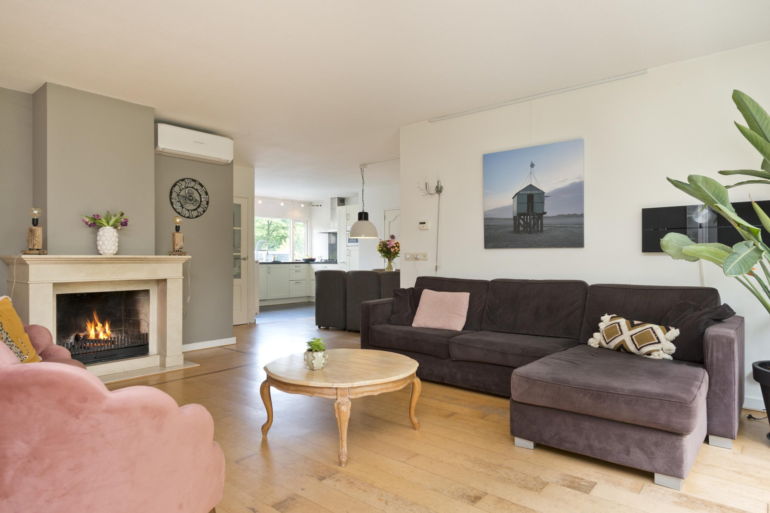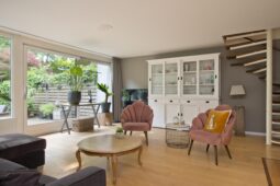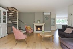 Ruime en lichte hal met toilet en garderobe, doorlopend naar de royale woonkamer op tuinniveau. De open haard zorgt voor extra sfeer, en via de schuifpui stap je zo de diepe, zonnige en fraai aangelegde achtertuin in met tuinhuis.