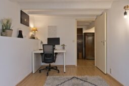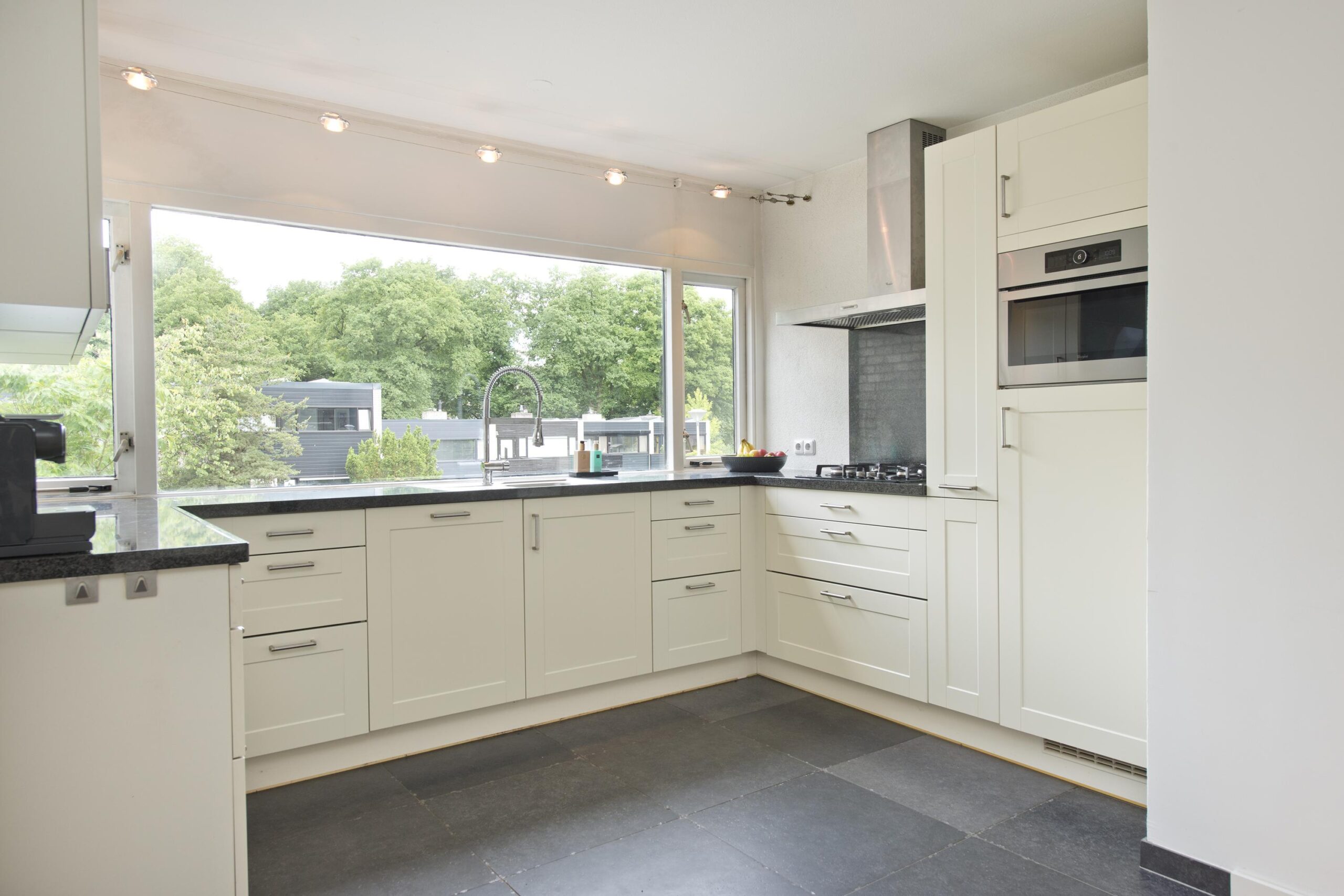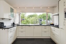 De moderne keuken aan de voorzijde biedt niet alleen veel werk- en bergruimte, maar ook een mooi uitzicht over het rustige “cluster” plein. Een vaste trap leidt naar het zeer ruime souterrain.