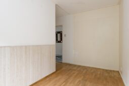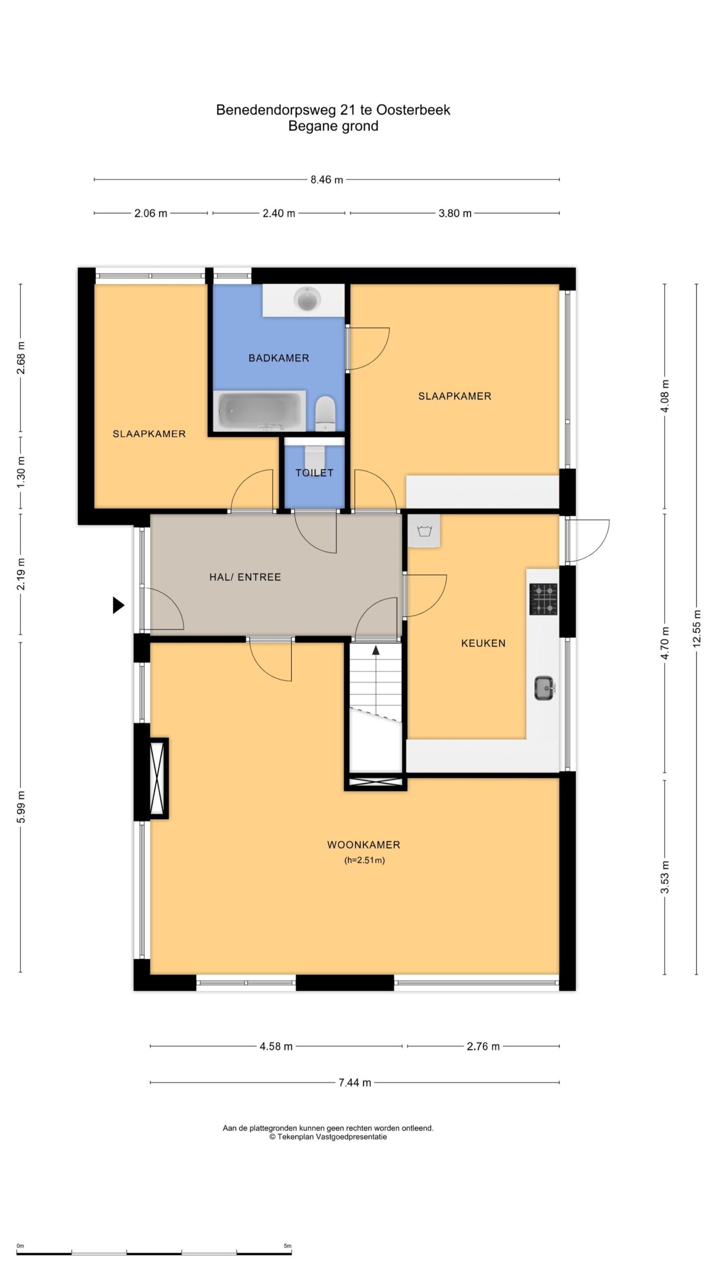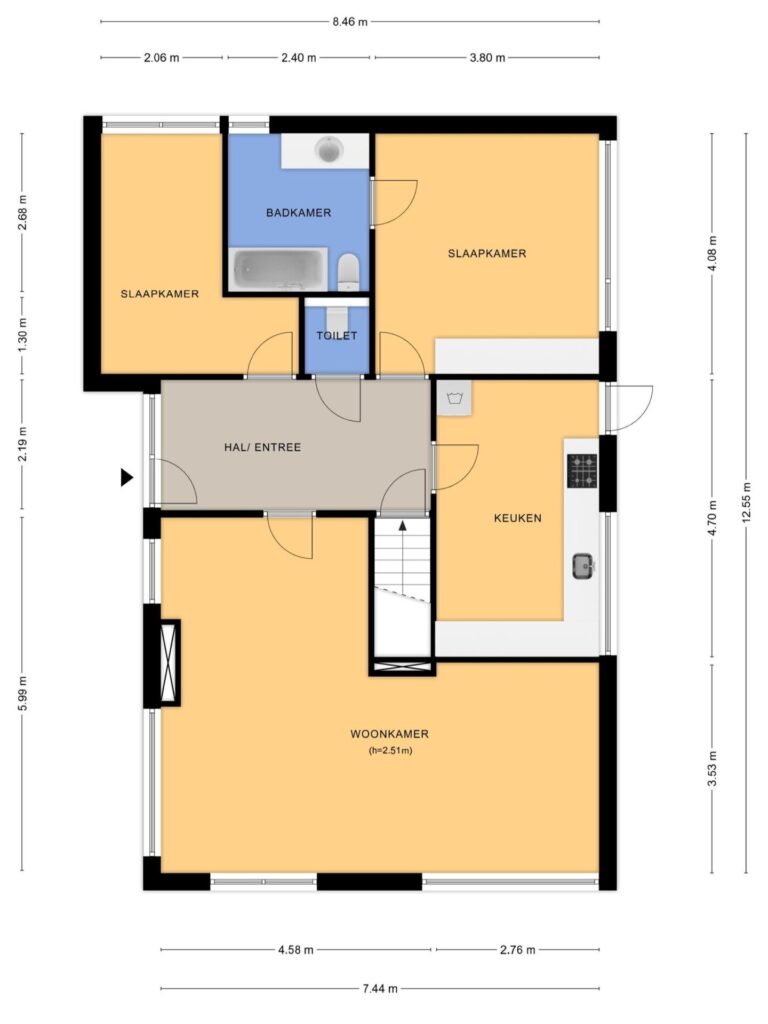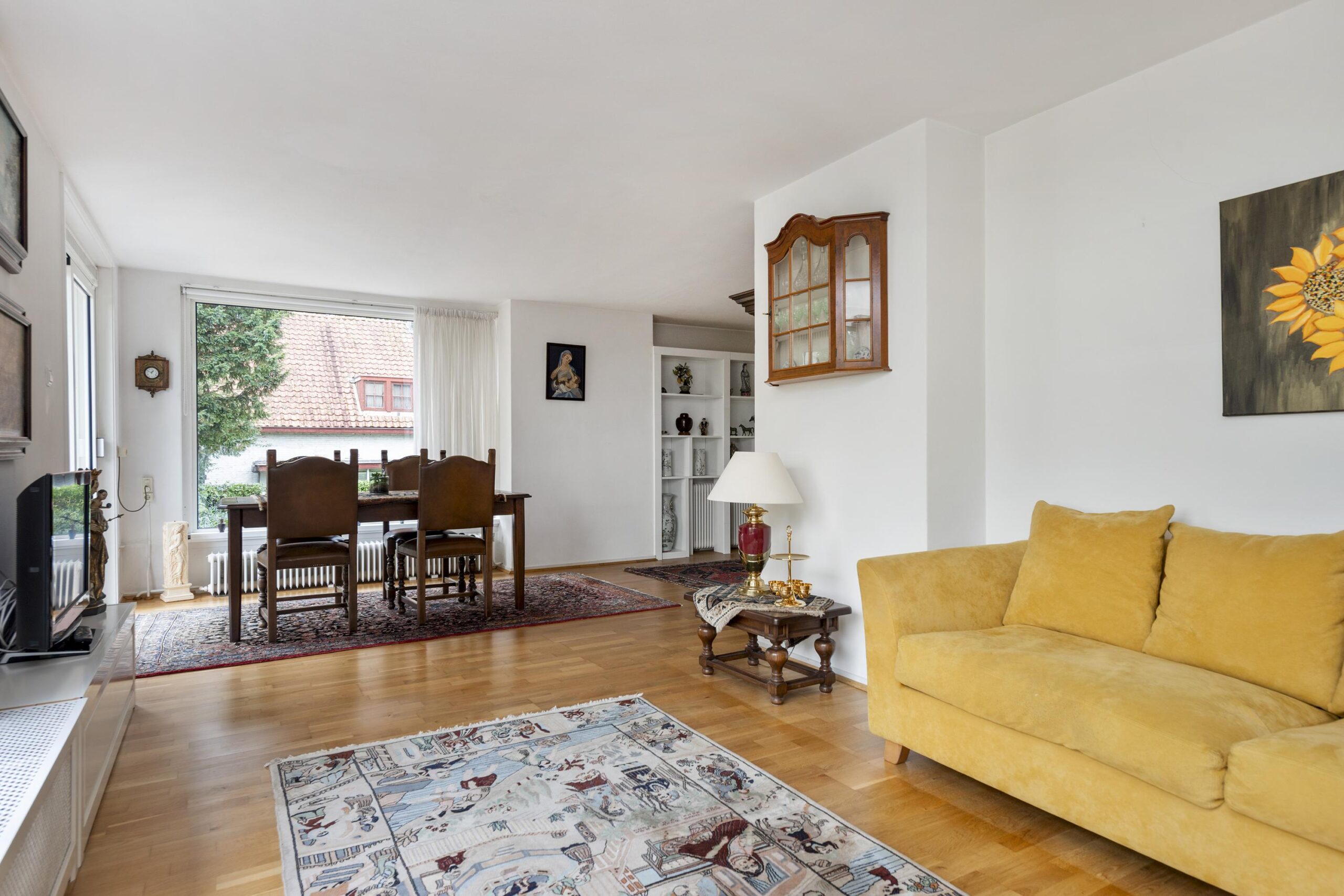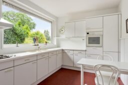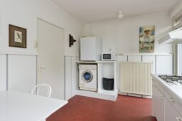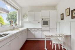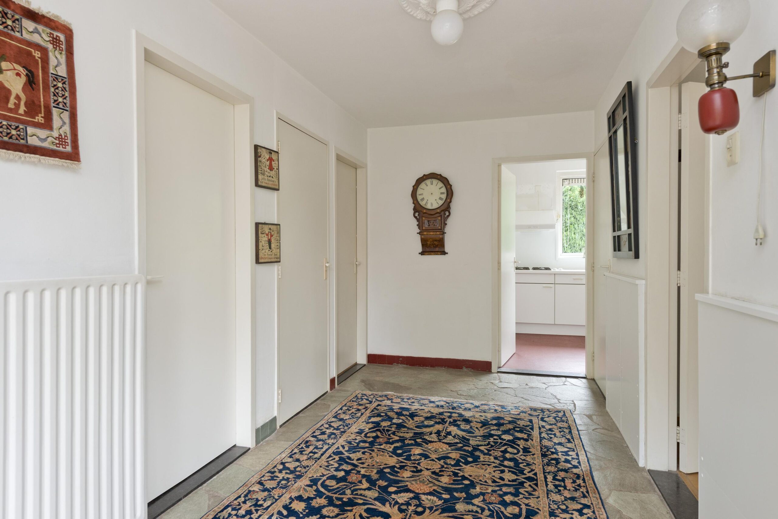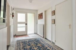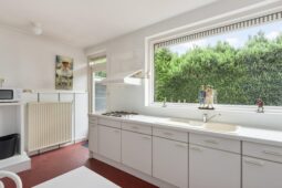 Entree, royale hal met toilet. Aansluitend een lichte woonkamer met schuifpui naar de zonnige tuin. De aangrenzende keuken biedt eveneens toegang tot de tuin en de achtergelegen berging.