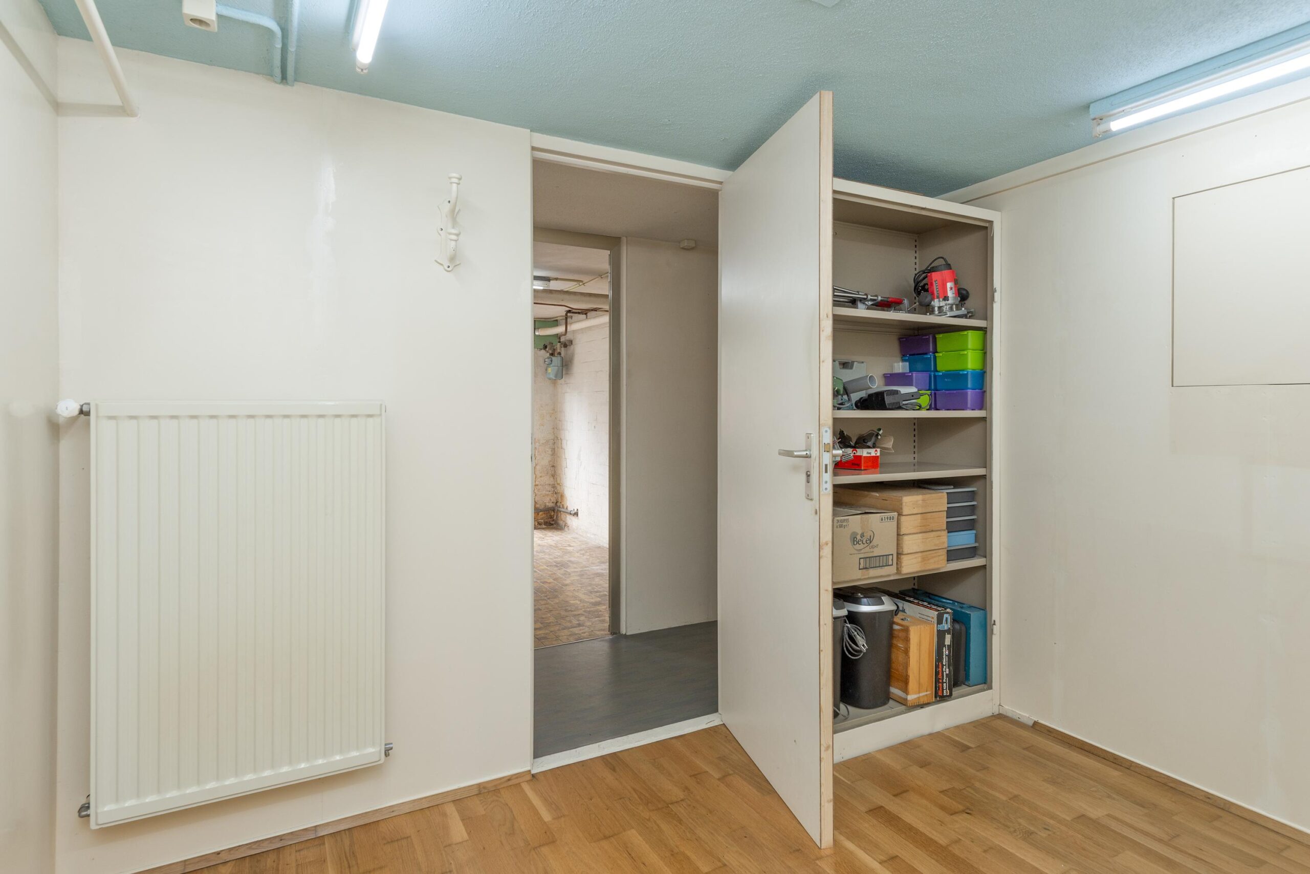 Vanuit de hal bereikt u het souterrain met praktische bergruimte (inclusief cv-opstelling) en een extra kamer die ideaal is als werkruimte, hobbyruimte of stalling.
