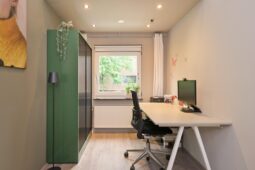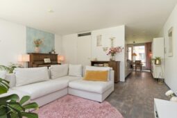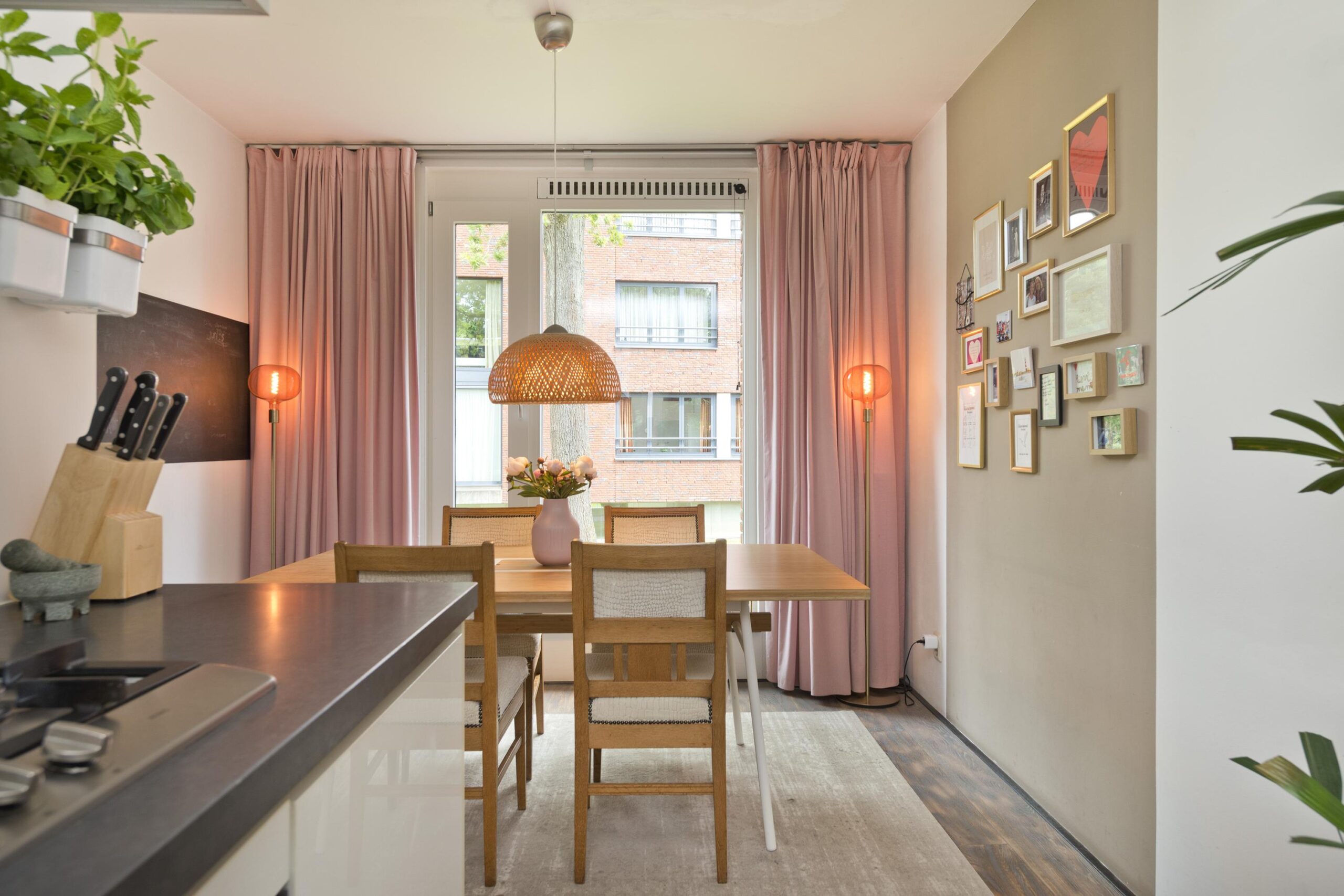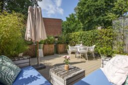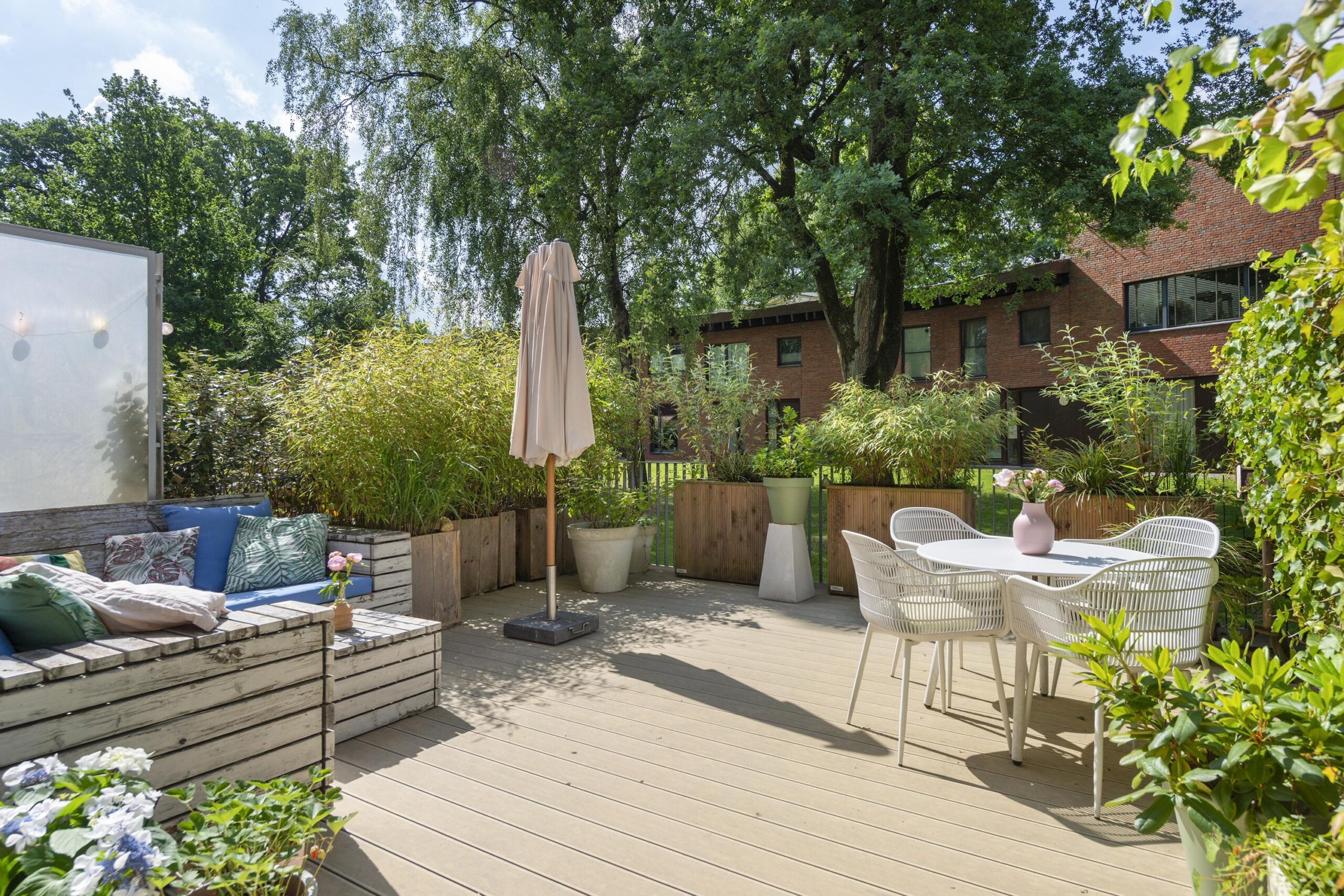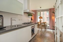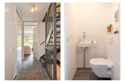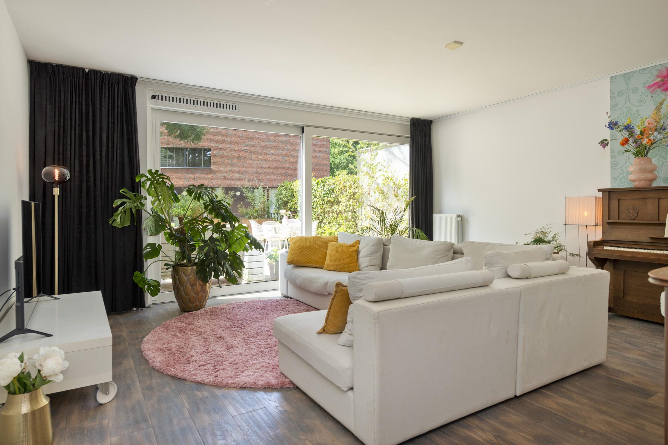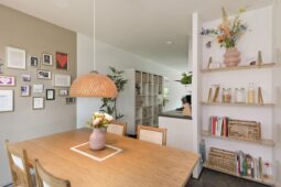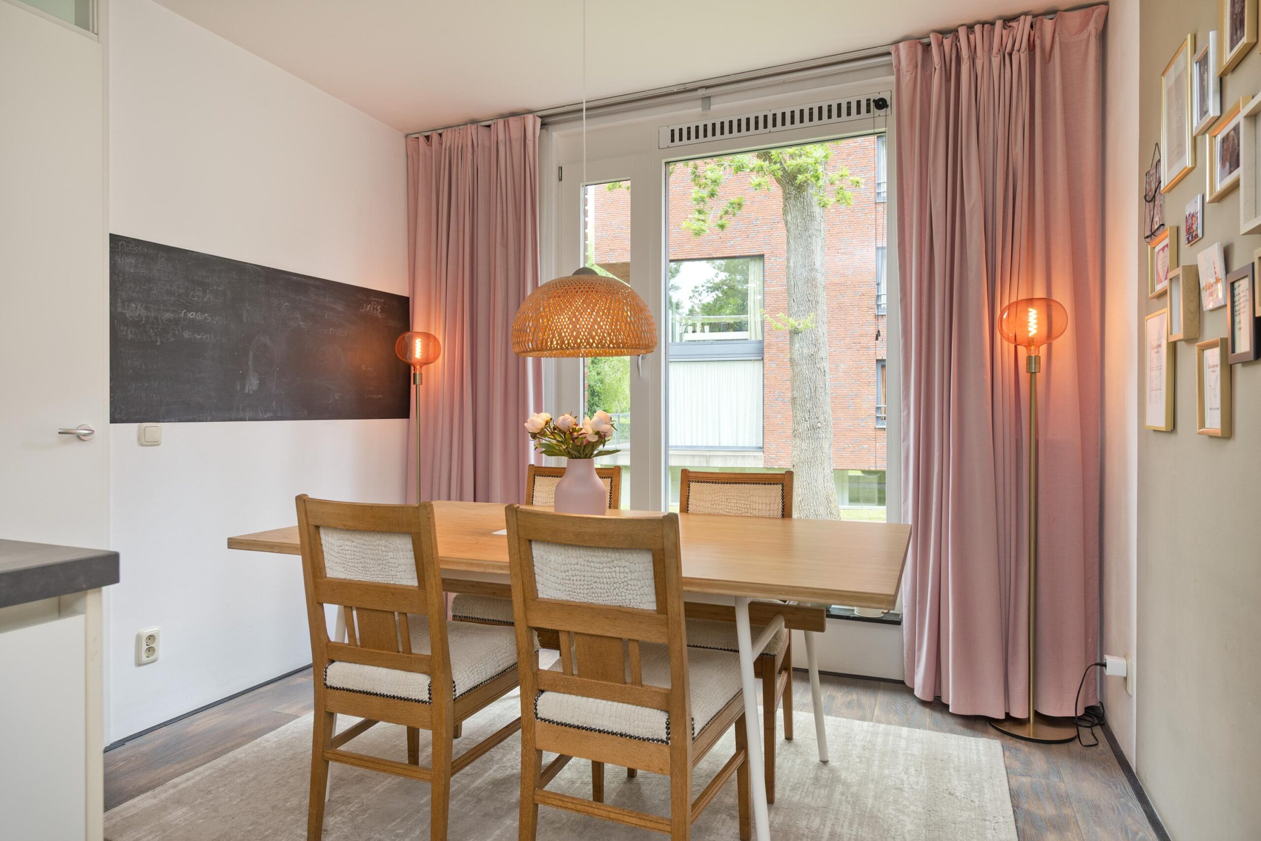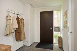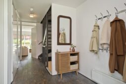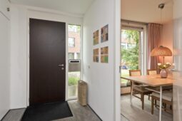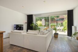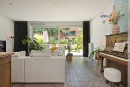 Entree met ruime hal, trappenhuis, moderne meterkast, inbouwkast met HR CV ketel en een toiletruimte met modern wandcloset en fonteintje. De lichte en zonnige woonkamer heeft een schuifpui naar het grote terras op het zuiden. De open keuken is modern uitgevoerd met een tijdloze Siematic inbouwkeuken, voorzien van diverse inbouwapparatuur en een robuust stenen werkblad. Vanuit de keuken is er een directe verbinding met de gezellige eetkamer, die tevens toegang biedt tot de hal.