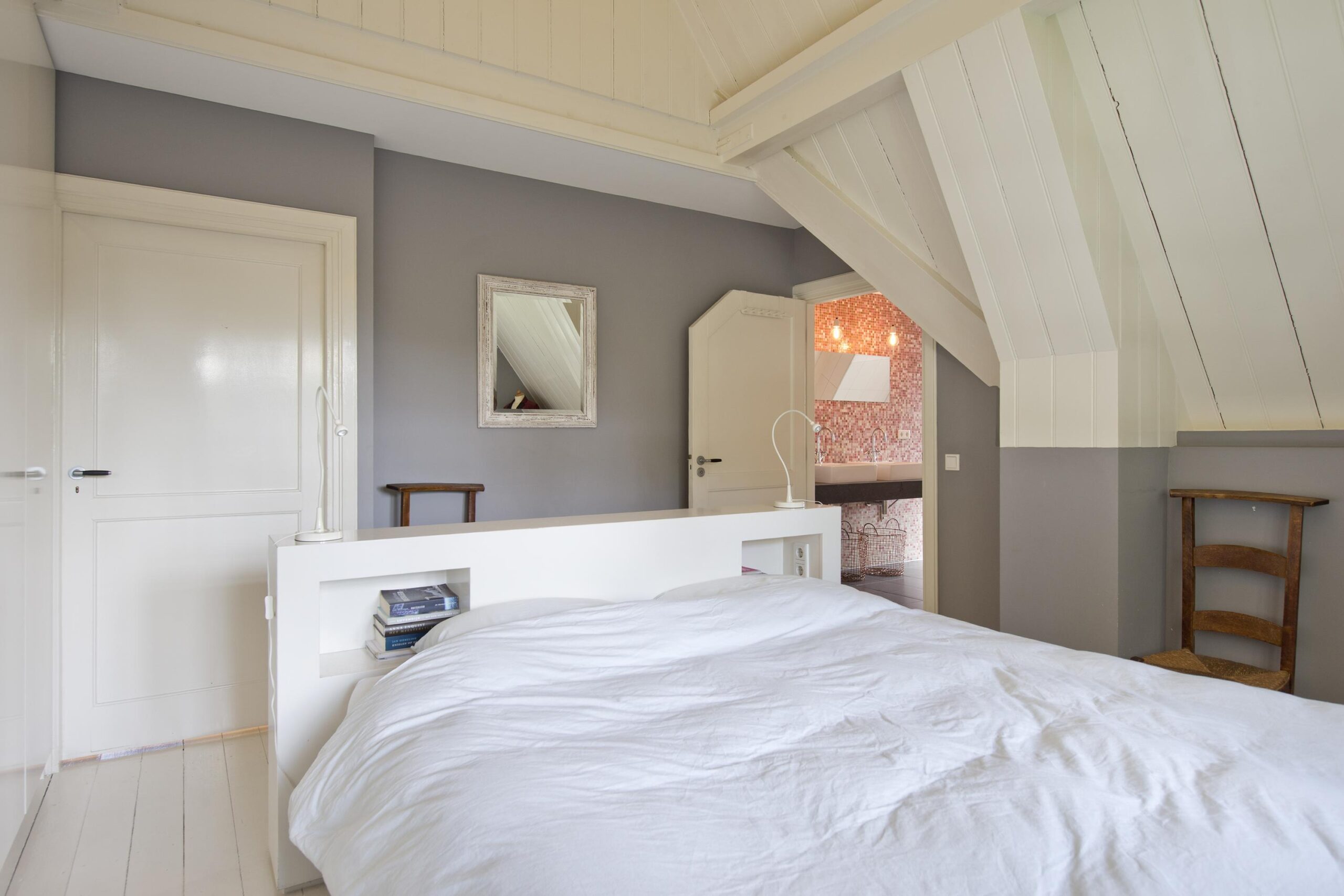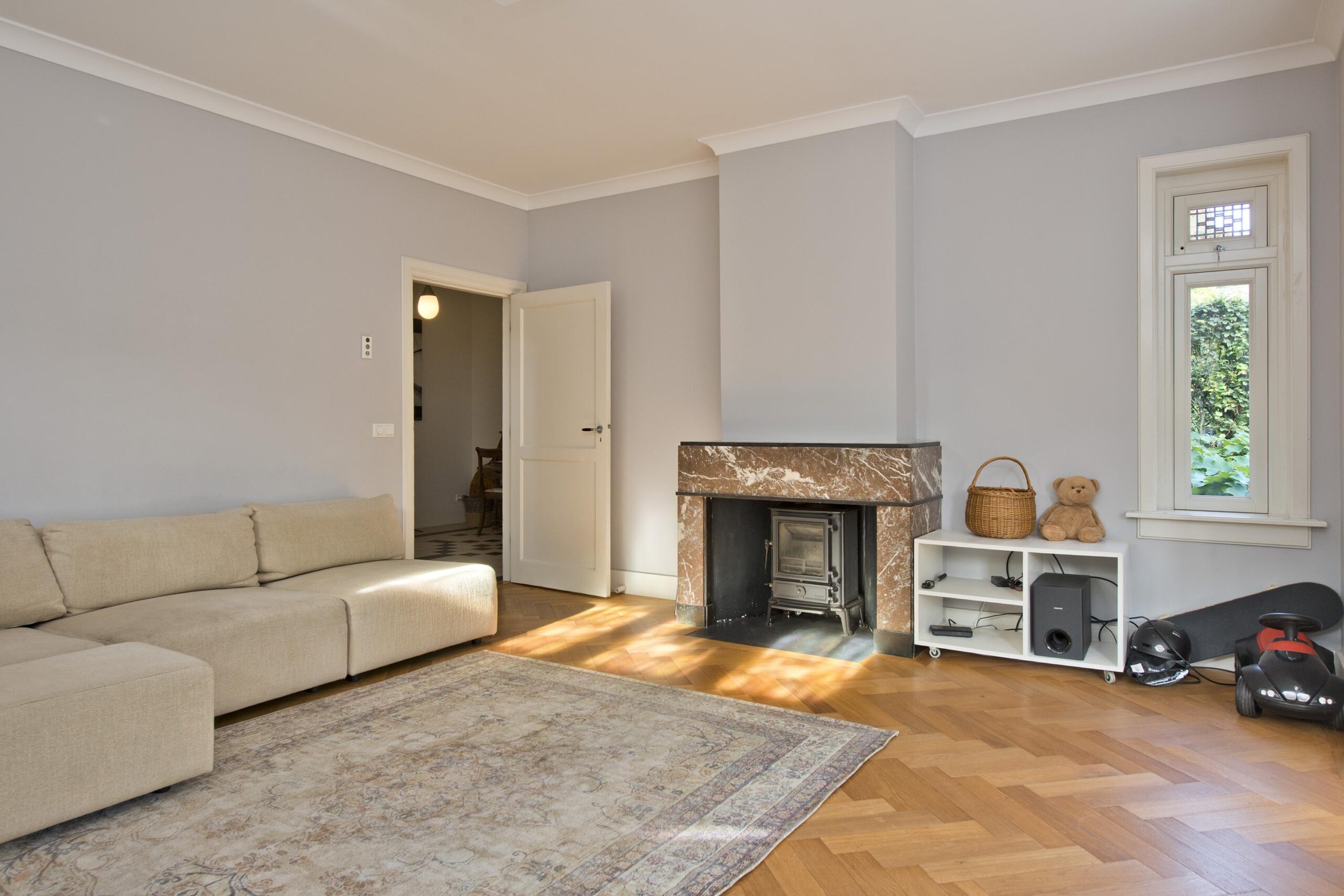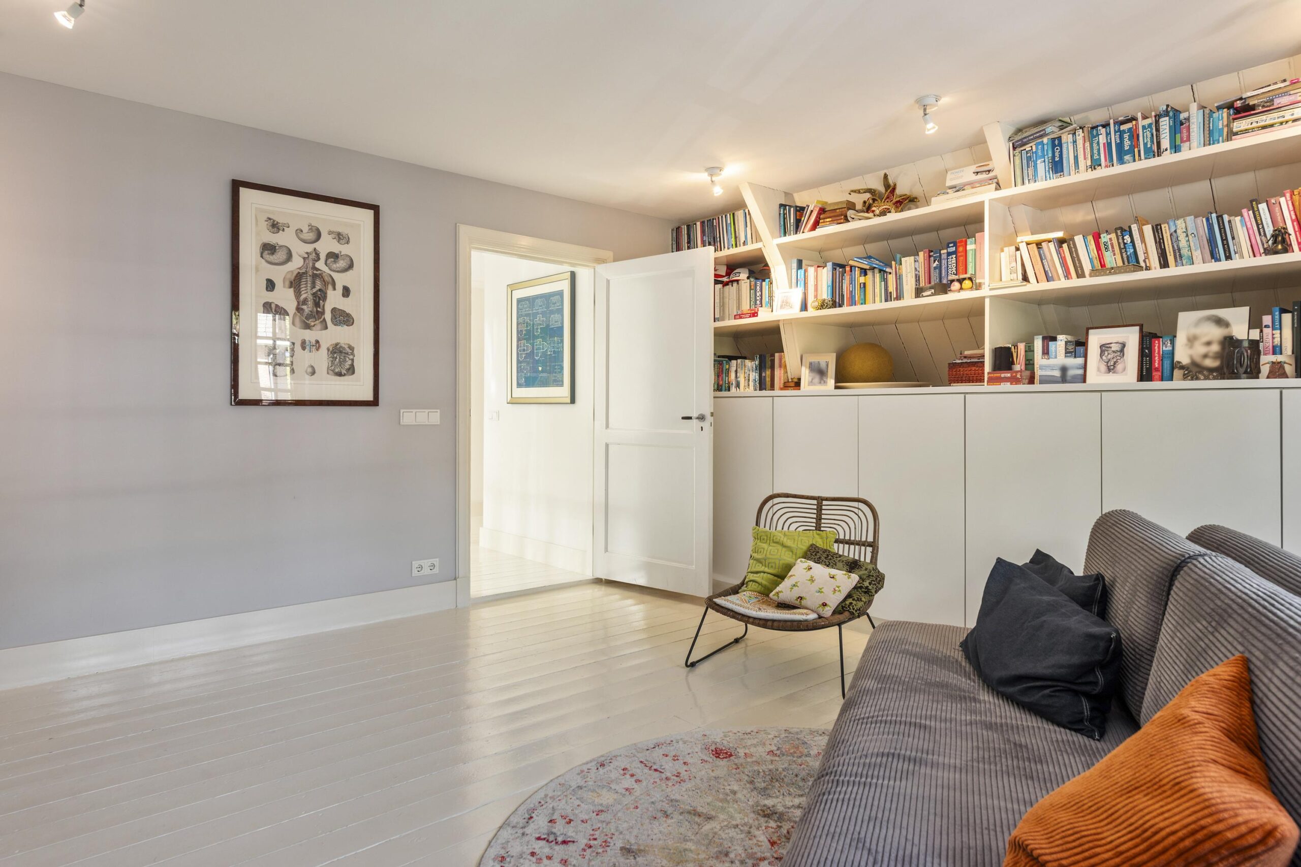 De lichte kamer met functionele houtkachel ligt aan de voorzijde en is ideaal als werk- of speelkamer. De sfeervolle woonkamer met visgraatparket, haard en erker loopt naadloos over in de eetkamer, die eveneens over een haard beschikt. De halfopen keuken grenst aan de eetkamer en biedt toegang tot een praktische bijkeuken en de kelder.