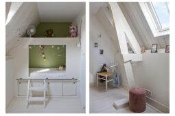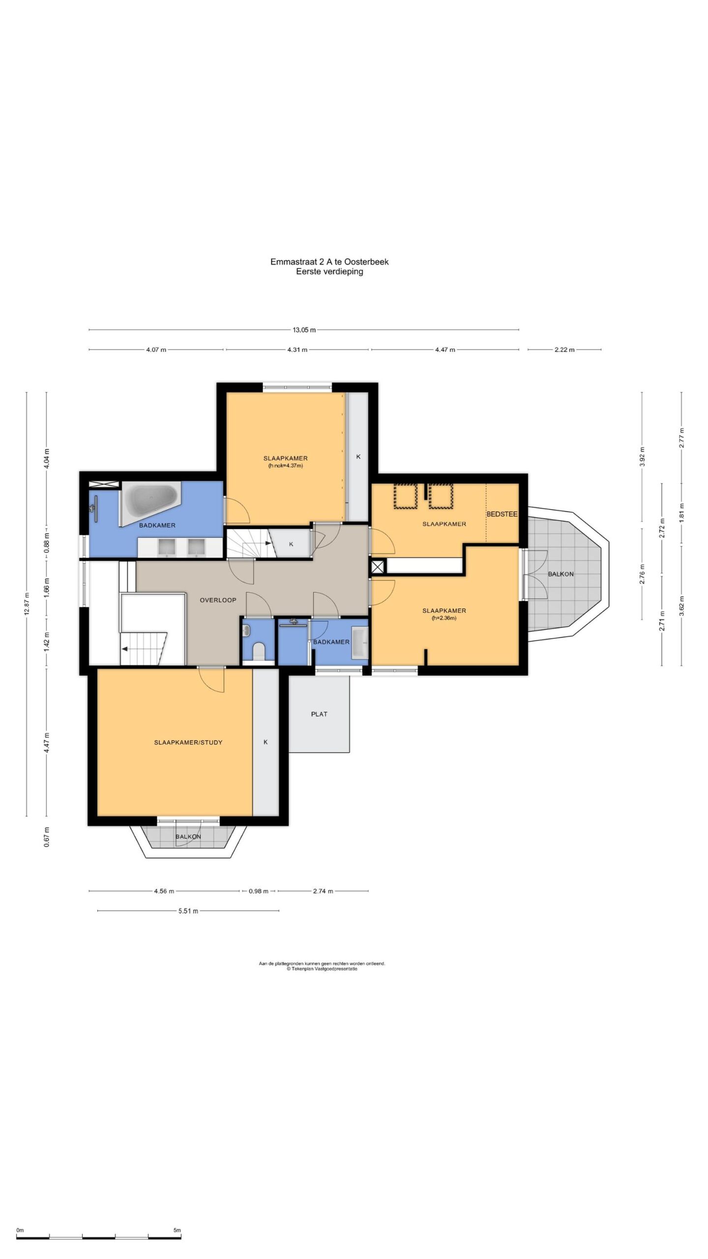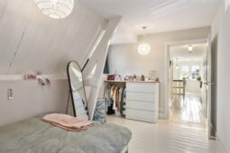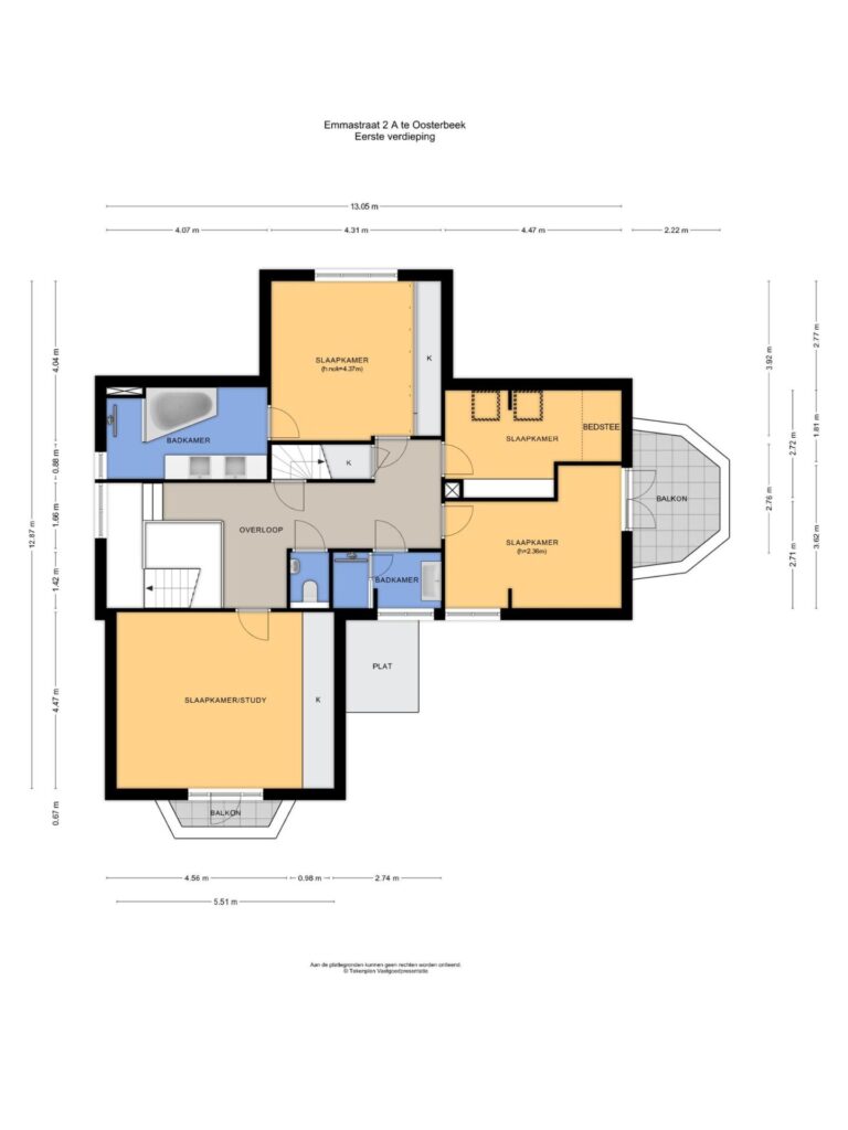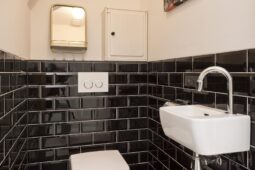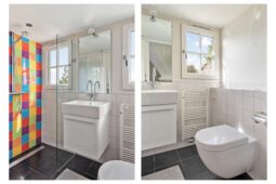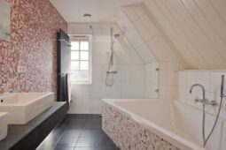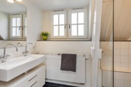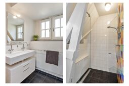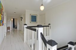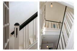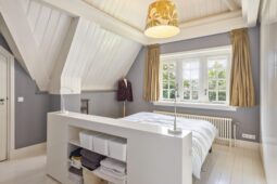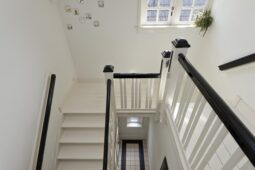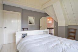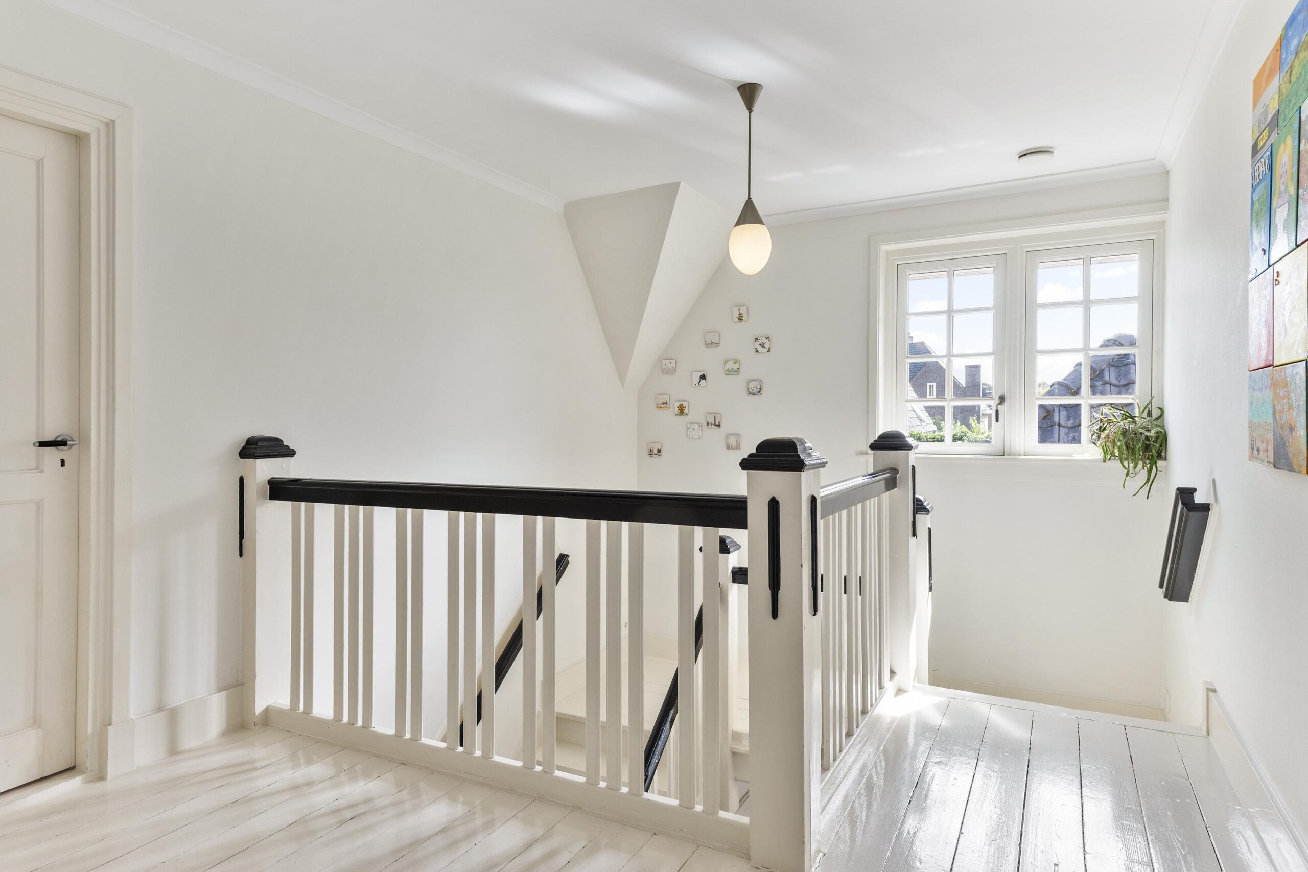 Eerste verdieping: via de originele trapopgang bereikt u de ruime overloop met separaat toilet. Hier bevinden zich vier zeer royale slaapkamers, waarvan twee met toegang tot een eigen balkon. De moderne badkamer op de overloop is voorzien van een inloopdouche en dubbele wastafel. De ouderslaapkamer beschikt daarnaast over een luxe en-suite badkamer met ligbad, inloopdouche en dubbele wastafel.