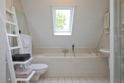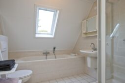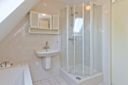 Eerste verdieping: overloop met toegang tot drie ruime slaapkamers. De badkamer is voorzien van een ligbad, separate douche en tweede toilet en een recent geplaatst Velux dakraam.
