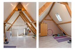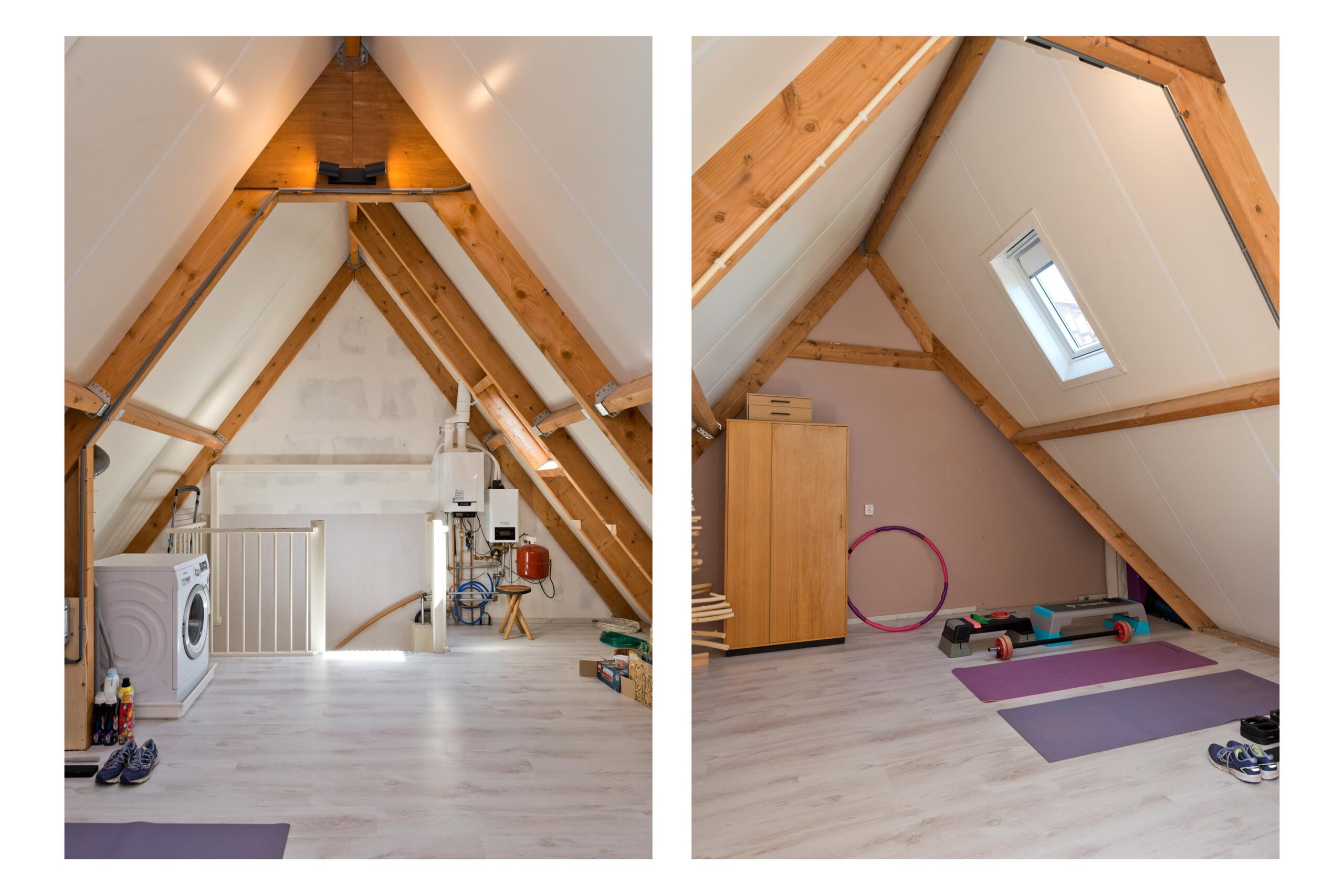 Tweede verdieping: ruime zolderkamer, ideaal als vierde slaapkamer, hobbyruimte of thuiswerkplek. Hier vindt u ook de wasmachineaansluiting, de cv-installatie met hybride ketel en de omvormer van de zonnepanelen.