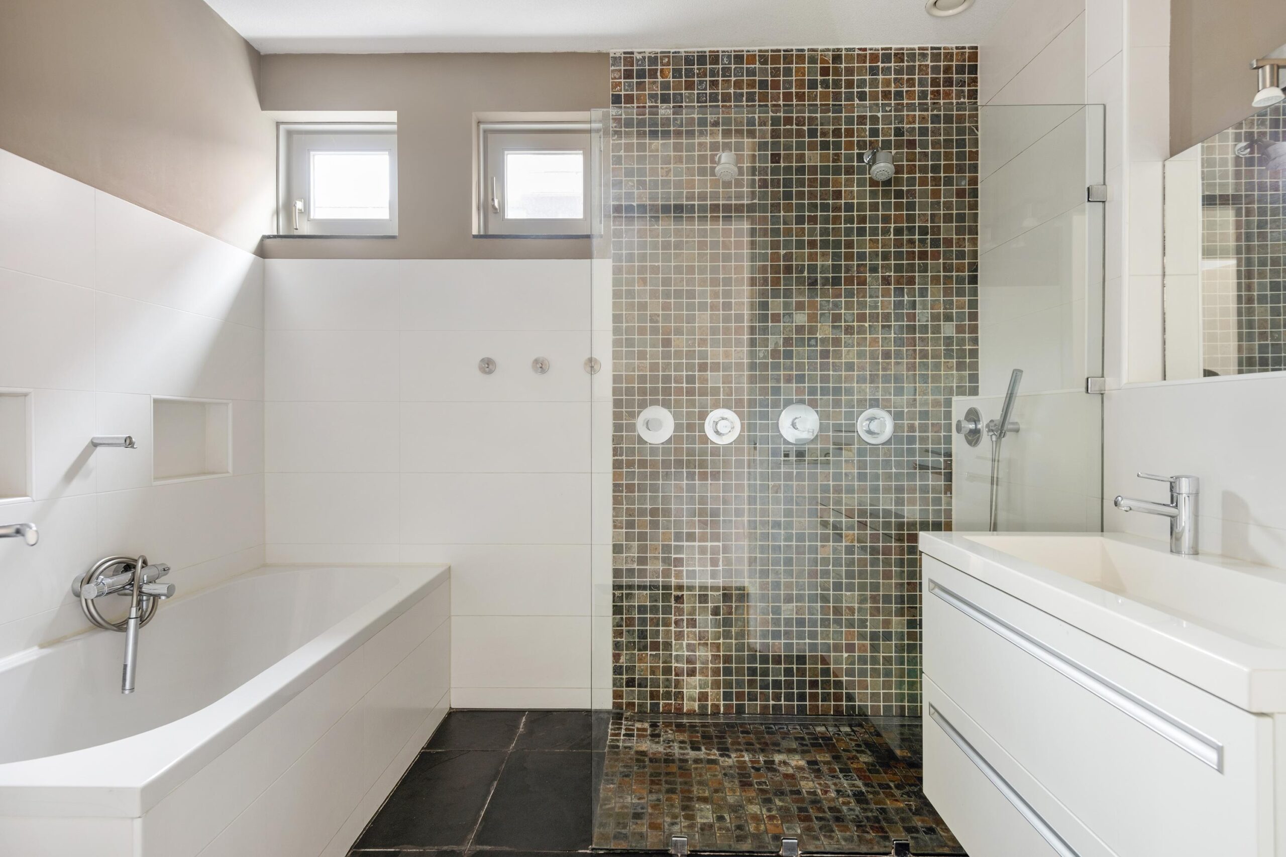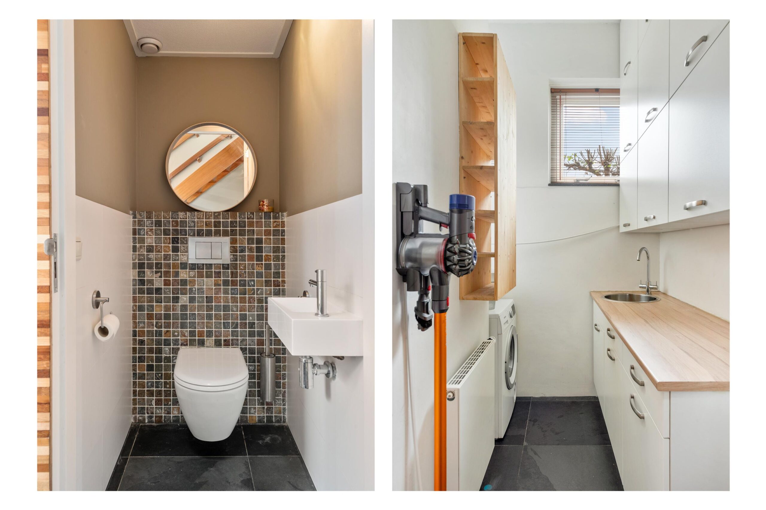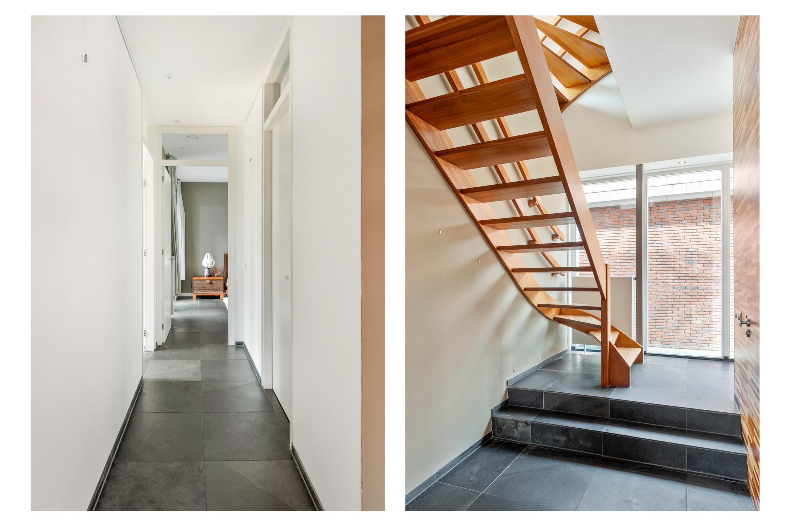 Via de voortuin met oprit en grondkabel voor elektrisch laden bereikt u de entree. De ruime en lichte hal is voorzien van grote raampartijen en een doorgelegde leistenen vloer. Vanuit de hal heeft u toegang tot de meterkast, het toilet met wandcloset en fontein, en de bijkeuken/wasruimte met hoge kasten en een kitchenette. De moderne, ruim opgezette badkamer is uitgerust met een hardglazen dubbele inloopdouche, ligbad, wastafelmeubel, wandcloset en radiator. Verder bevinden zich op deze verdieping drie ruime slaapkamers, elk met draai/kiepramen en veel lichtinval. Een fraaie hardhouten trap leidt naar de eerste verdieping.