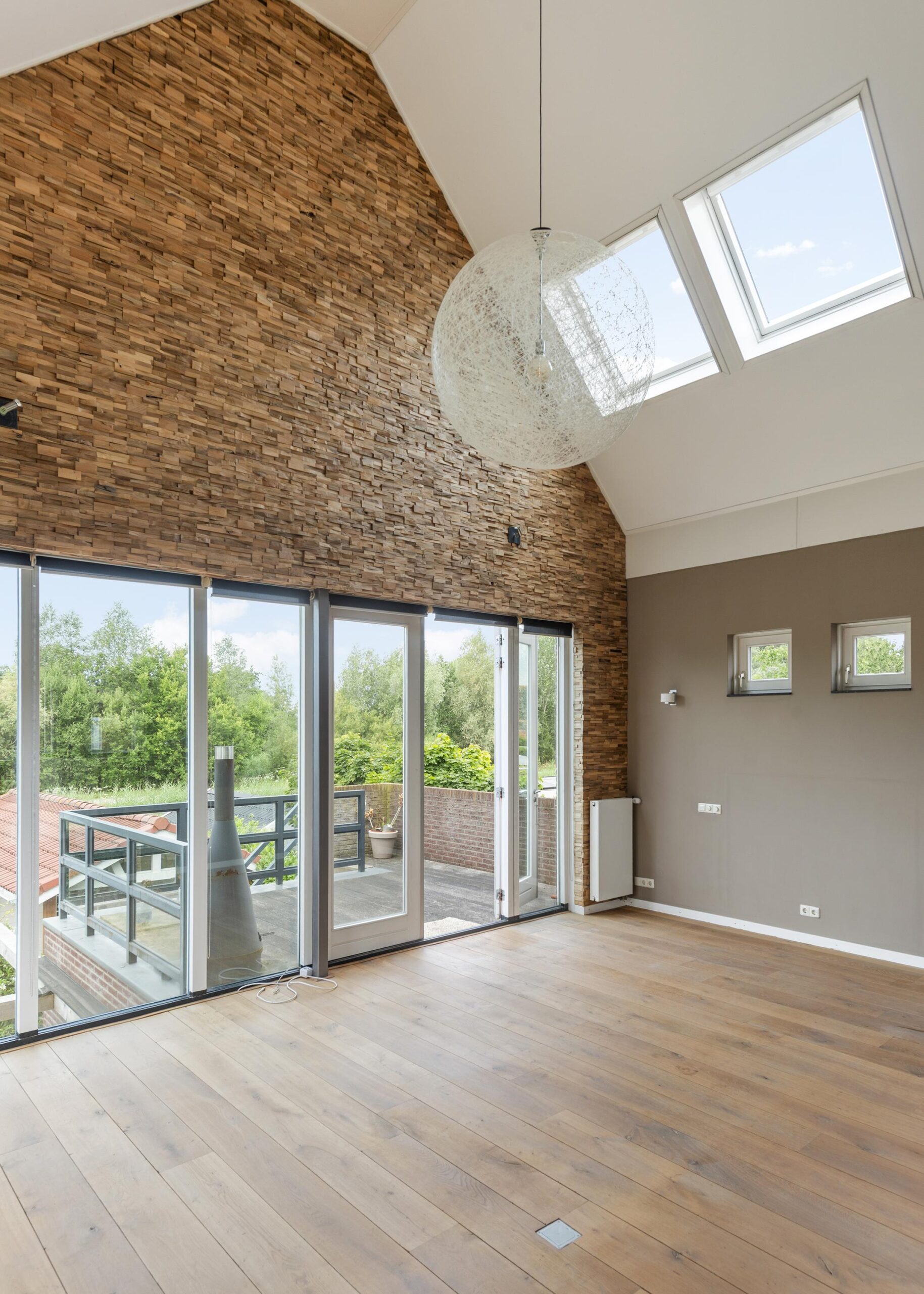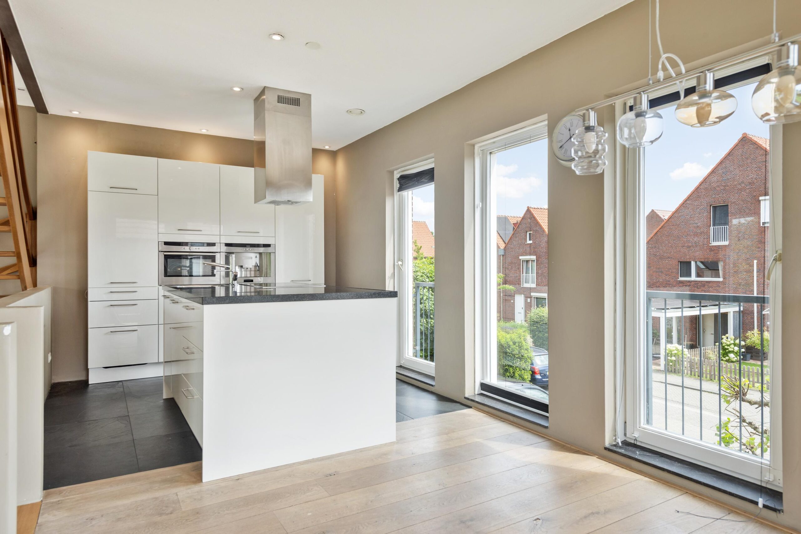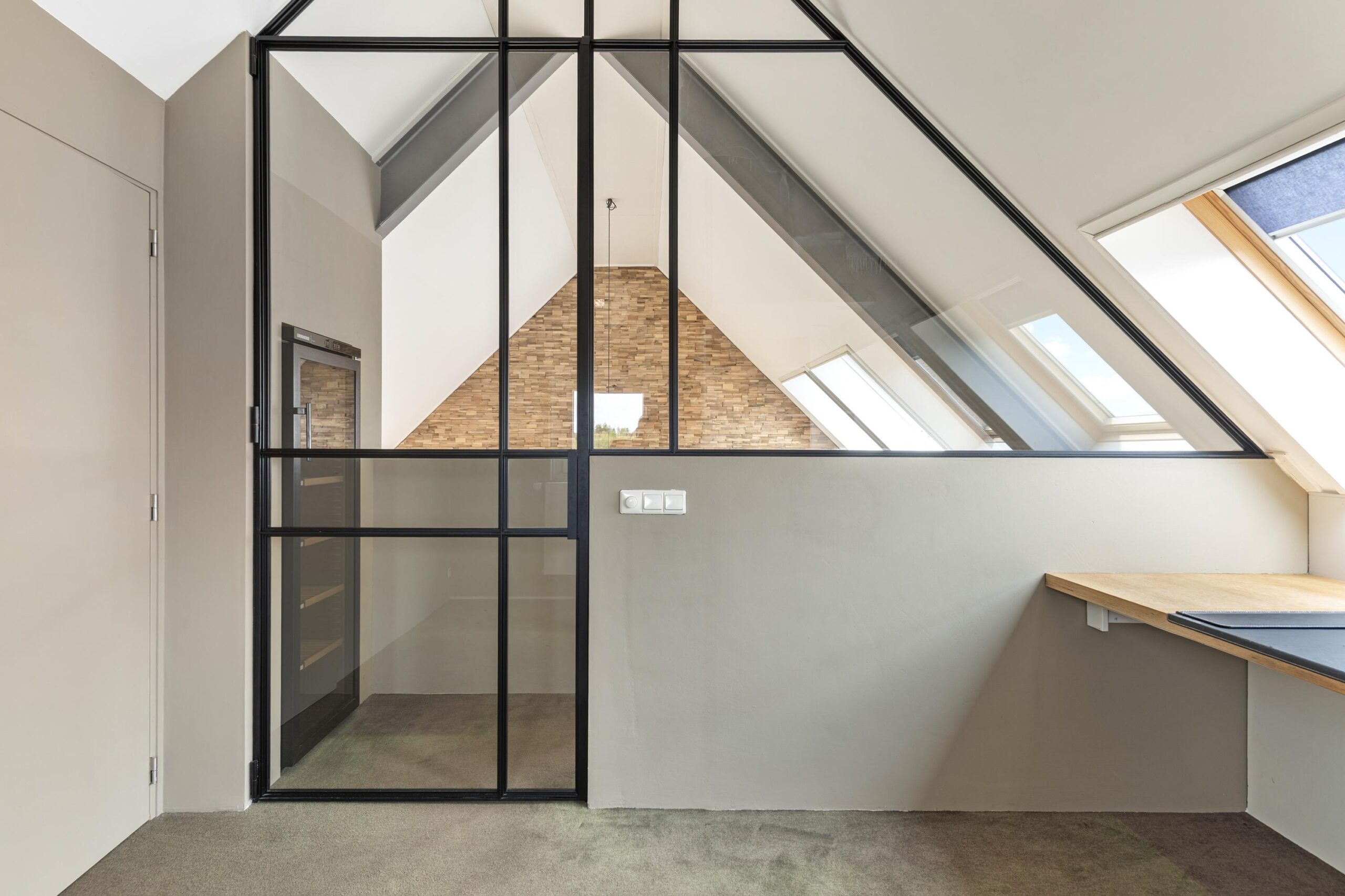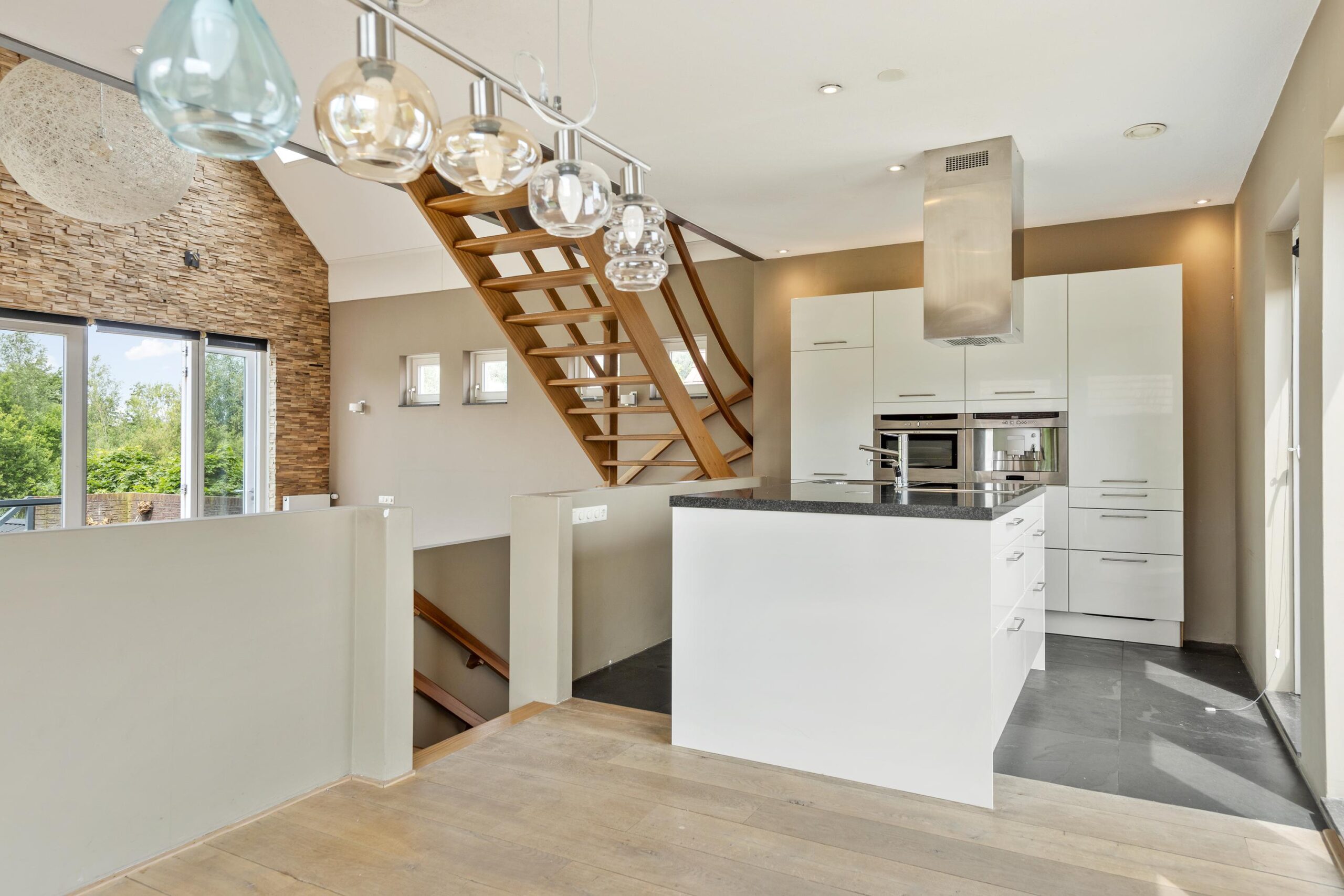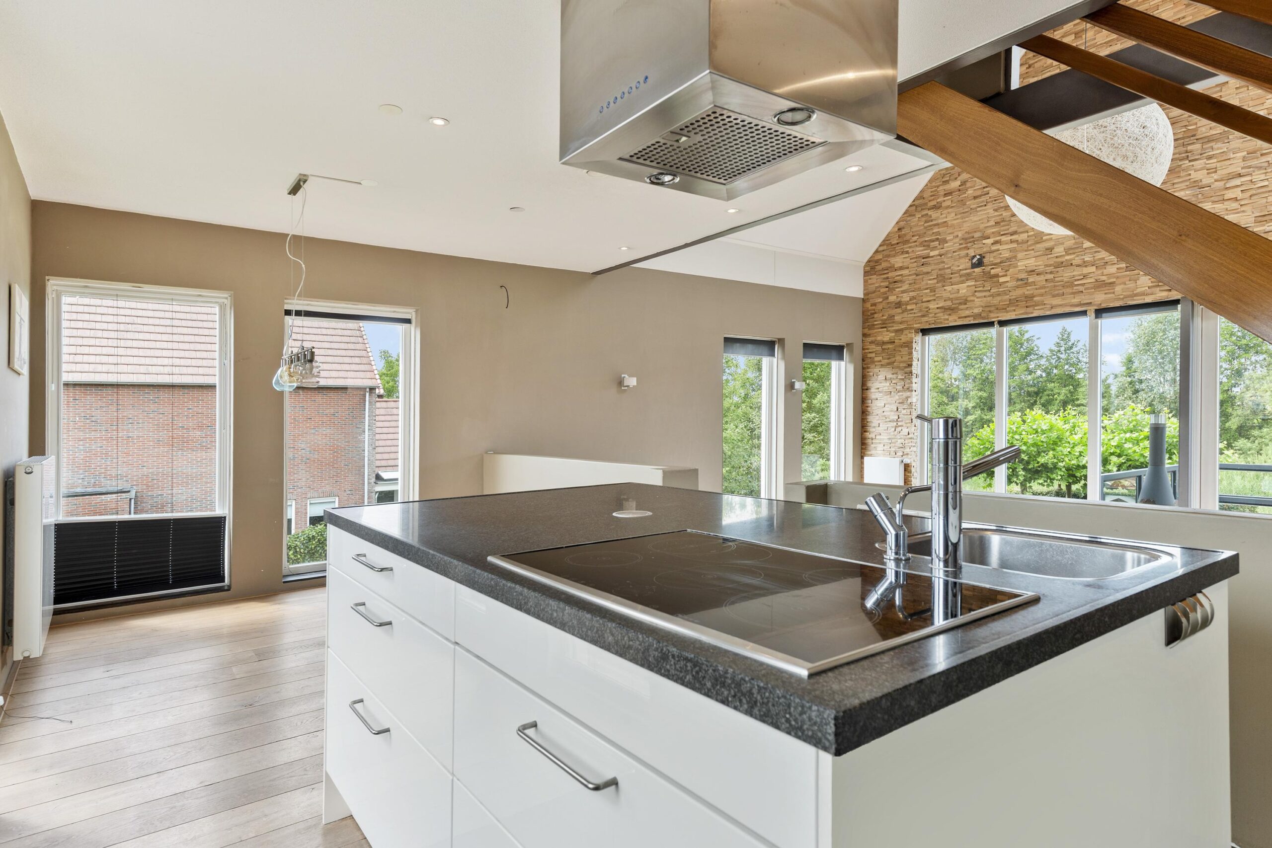 Op de eerste verdieping bevindt zich de hoge, lichte living met vide. De ruimte is voorzien van eikenhouten vloerdelen, grote raampartijen met panoramisch uitzicht, elektrische dakvensters en een airco-installatie. Openslaande deuren geven toegang tot een zonnig terras met buitentrap naar de tuin. De moderne open keuken beschikt over een natuurstenen aanrechtblad, luxe inbouwapparatuur en een leistenen vloer. Een tweede hardhouten trap leidt naar de bovenste verdieping.
