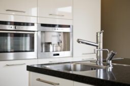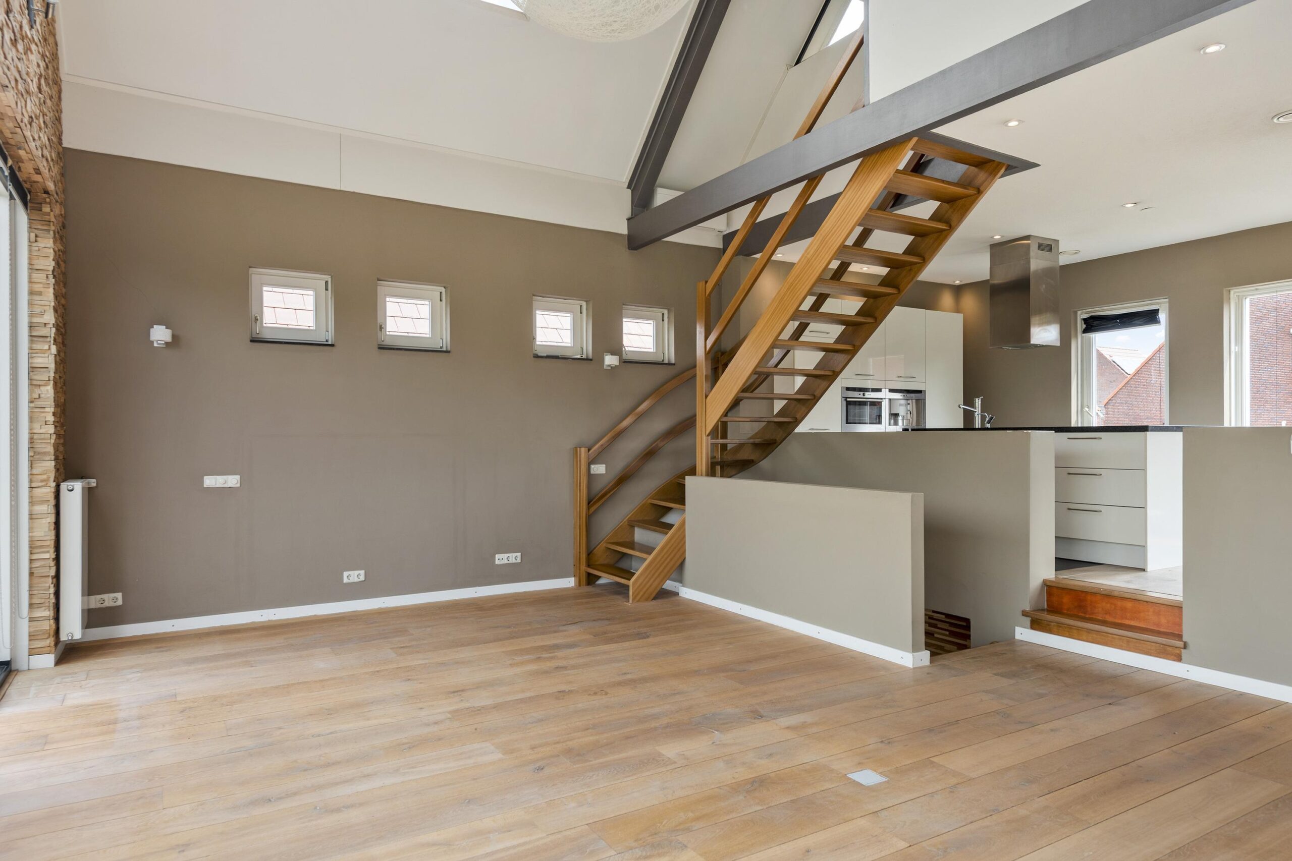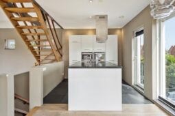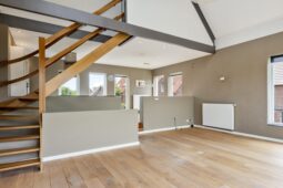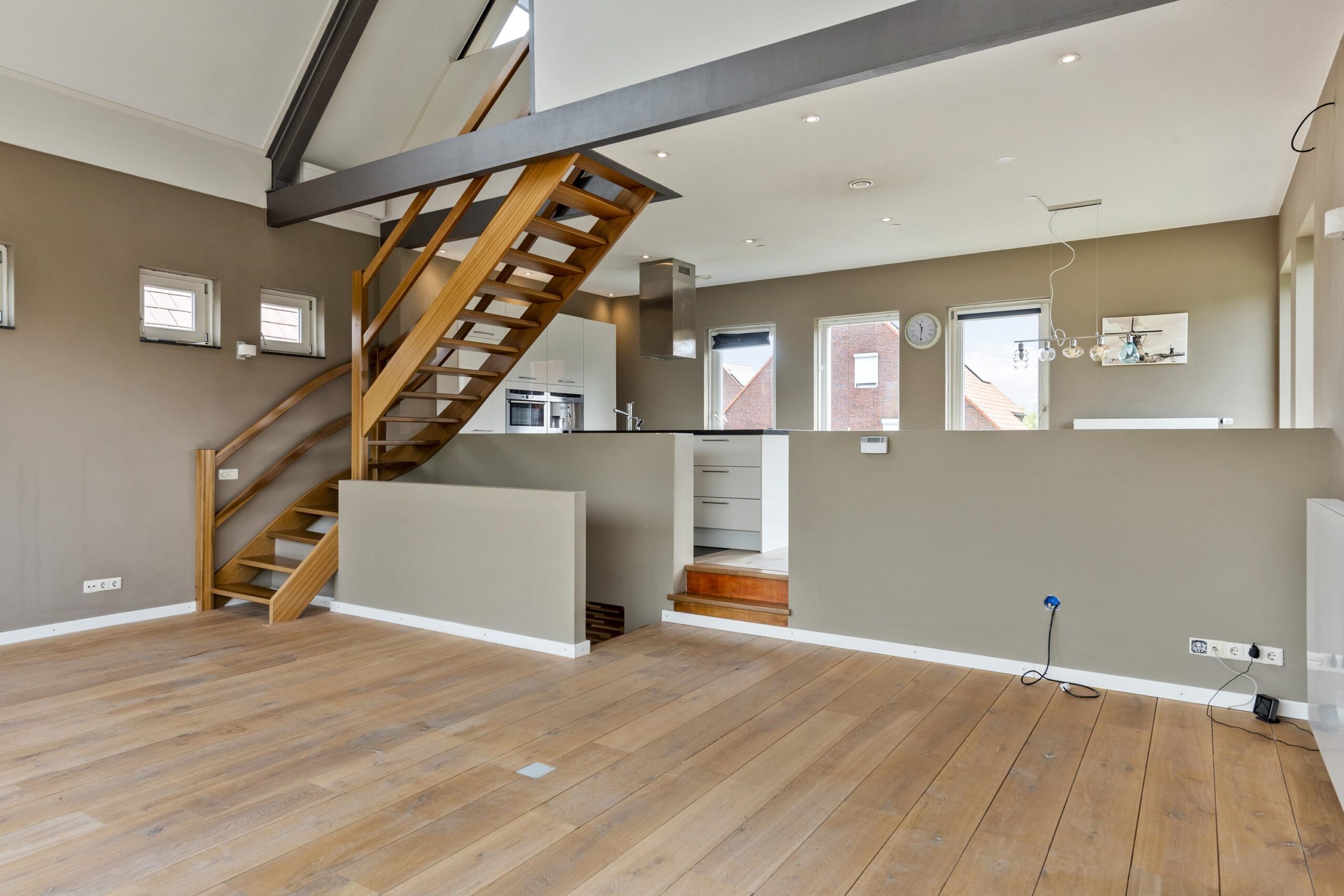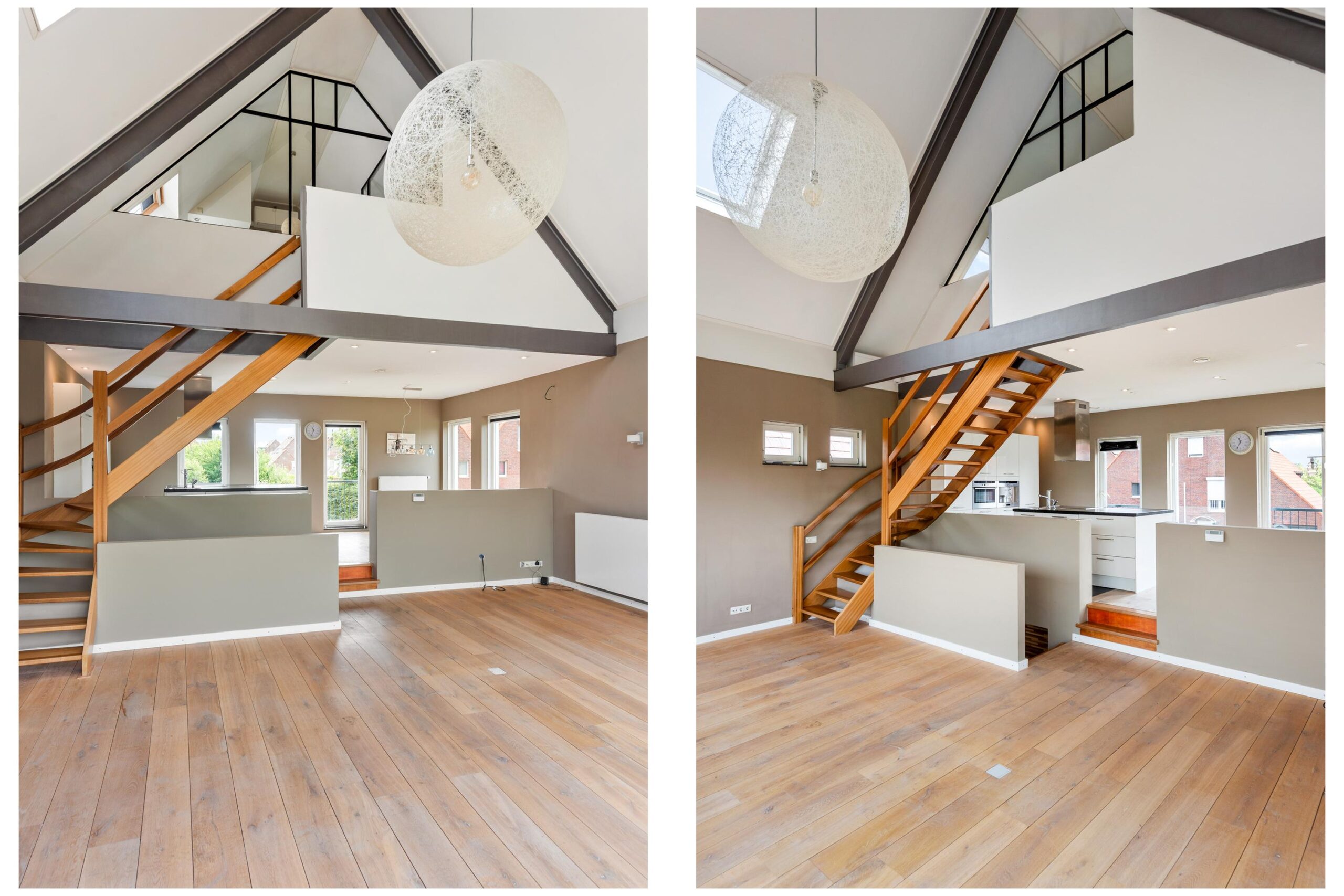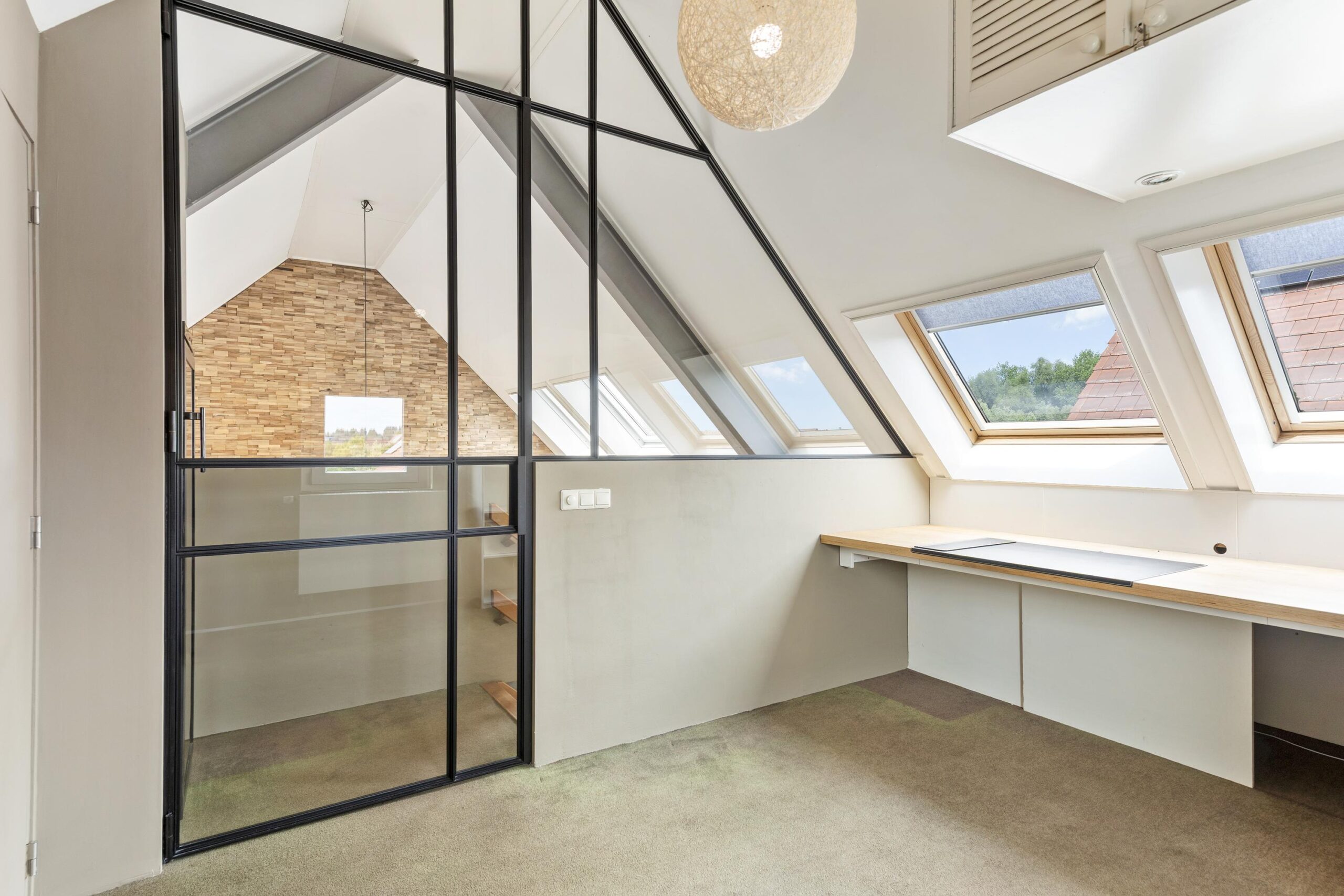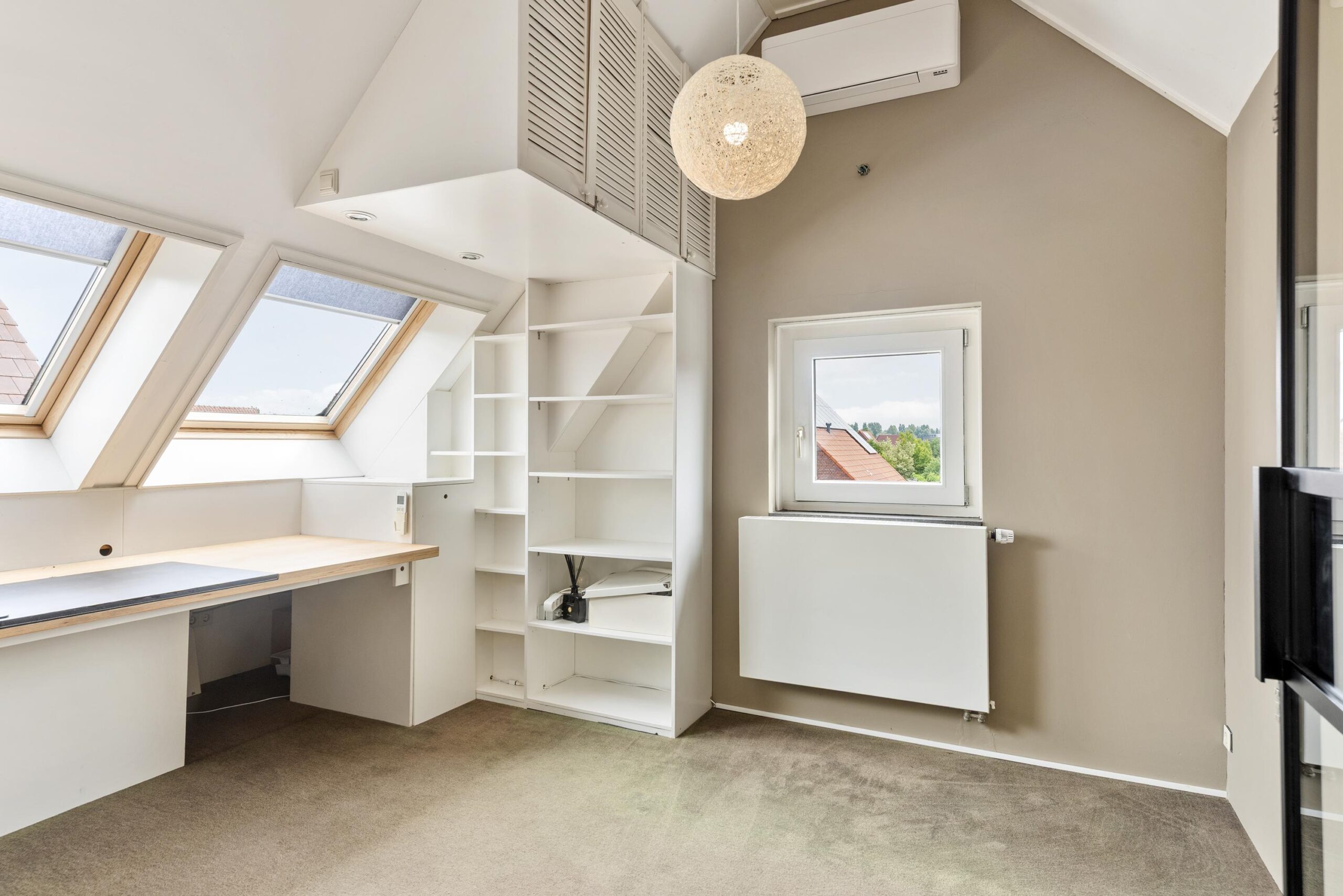 Op de eerste verdieping bevindt zich de hoge, lichte living met vide. De ruimte is voorzien van eikenhouten vloerdelen, grote raampartijen met panoramisch uitzicht, elektrische dakvensters en een airco-installatie. Openslaande deuren geven toegang tot een zonnig terras met buitentrap naar de tuin. De moderne open keuken beschikt over een natuurstenen aanrechtblad, luxe inbouwapparatuur en een leistenen vloer. Een tweede hardhouten trap leidt naar de bovenste verdieping.