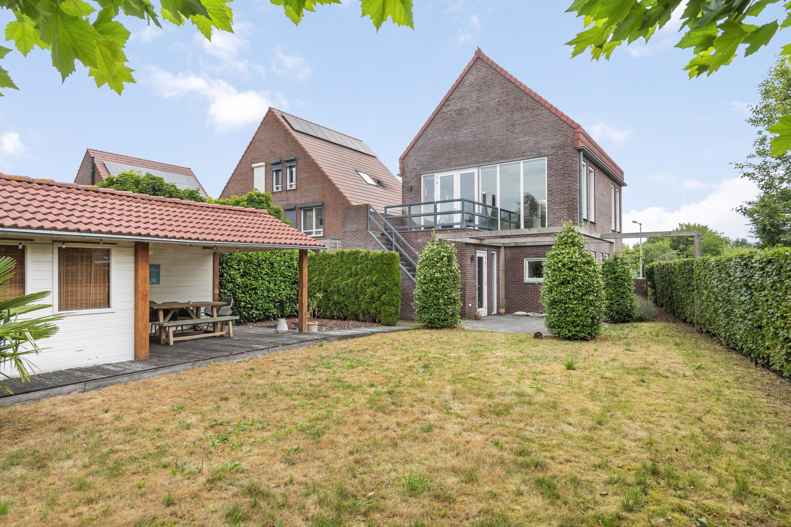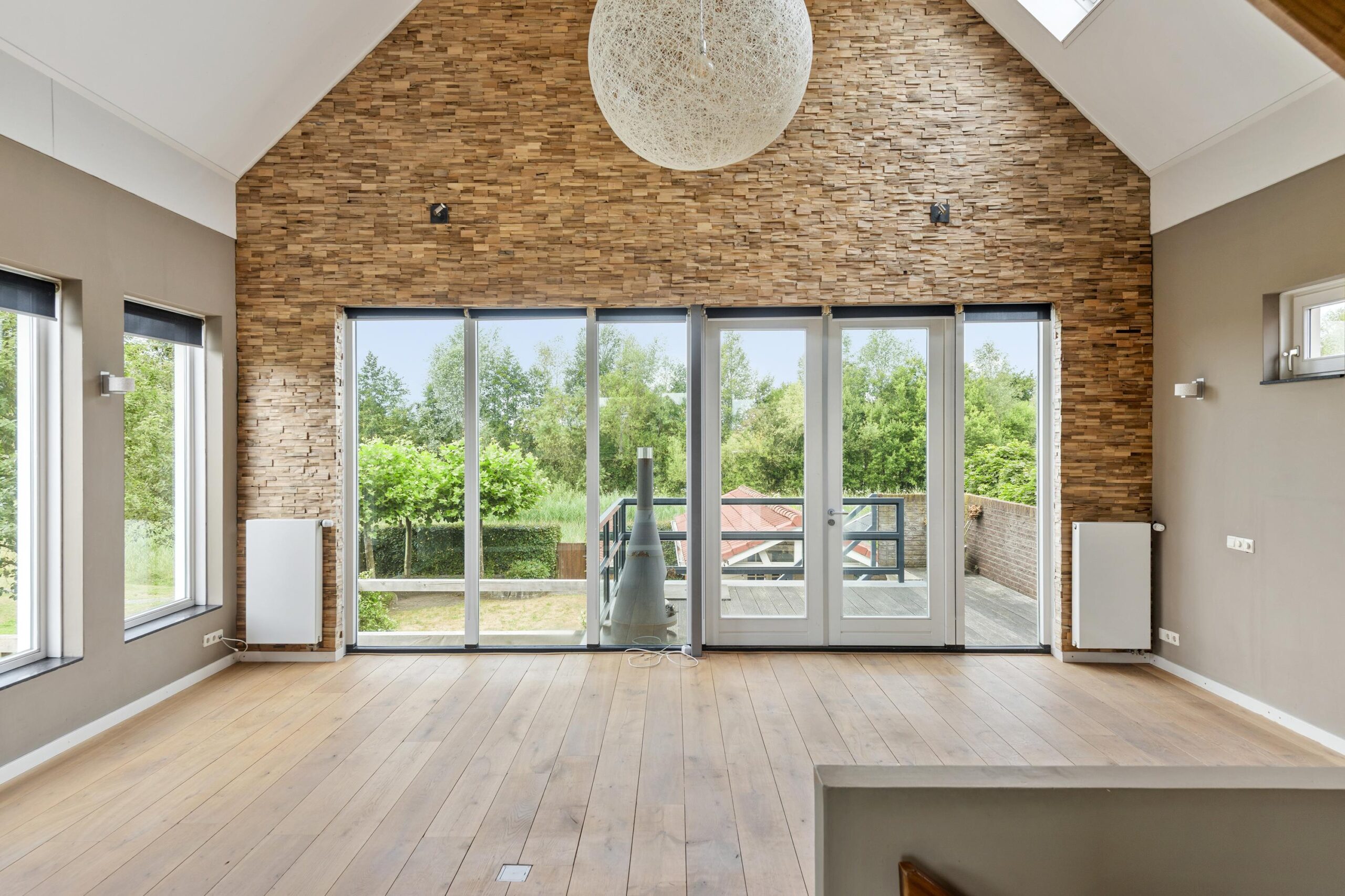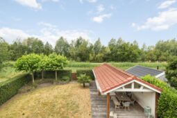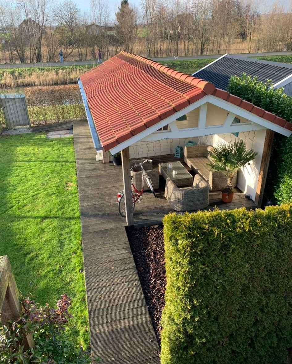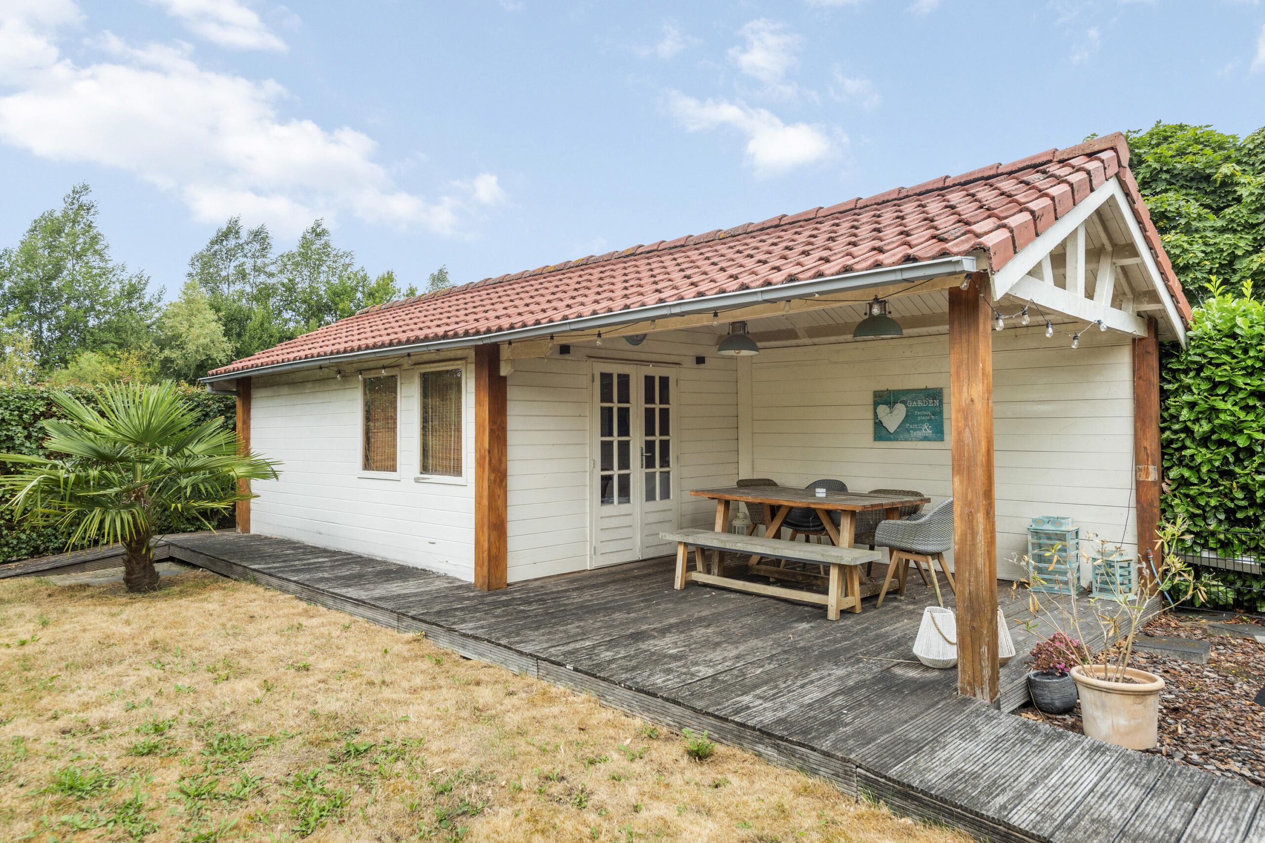 De diepe, zonnige achtertuin ligt op het westen en sluit perfect aan op het open karakter van de woning. U vindt hier een ruime overkapping, een houten chalet en een extra fietsenberging onder de buitentrap. Het gevoel van vrijheid, rust en ruimte zet zich hier naadloos voort.