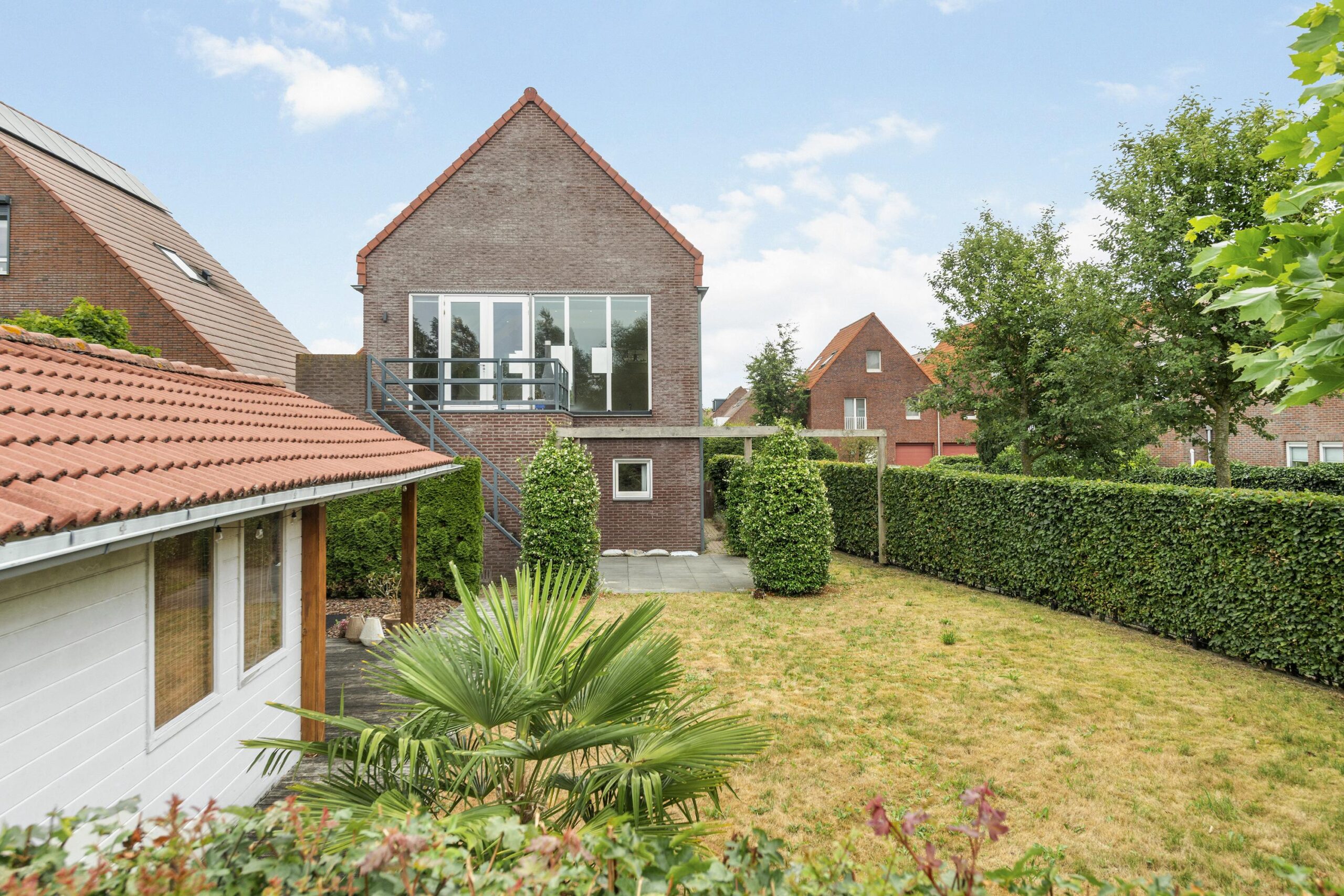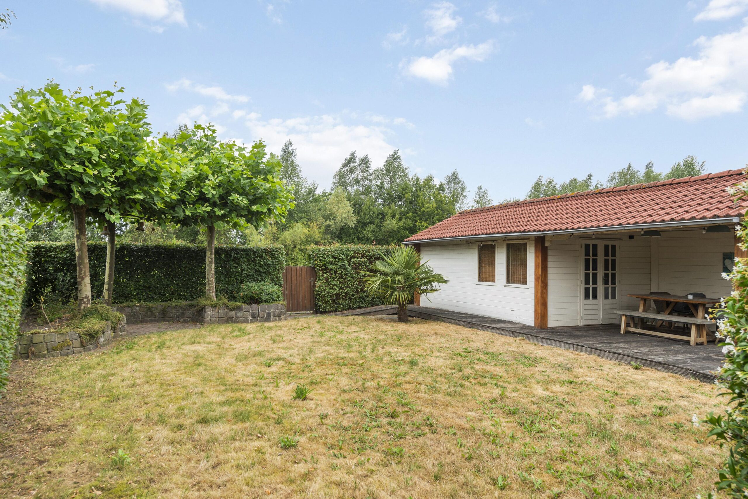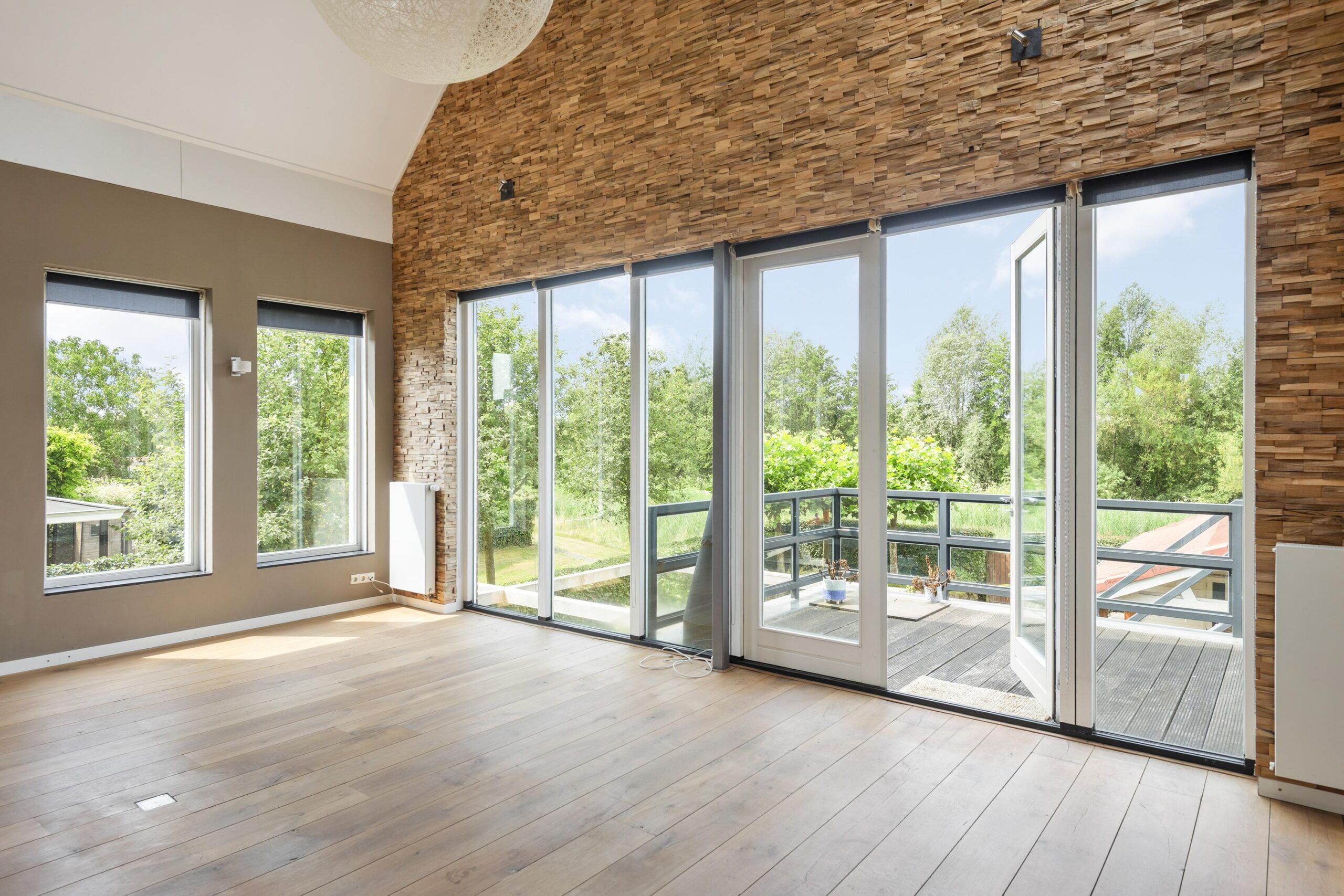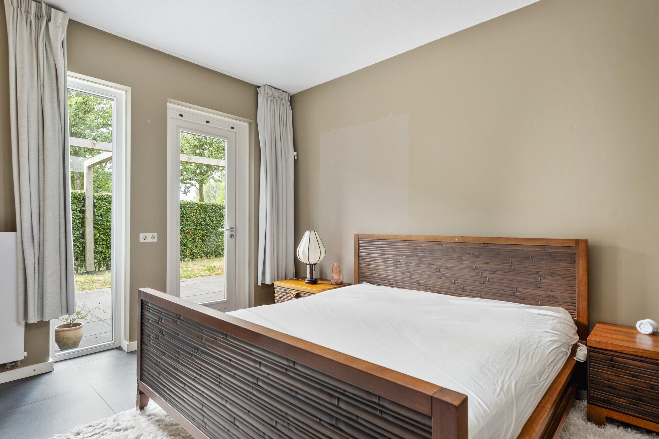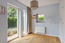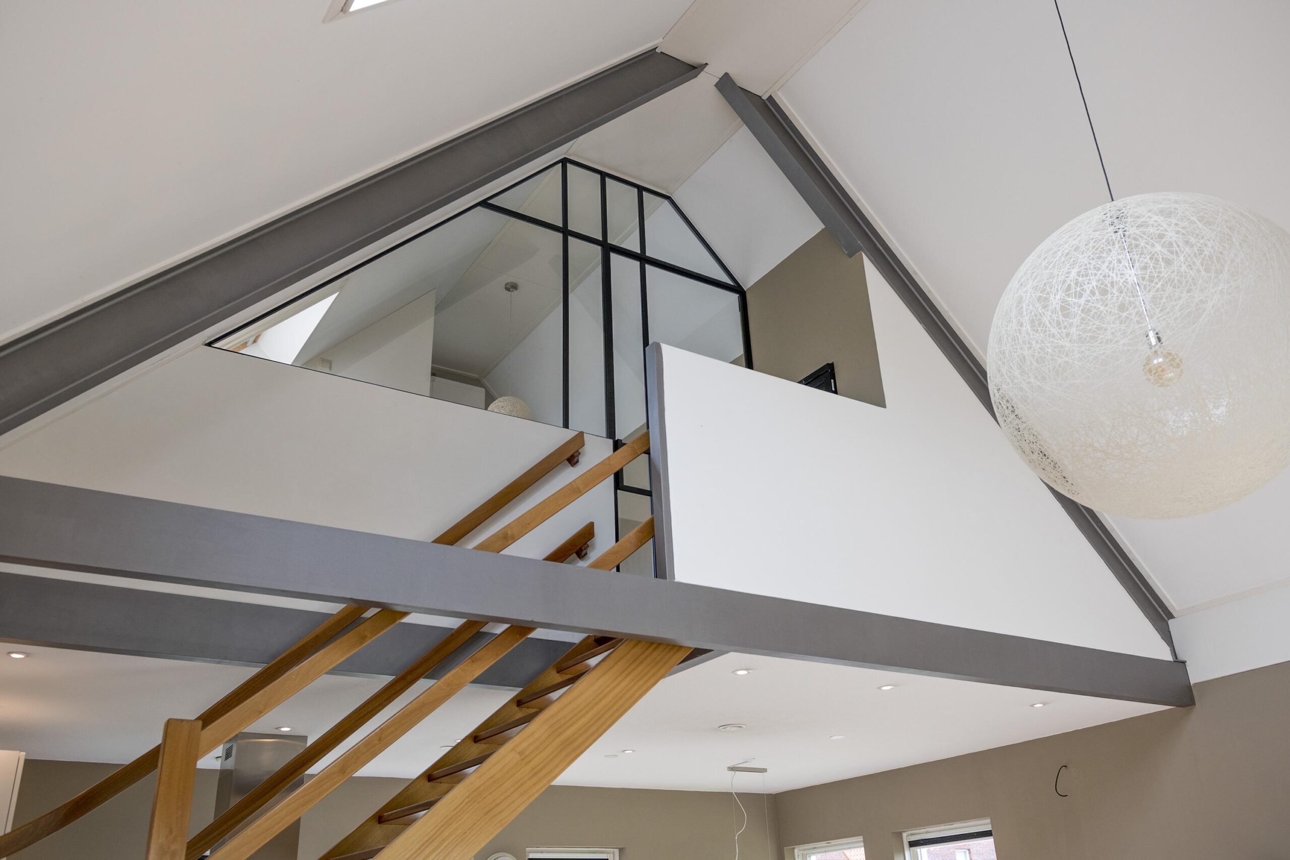 De diepe, zonnige achtertuin ligt op het westen en sluit perfect aan op het open karakter van de woning. U vindt hier een ruime overkapping, een houten chalet en een extra fietsenberging onder de buitentrap. Het gevoel van vrijheid, rust en ruimte zet zich hier naadloos voort.
