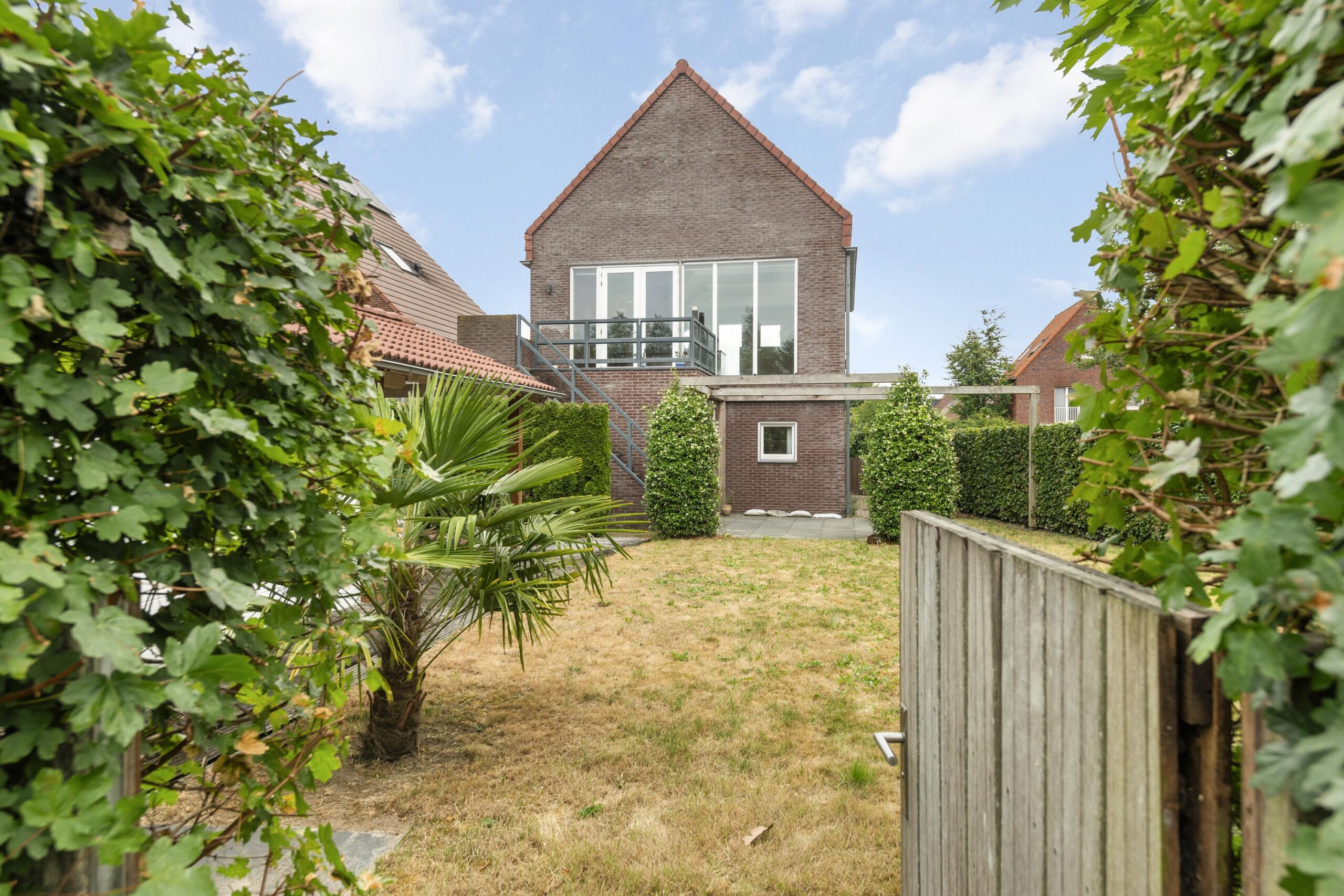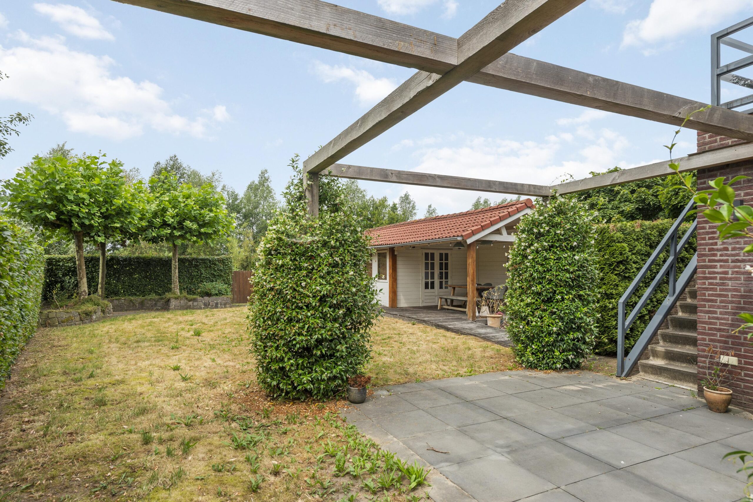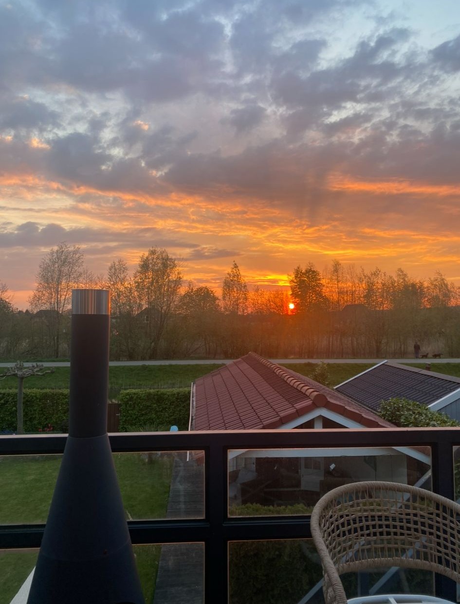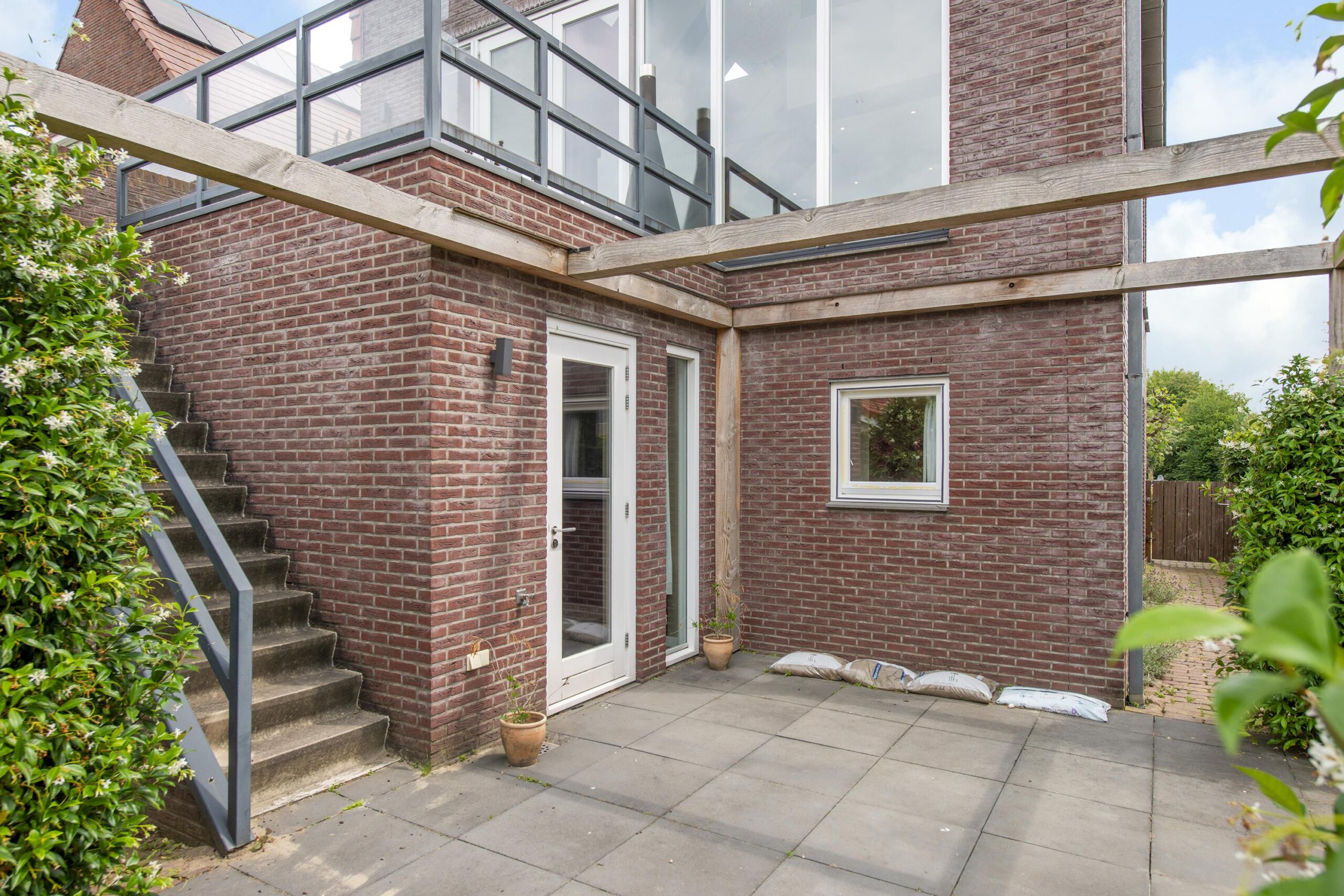 De diepe, zonnige achtertuin ligt op het westen en sluit perfect aan op het open karakter van de woning. U vindt hier een ruime overkapping, een houten chalet en een extra fietsenberging onder de buitentrap. Het gevoel van vrijheid, rust en ruimte zet zich hier naadloos voort.