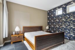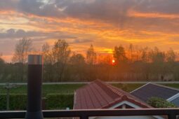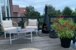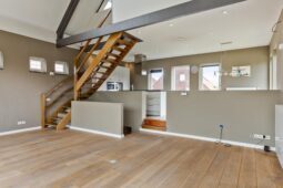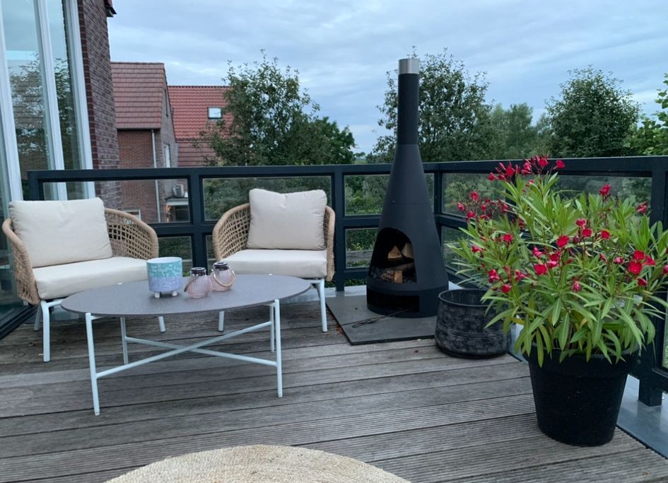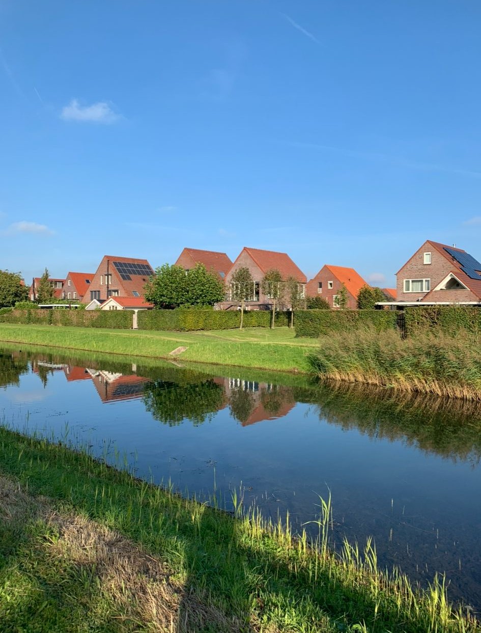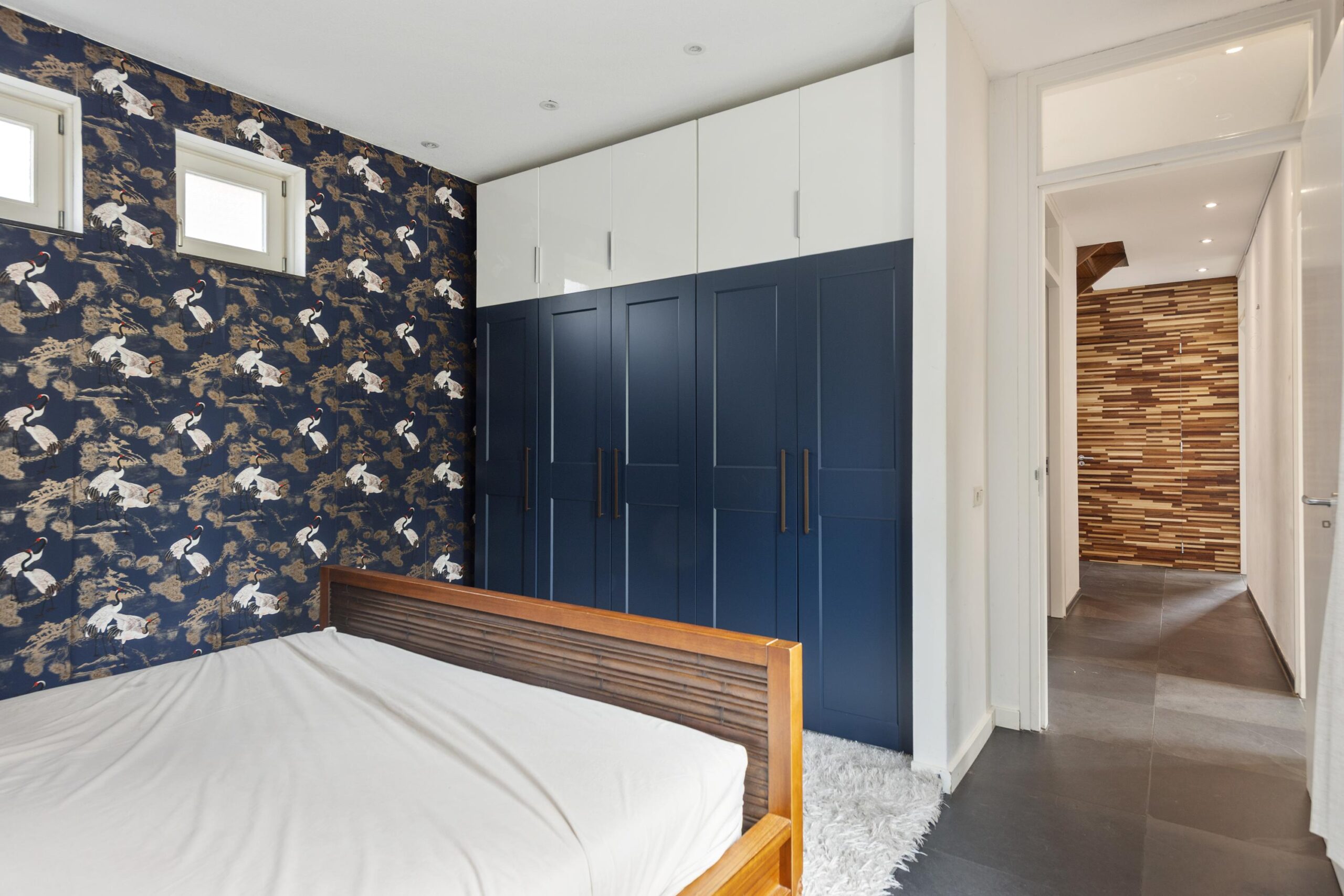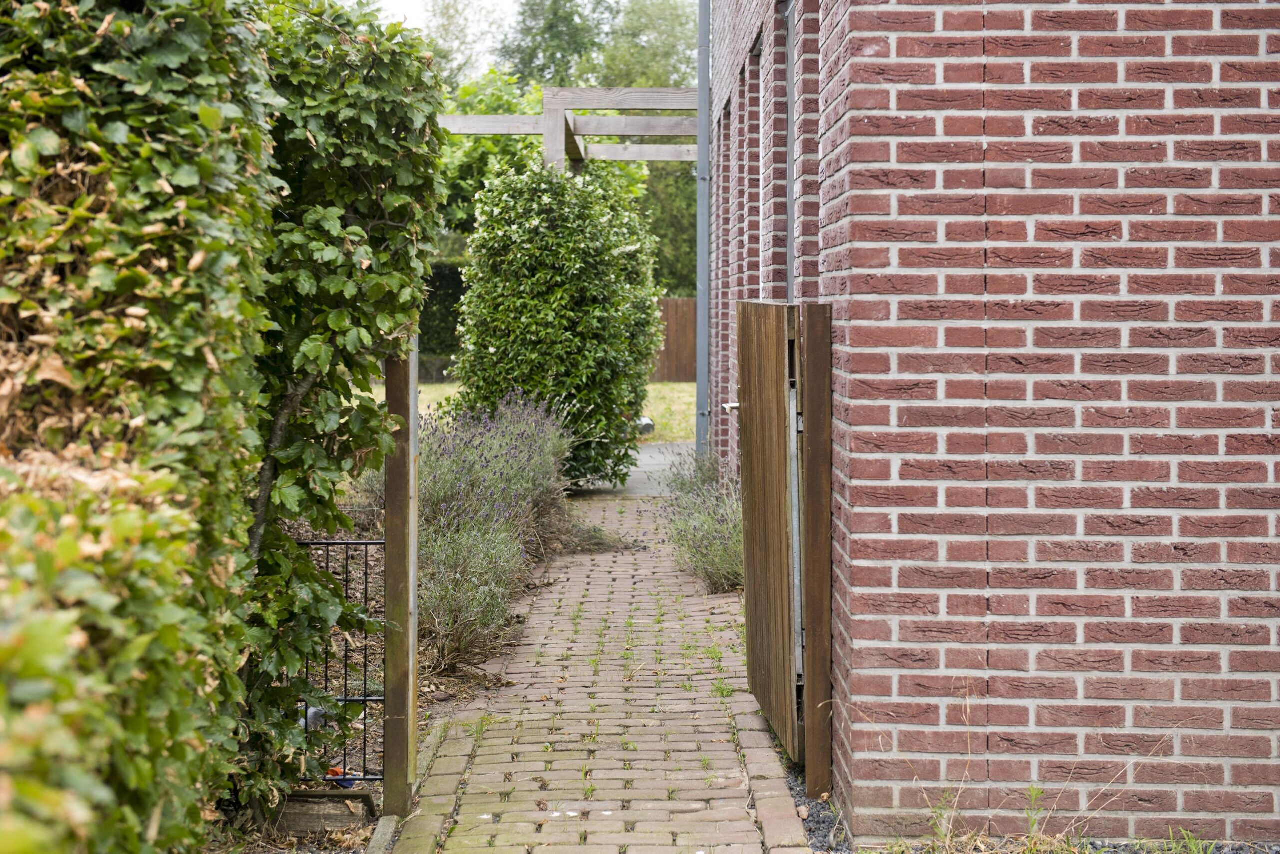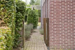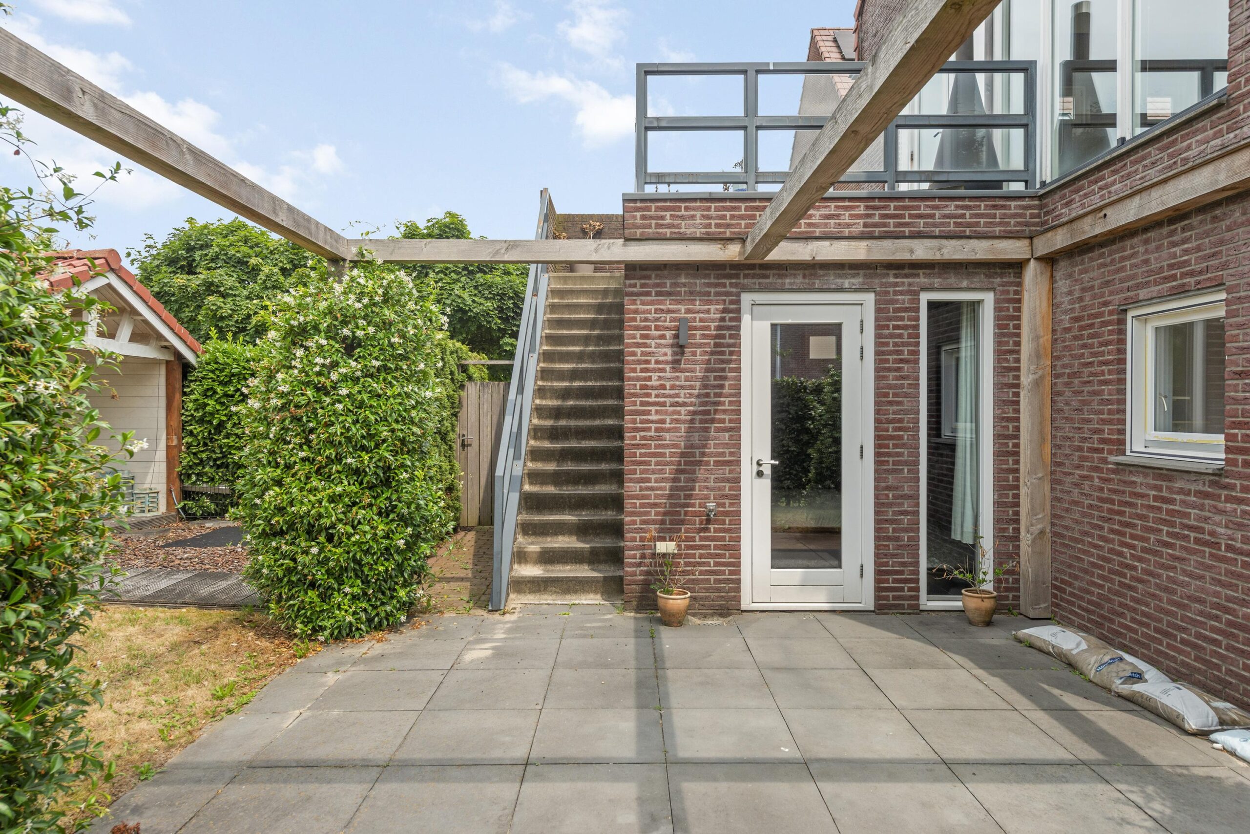 De diepe, zonnige achtertuin ligt op het westen en sluit perfect aan op het open karakter van de woning. U vindt hier een ruime overkapping, een houten chalet en een extra fietsenberging onder de buitentrap. Het gevoel van vrijheid, rust en ruimte zet zich hier naadloos voort.