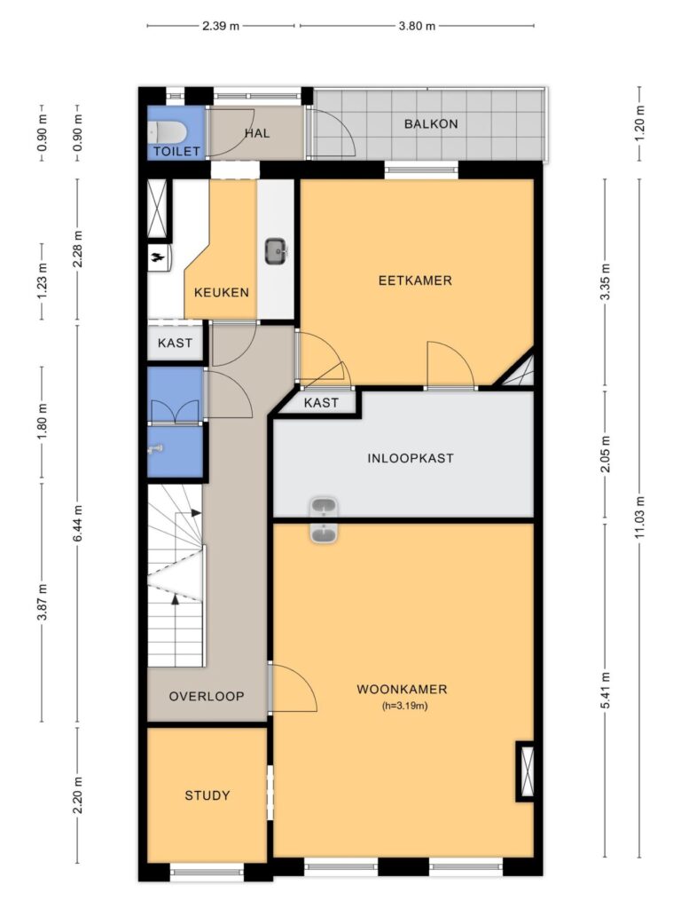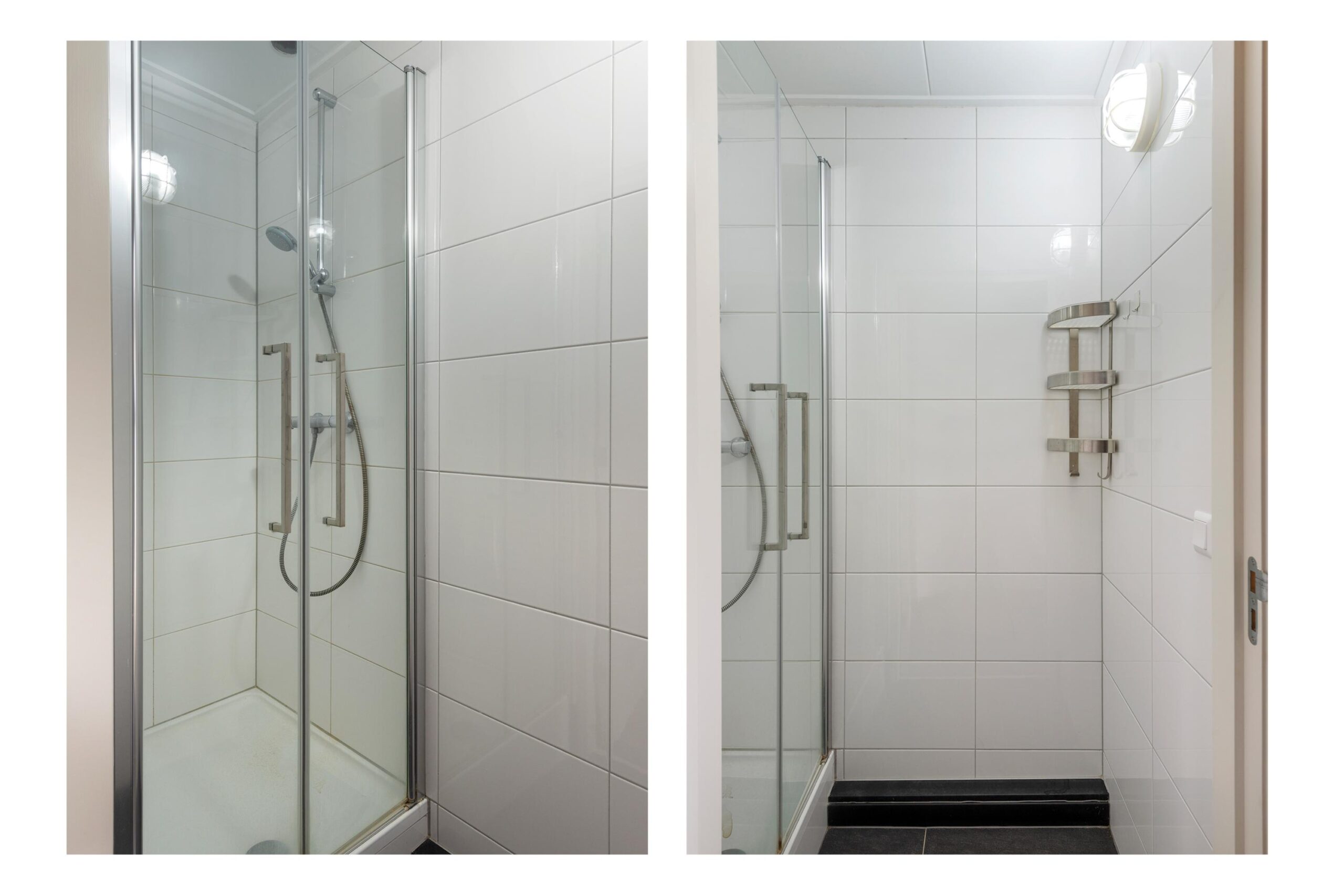Entree, trapopgang, overloop met doorloop naar de aan de voorzijde gelegen zonnige woonkamer met study. Aan de achterzijde van deze verdieping vind je de eetkamer met royale inloopkast/study, de keuken, het toilet en toegang tot het balkon aan de achterzijde. Ook vind je op deze overloop momenteel de douchegelegenheid.