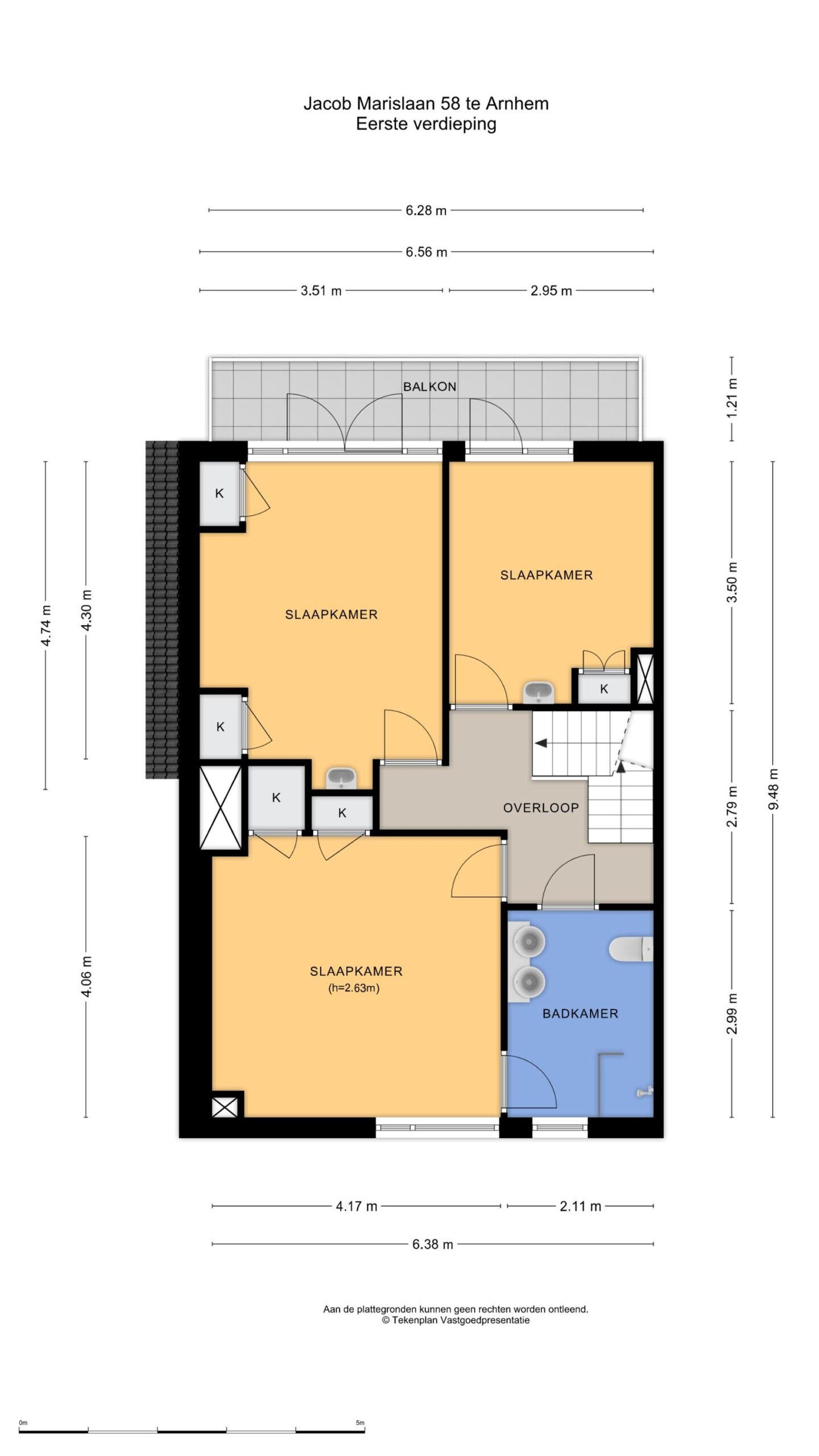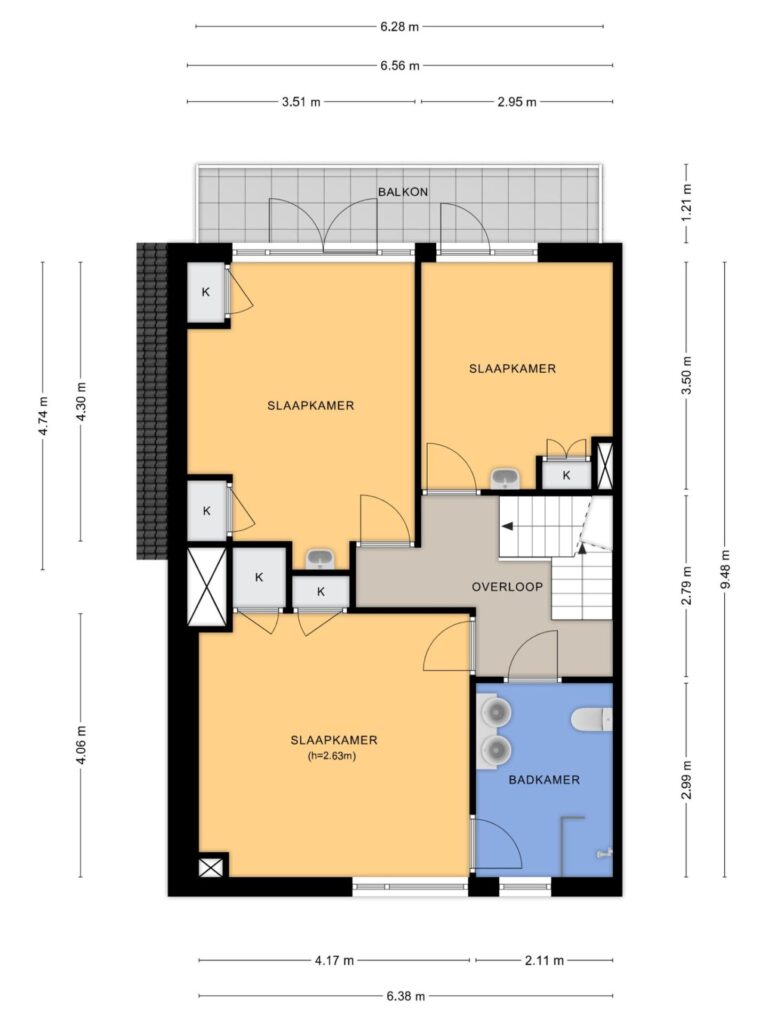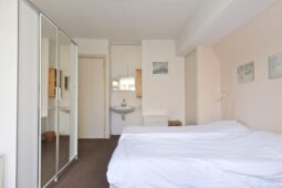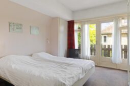 Eerste verdieping: ruime overloop, drie slaapkamers, waarvan twee met openslaande deuren naar het balkon. De badkamer is aan de voorzijde gesitueerd en is voorzien van een inloopdouche, dubbele wastafel en tweede toilet.