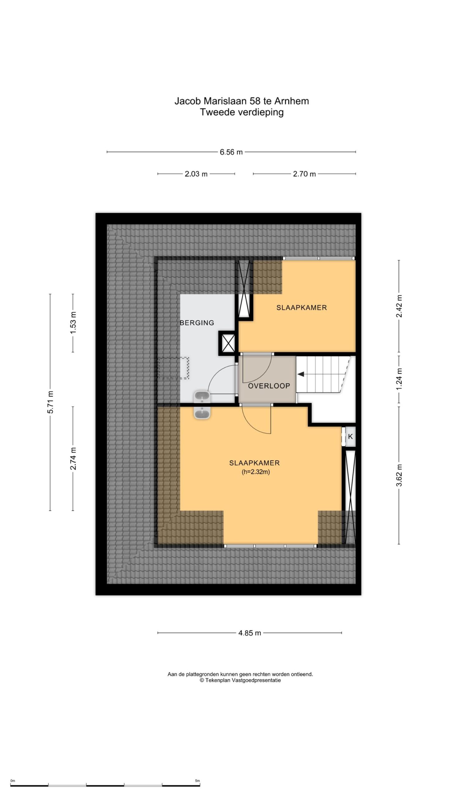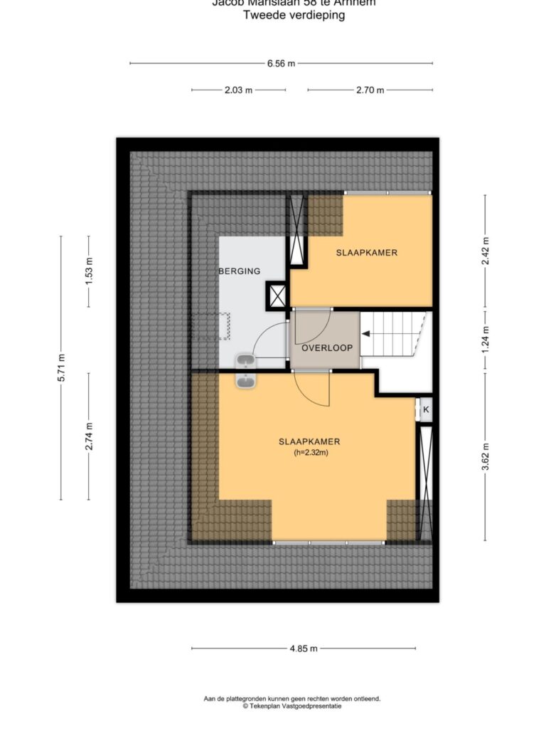 Tweede verdieping: overloop, twee ruime slaapkamers met dakkapellen en extra bergruimte.