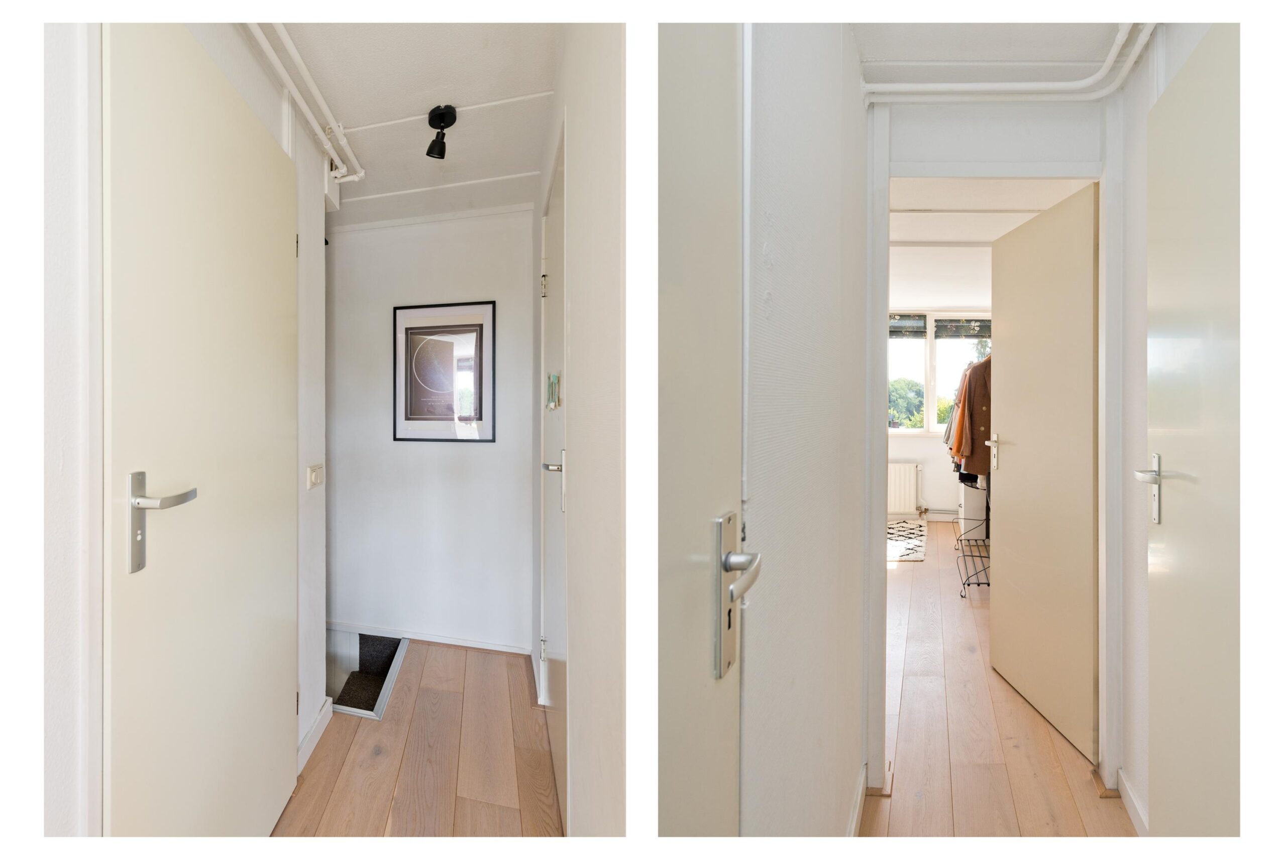 Entree van het appartement. Hal met meterkast, moderne toiletruimte met fontein en trapopgang naar de tweede verdieping. De moderne keuken beschikt over diverse inbouwapparatuur en een handige inbouwkast met wasmachineaansluiting. De lichte woonkamer met schuifpui biedt een vrij uitzicht en toegang tot het zonnige balkon op het zuiden.