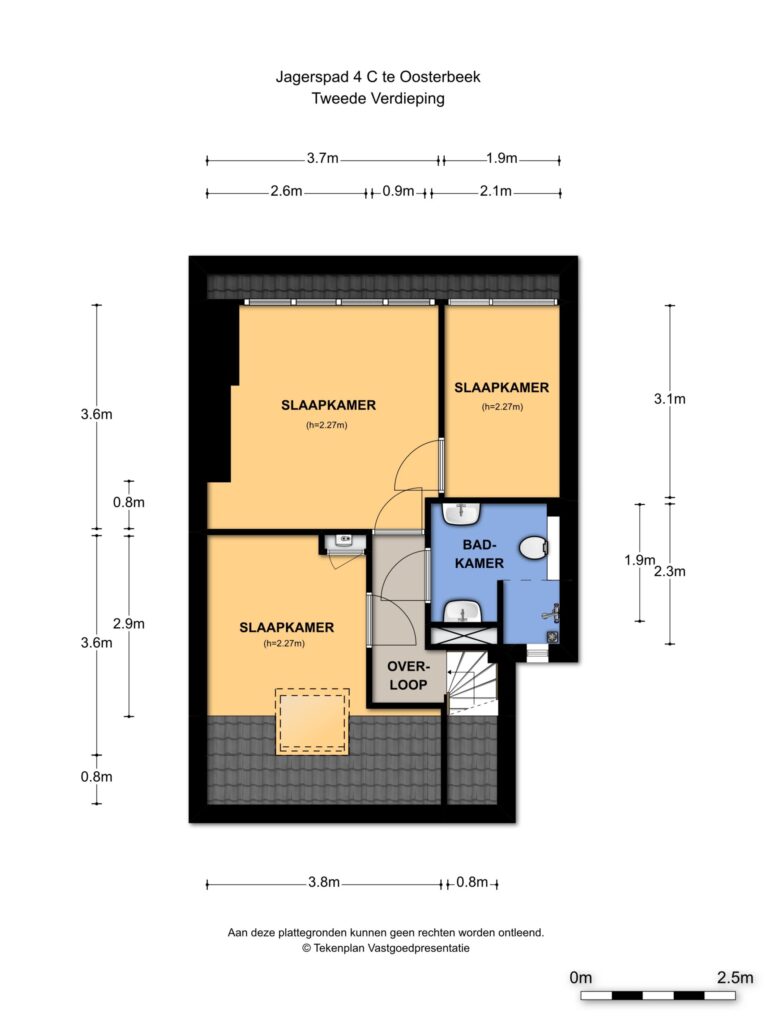 Overloop, moderne badkamer met douche, wastafelmeubel, handdoekenradiator en tweede toilet. Er zijn drie slaapkamers, waarvan twee zeer ruim dankzij een grote dakkapel.