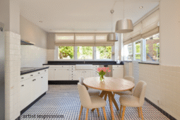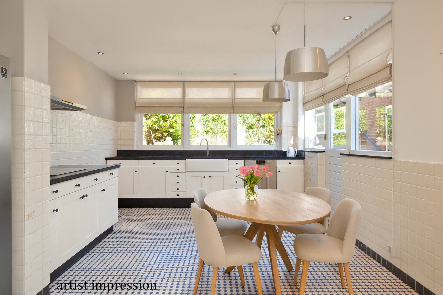 Binnen is het heerlijk ruim en sfeervol! De uitgebouwde, sfeervolle, woonkeuken is een echte eyecatcher: voorzien van vloerverwarming, inbouwapparatuur en met uitzicht op de groene en zonnige tuin. Hier is het elke dag fijn thuiskomen. De lichte woonkamer met erker, eikenhouten vloer en houtkachel biedt een warme en knusse sfeer. Originele details zoals paneeldeuren, luiken, granito vloer, lambrisering en de klassieke bordestrap geven het huis extra karakter.