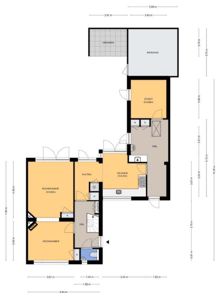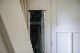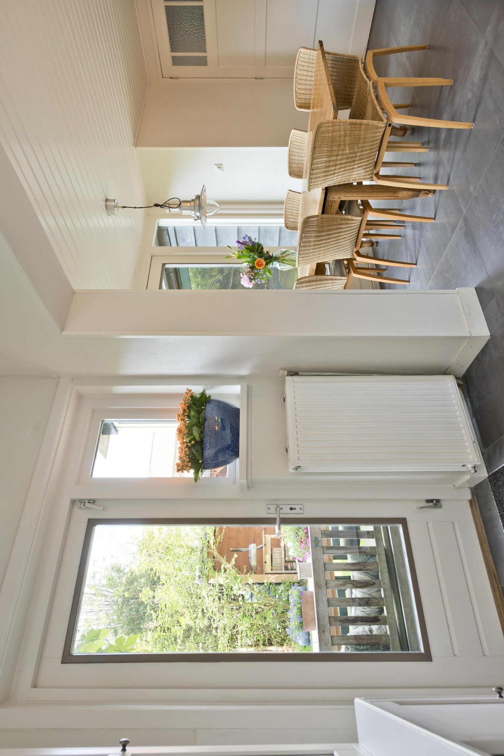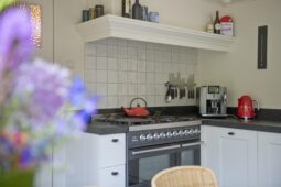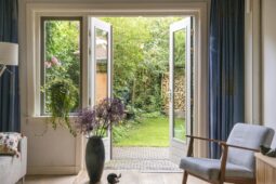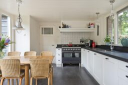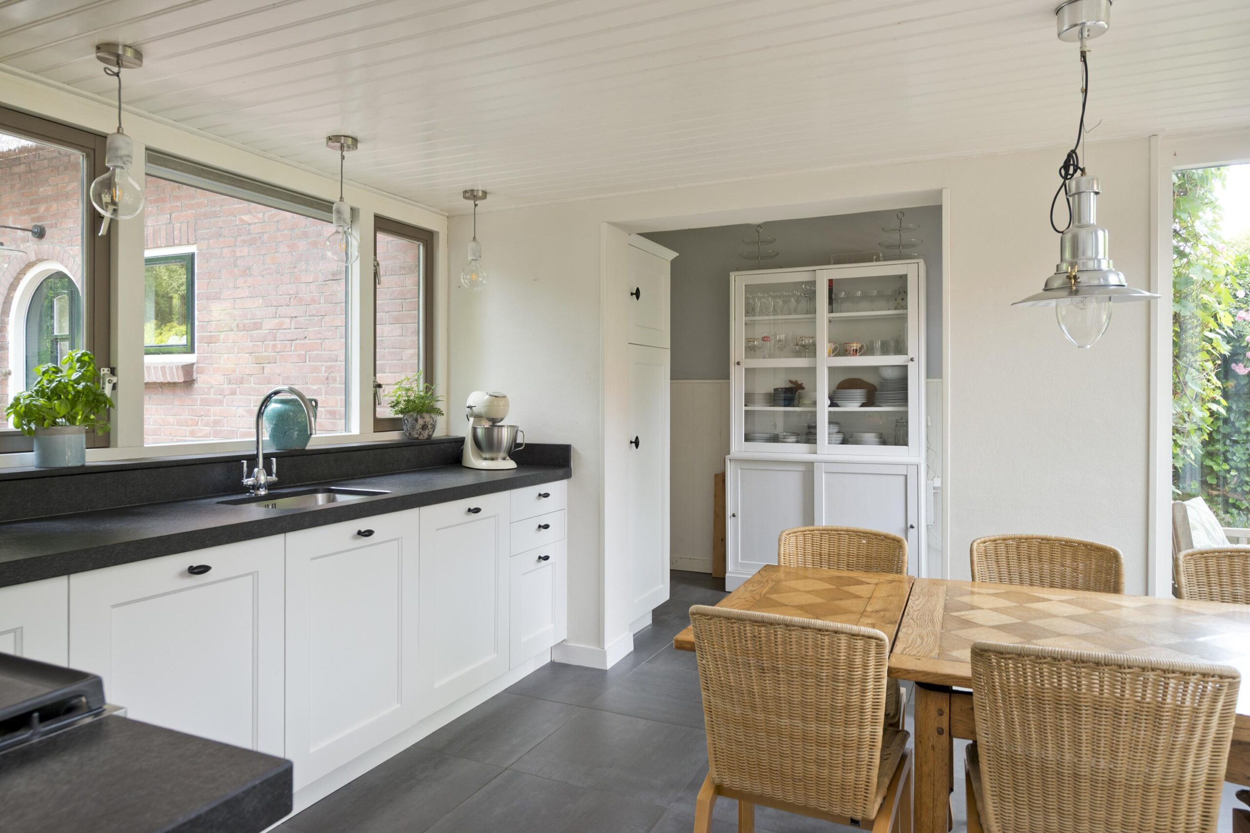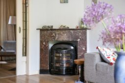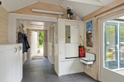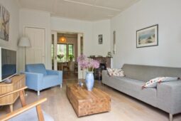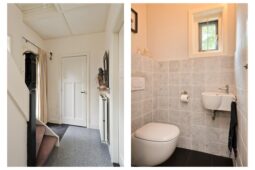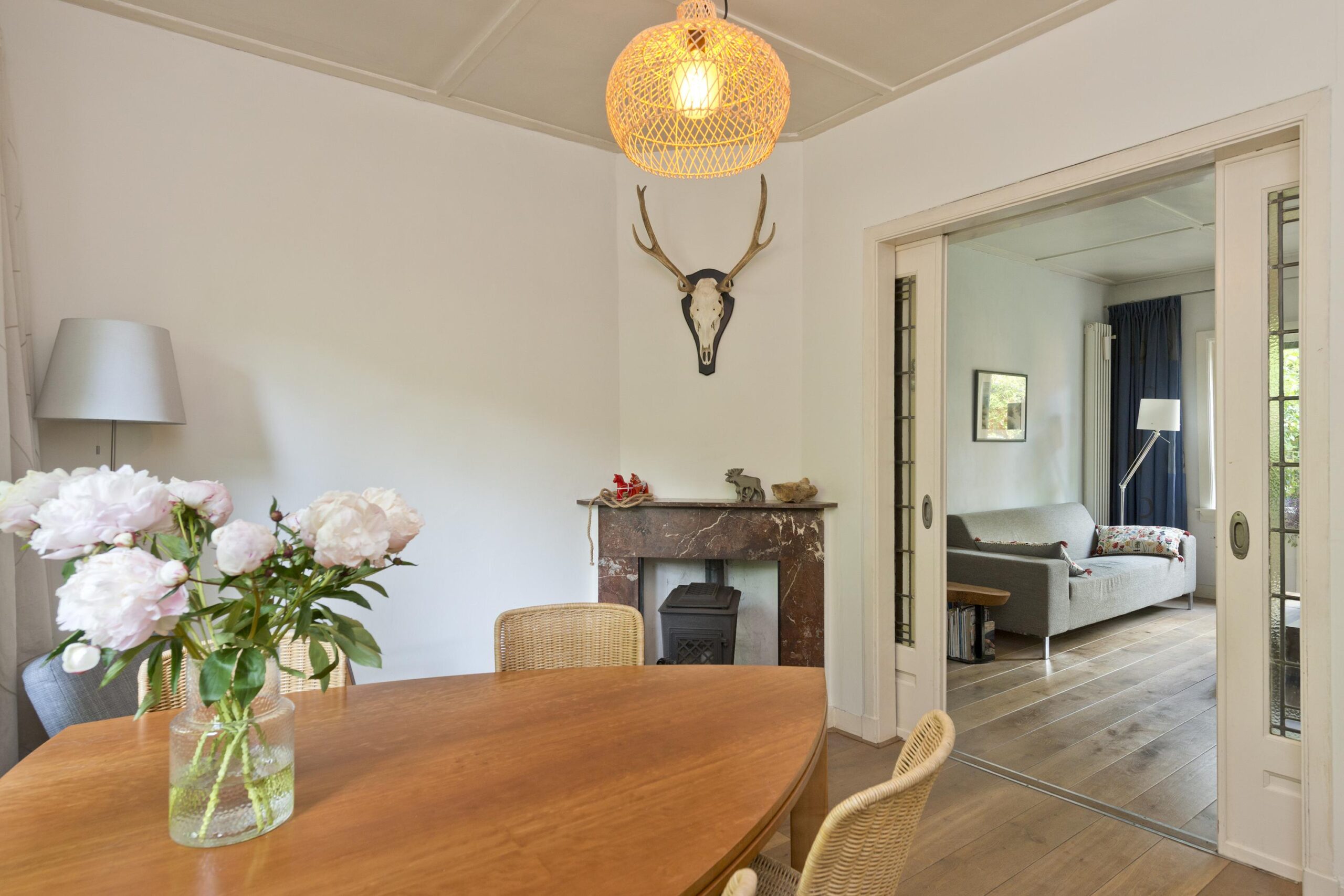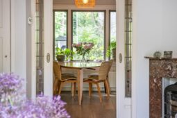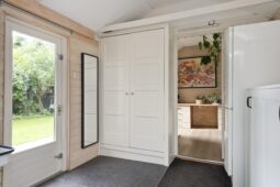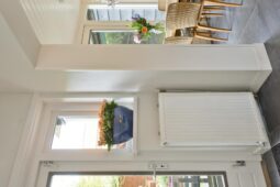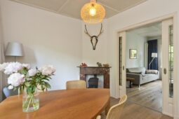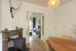 Begane grond: entree via de voordeur naar een ruime hal met trapopgang en moderne toiletruimte voorzien van wandcloset en fonteintje. De sfeervolle woonkamer en suite beschikt over authentieke schouwen, glas-in-lood schuifdeuren, massief houten vloer een inbouwkast en openslaande deuren naar de achtertuin. De aangebouwde woonkeuken is voorzien van een tuindeur, tijdloze inbouwkeuken met natuurstenen blad en inbouwapparatuur, eveneens met openslaande deuren naar de tuin. Vanuit de keuken is er toegang tot de bijkeuken (voormalige garage), voorzien van een vaste kast met de CV-installatie, een eigen tuindeur en openslaande deuren naar de oprit. Aansluitend bevindt zich een praktische werk-, studeer- of slaapkamer op de begane grond, ook met toegang tot de tuin.