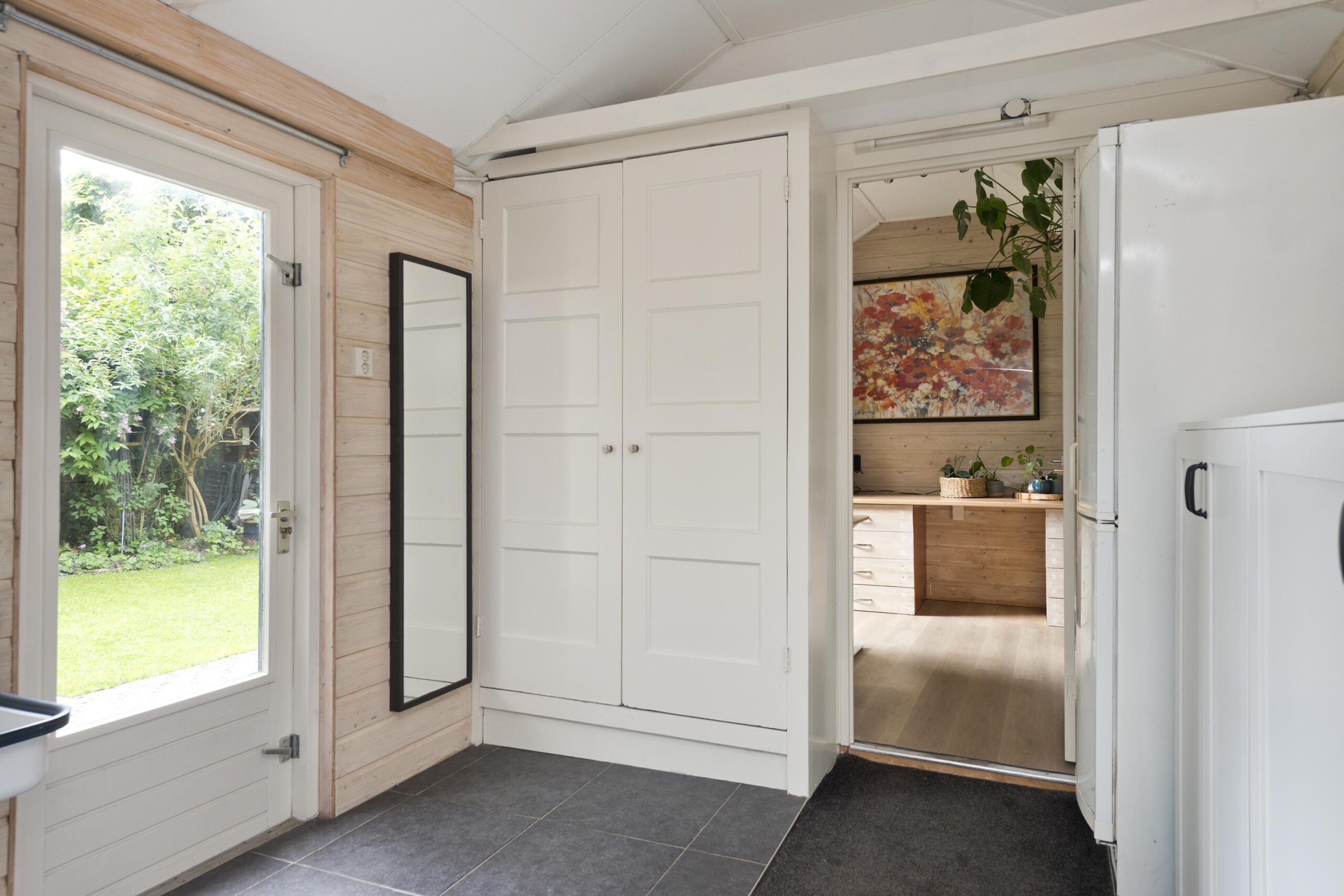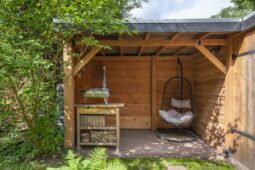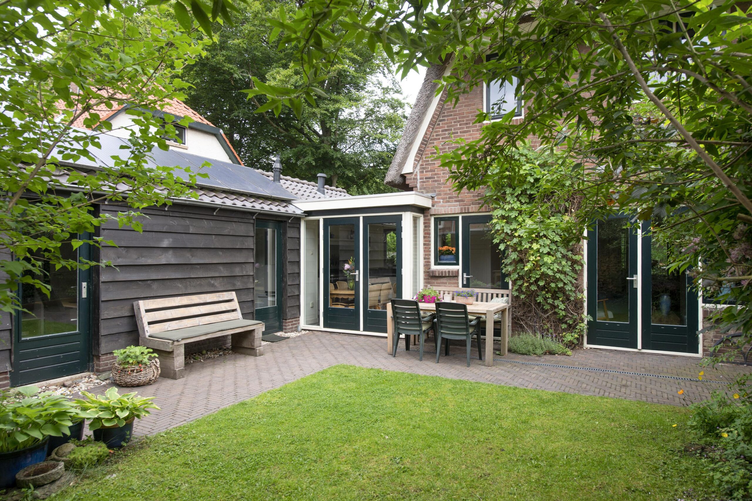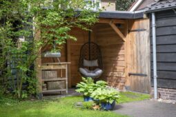 Tuin: een zonnige besloten achtertuin met terras, veranda en houten berging.