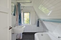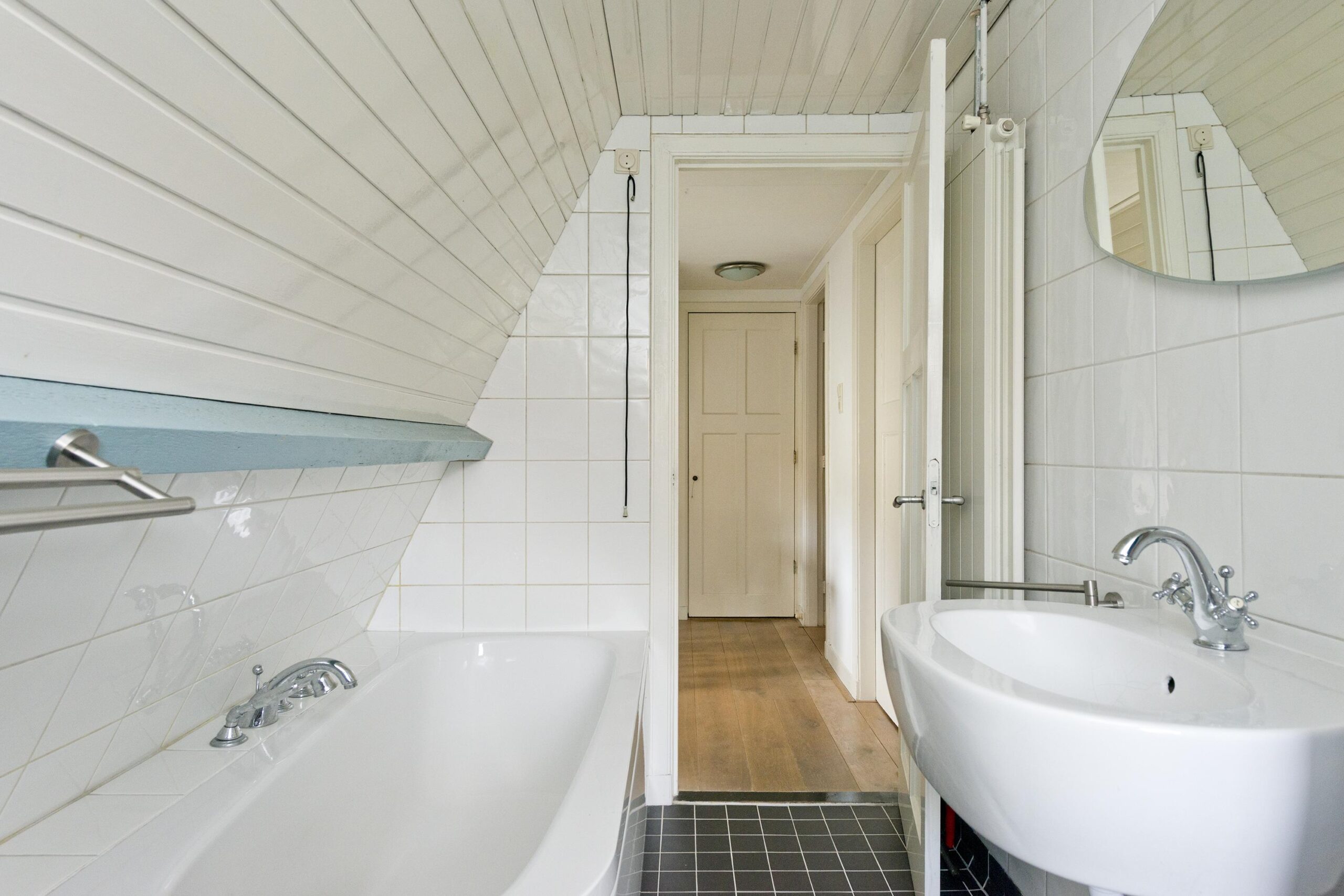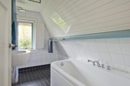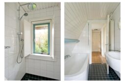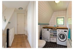 Eerste verdieping: overloop met toegang tot twee ruime slaapkamers, voorzien van een massief houten vloer, waarvan één met handige inbouwkasten. De moderne badkamer beschikt over een ligbad, douche en wastafel. Daarnaast is er een aparte toiletruimte met wandcloset en aansluitingen voor de wasapparatuur.