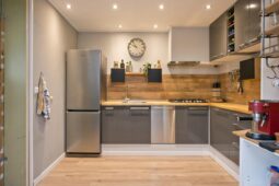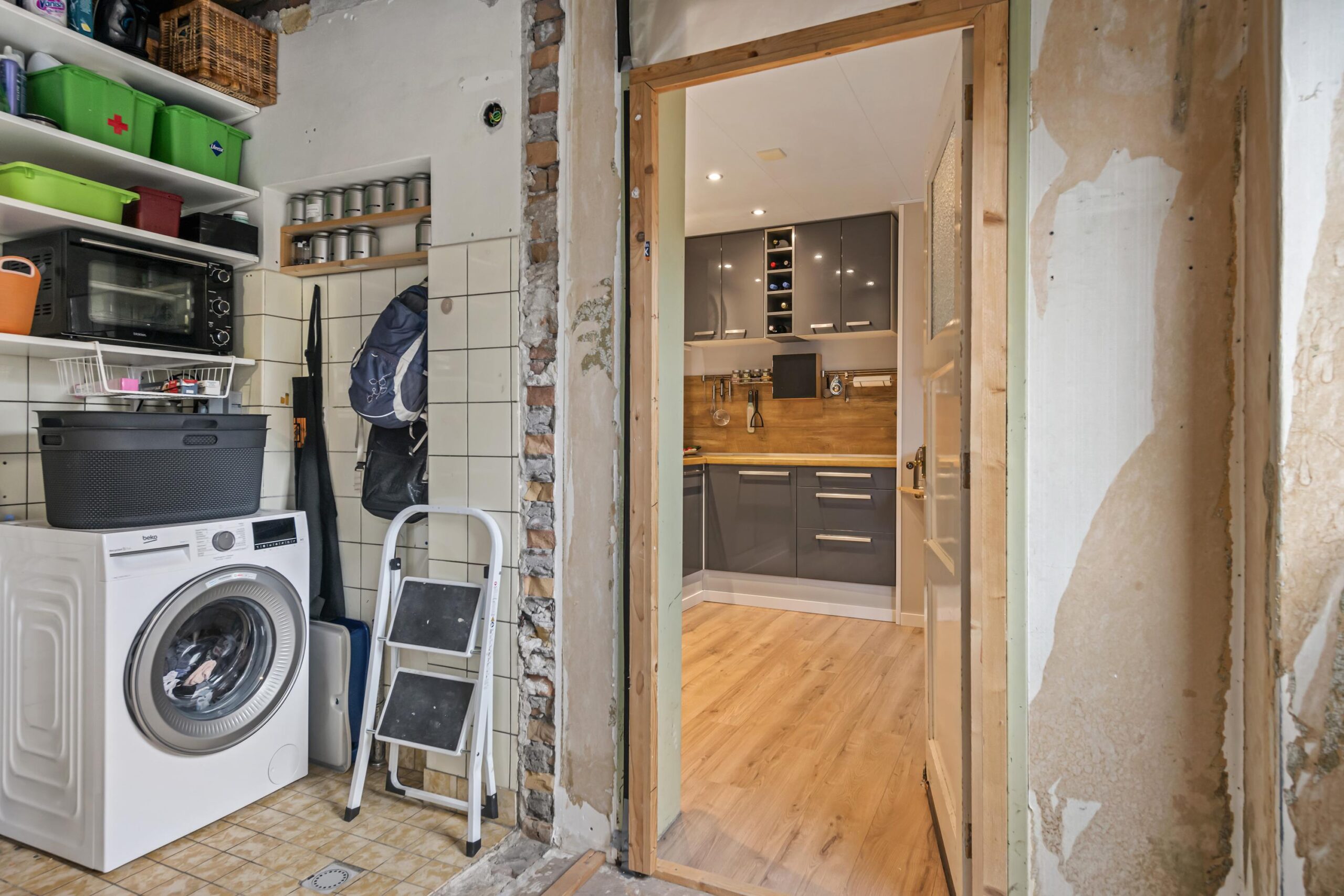 De keuken is voorzien van diverse inbouwapparatuur en biedt toegang tot de multifunctionele ruimte. Deze ruimte bevindt zich momenteel in casco staat en kan geheel naar eigen wens worden afgewerkt. Ideaal als slaap- of werkkamer op de begane grond, maar ook perfect te transformeren tot bijvoorbeeld een woonkeuken met openslaande deuren naar de achtertuin. Hier bevindt zich ook een bijkeuken met aansluitingen voor wasapparatuur.