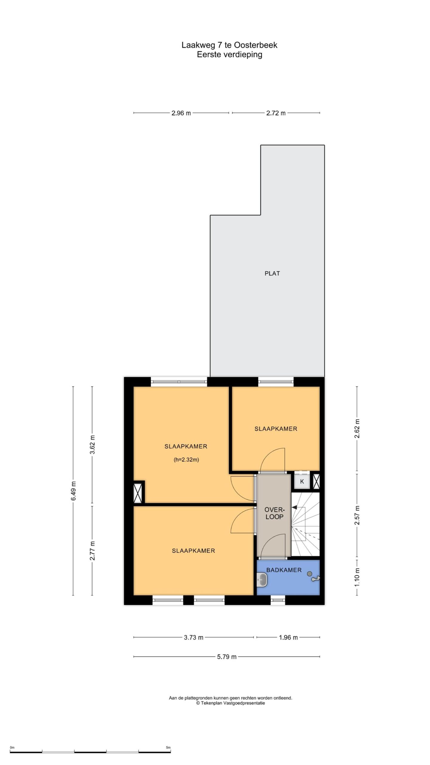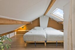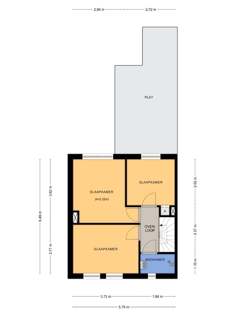 Eerste verdieping: overloop, drie slaapkamers en een badkamer voorzien van douche en wastafel. Via een vaste trap is de tweede verdieping bereikbaar.