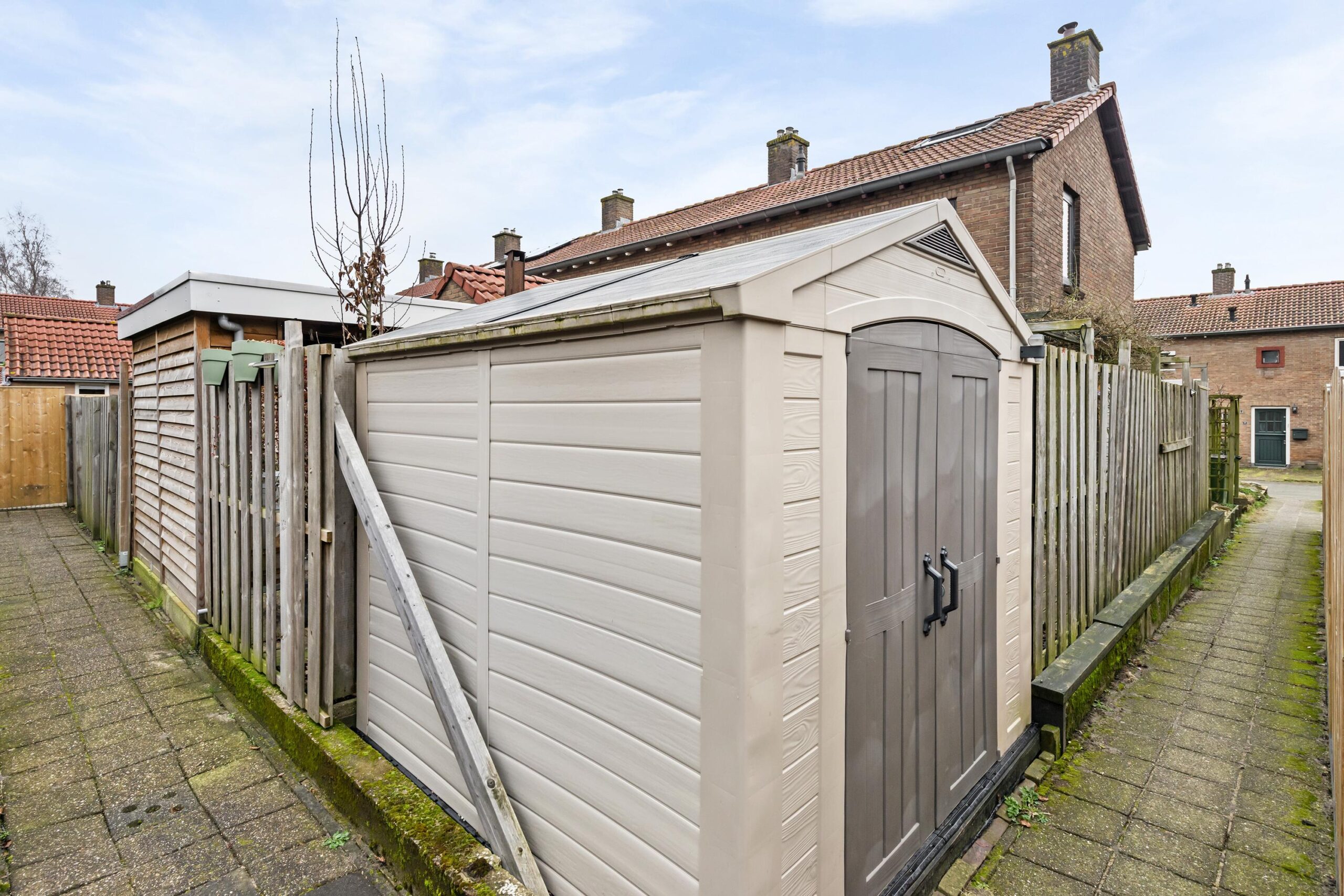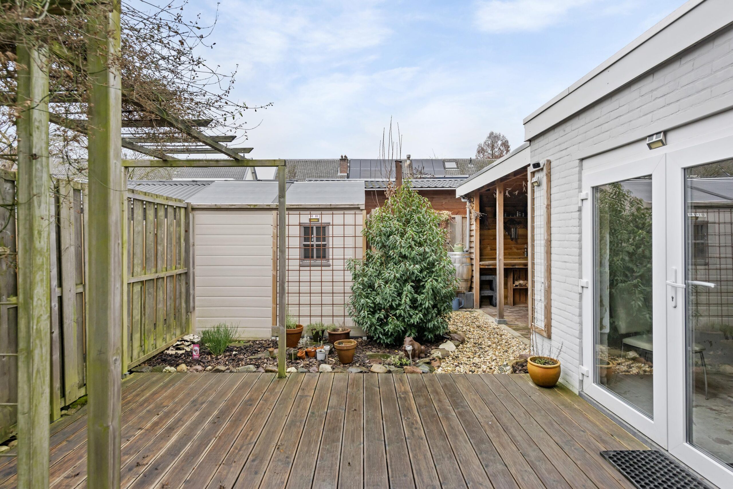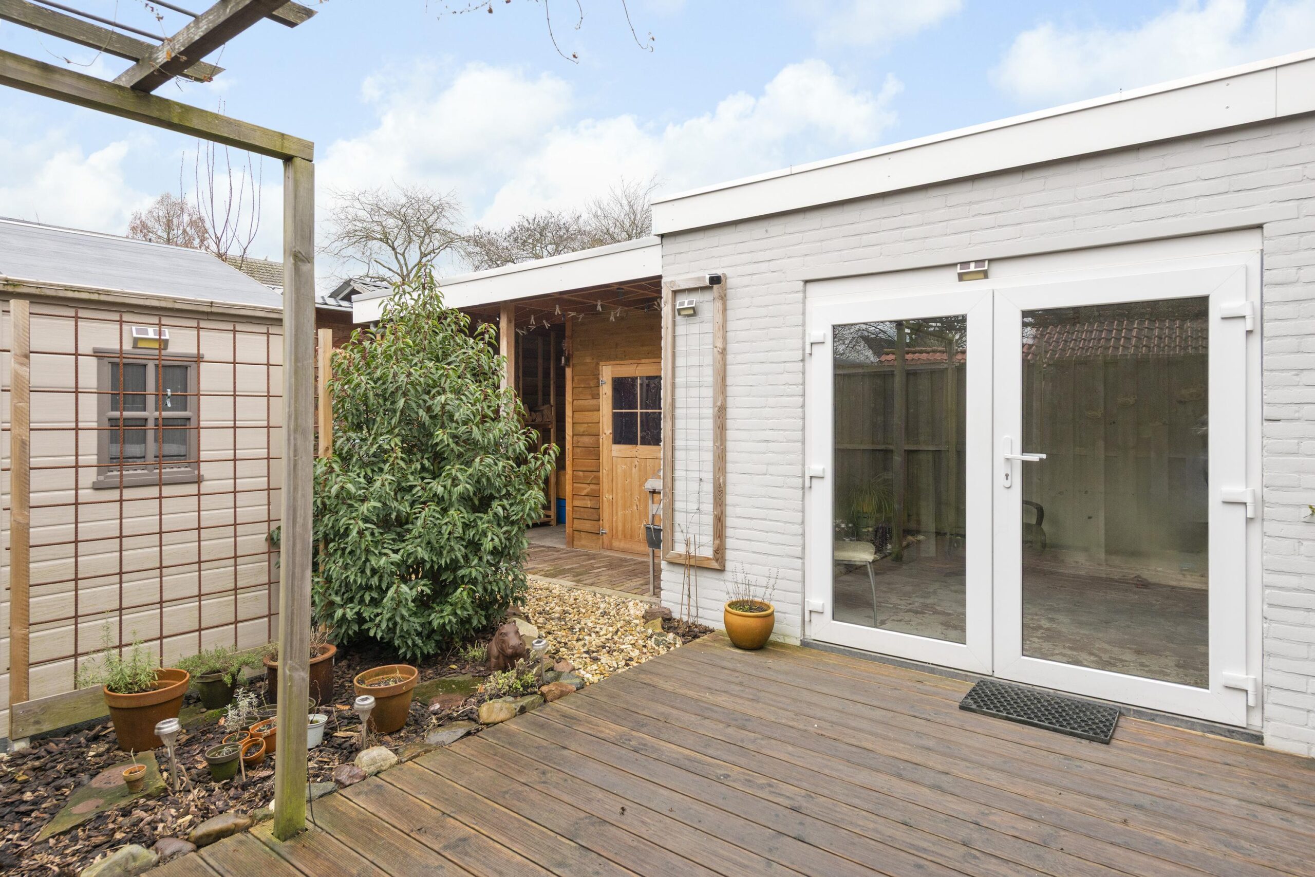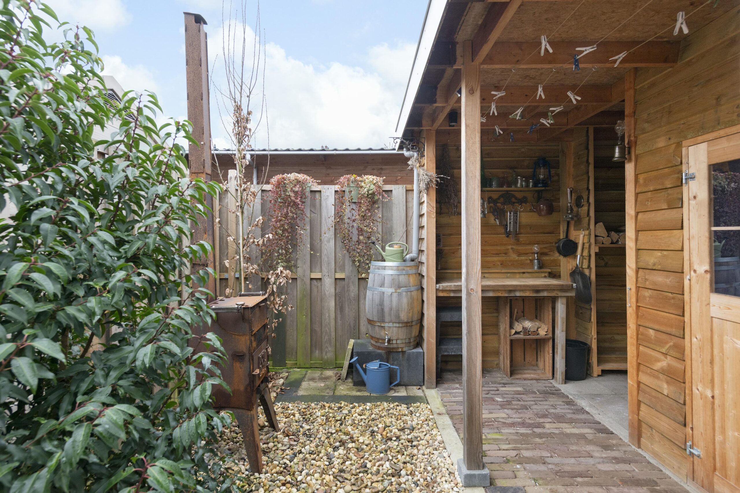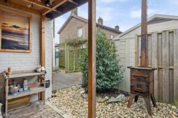 Tuin: de woning beschikt over een voor-, zij- en achtertuin, waardoor u altijd wel een plekje in de zon of schaduw kunt vinden. In de achtertuin bevinden zich een houten schuur met elektra, een overkapping en een extra berging voor fietsen.