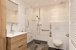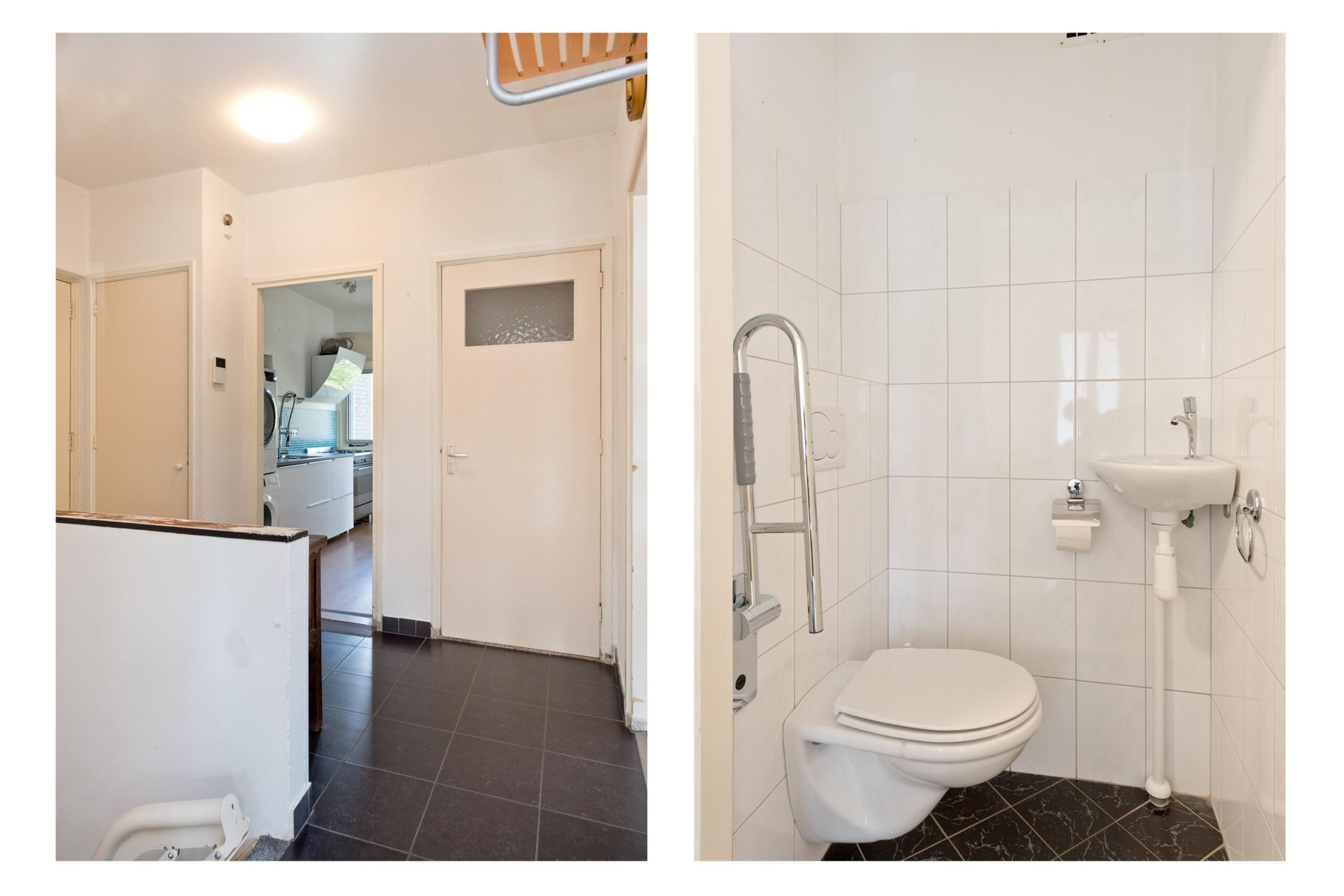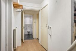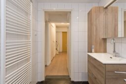 Hal met inbouwkast, tweede royale slaapkamer met een tussenliggende vernieuwde badkamer met douche, 2e toilet en wastafelmeubel.