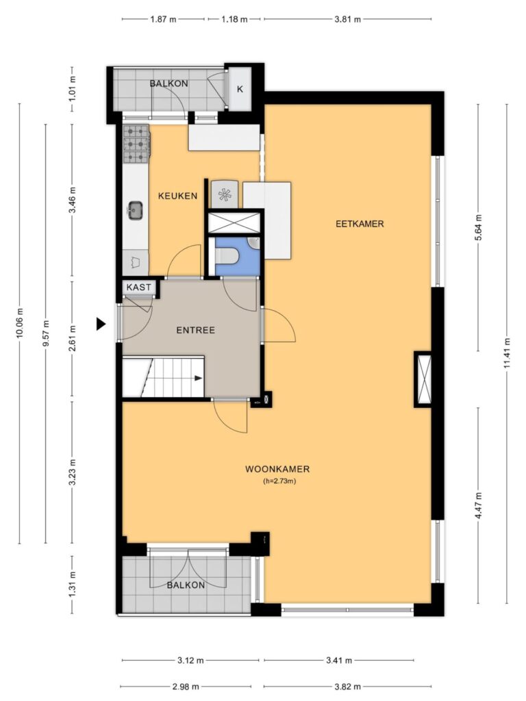 moderne toilet met fontein, half open keuken met inbouwapparatuur en deur naar het balkon met bergkast. Vanuit de keuken heeft u direct toegang tot de ruim opgezette eetkamer en lichte en zonnige woonkamer. Deze L-vormige woonkamer beschikt over openslaande deuren naar het op de zonzijde gelegen balkon.