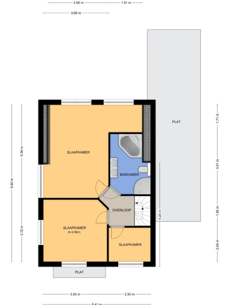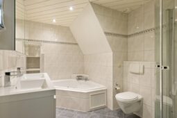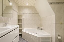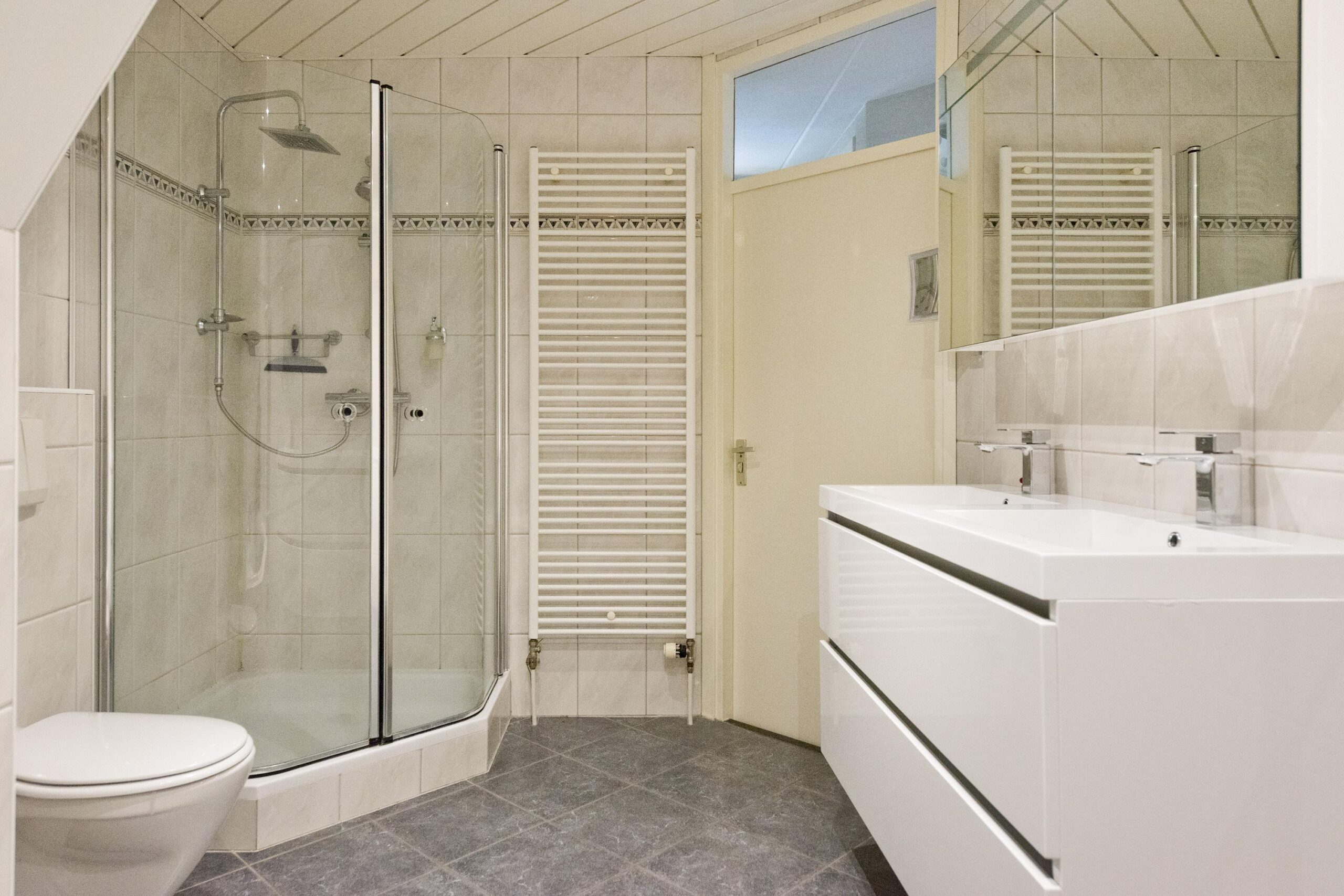 Overloop, drie goede slaapkamers, waarvan één met airconditioning. De badkamer is ruim en voorzien van een ligbad, aparte douche, toilet, wastafelmeubel, vloerverwarming en mechanische ventilatie. Via een vaste trap is de tweede verdieping bereikbaar.
