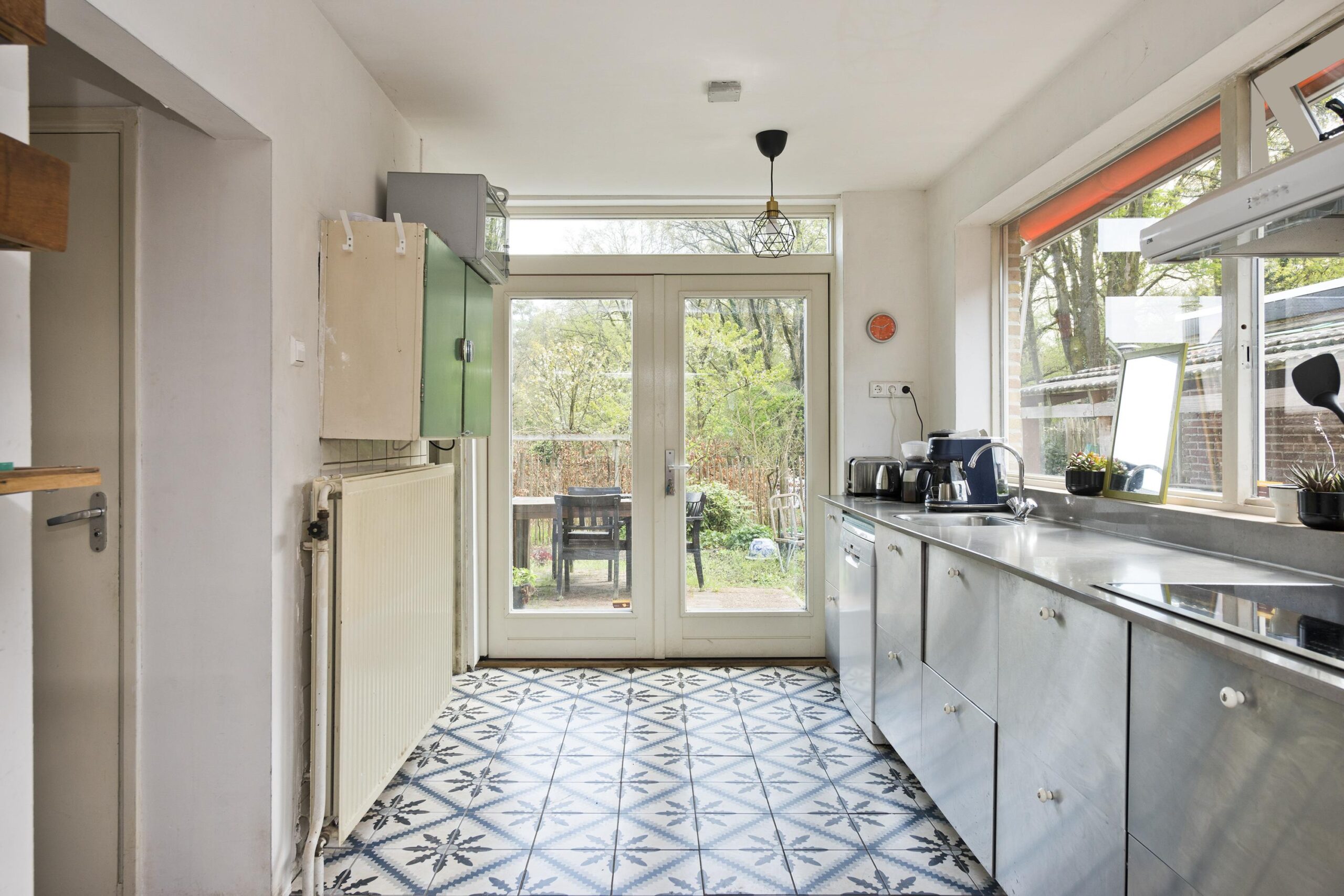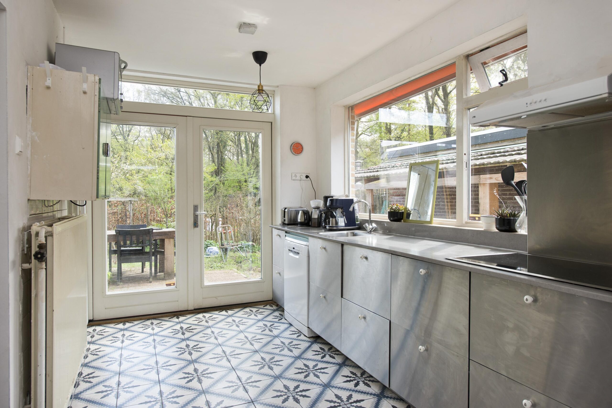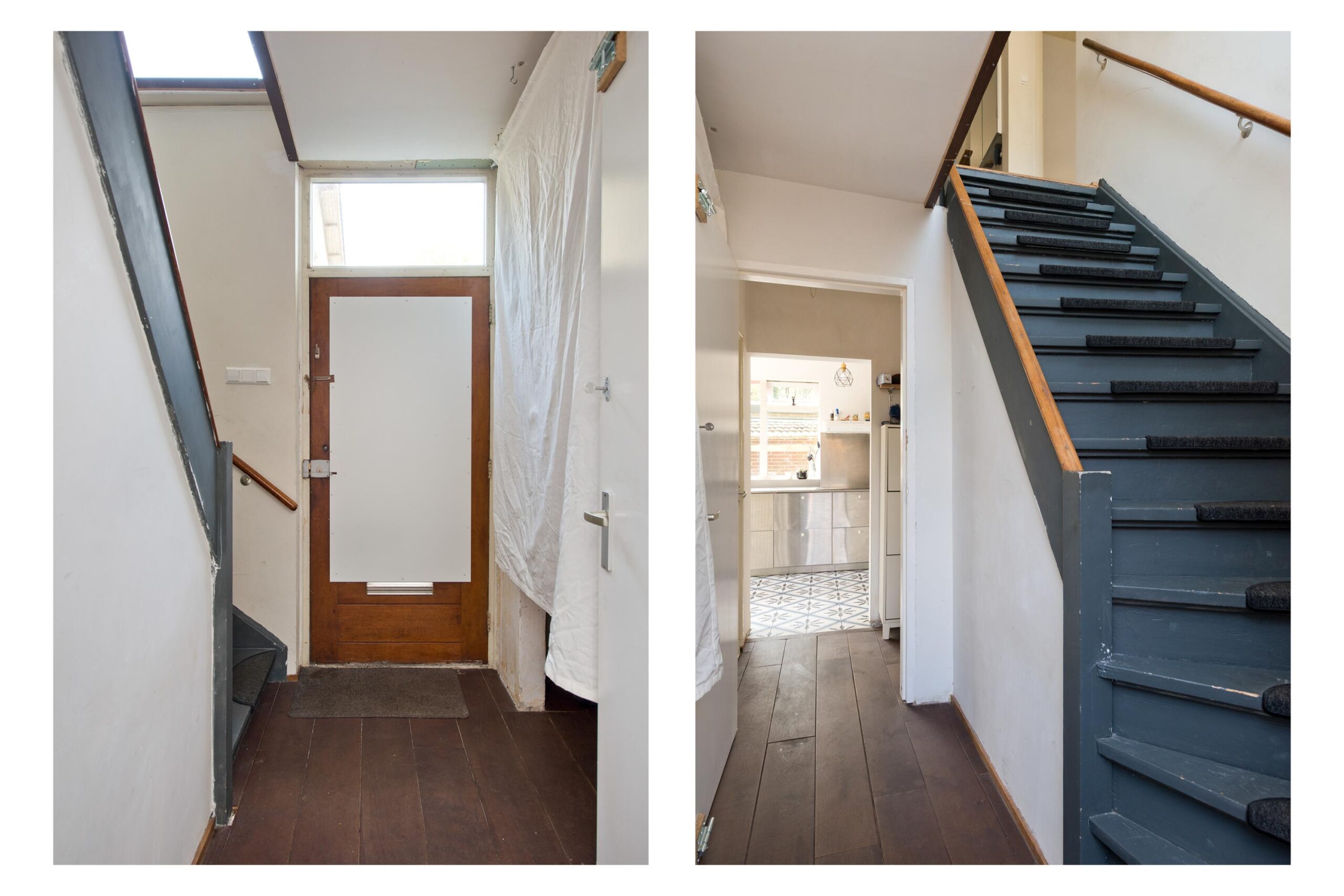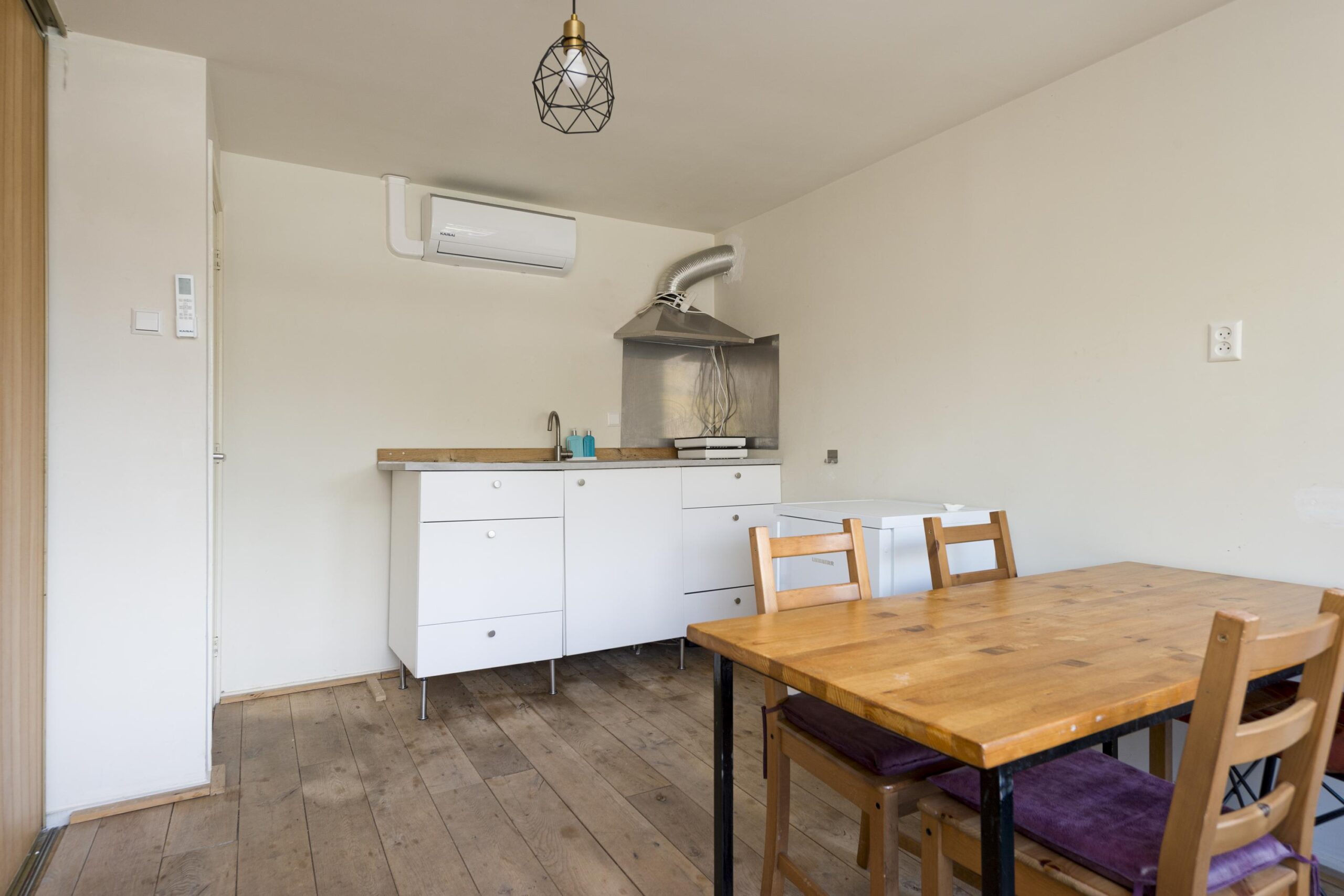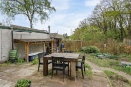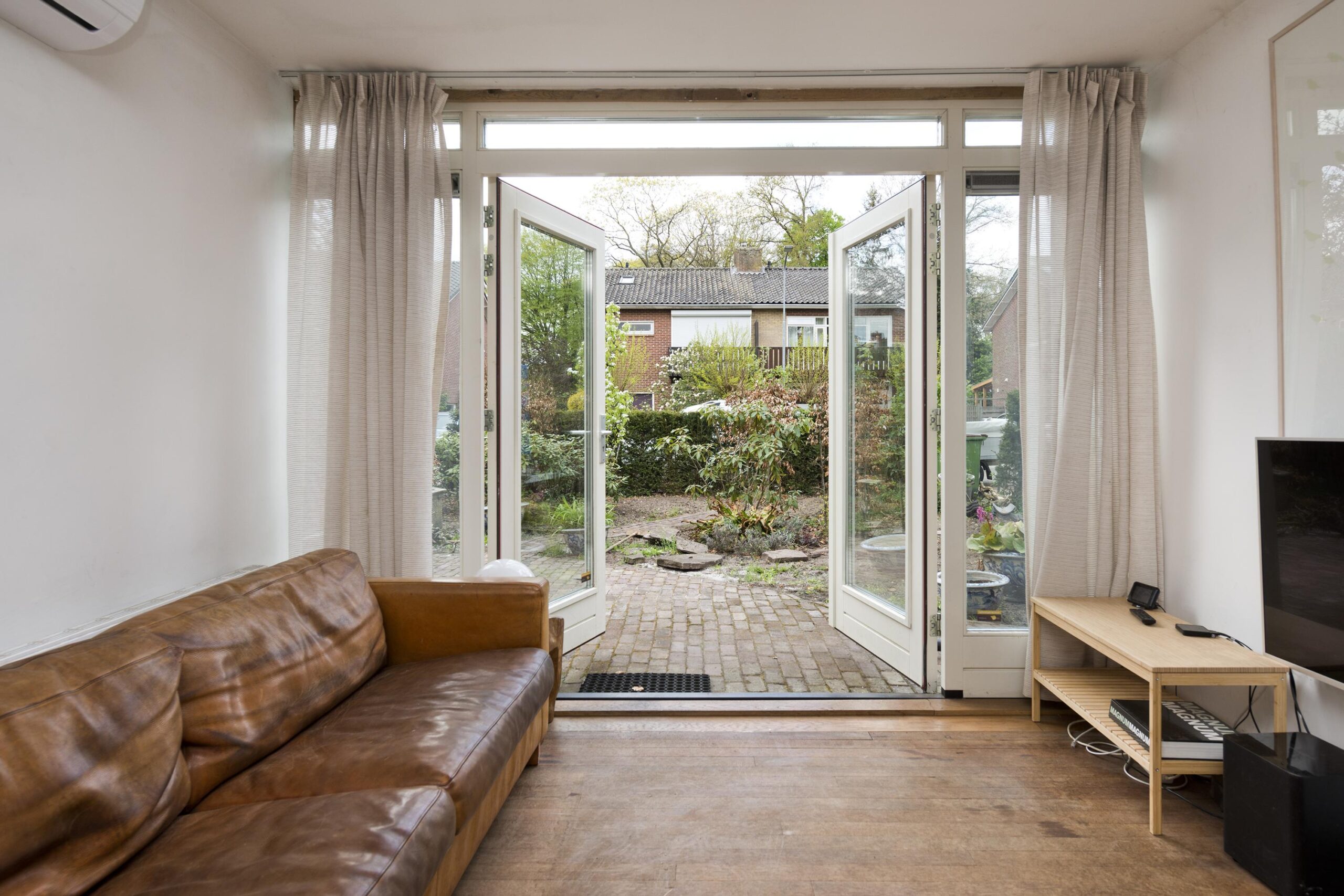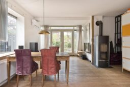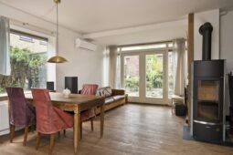 Entree via ruime hal met wasmachineaansluiting en buffervat (de hal is vergroot door samenvoeging met een voormalig kamertje), toiletruimte. Lichte woonkamer met houten vloer, houtkachel, airco en openslaande deuren naar de tuin. Moderne open keuken met inbouwapparatuur en eveneens openslaande deuren naar een heerlijke achtertuin (gelegen op het zuidoosten). In de tuin bevinden zich ruime bergingen.
