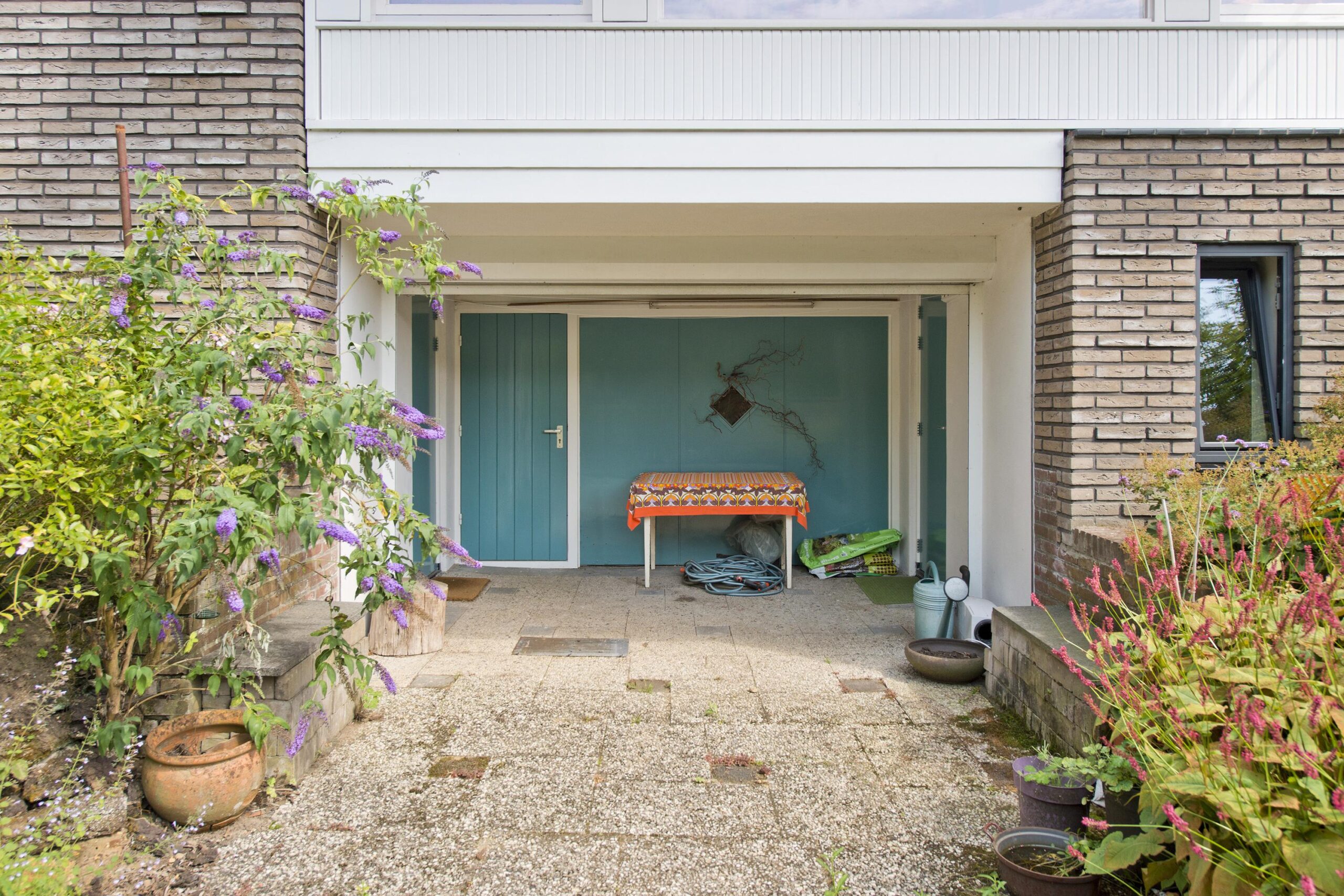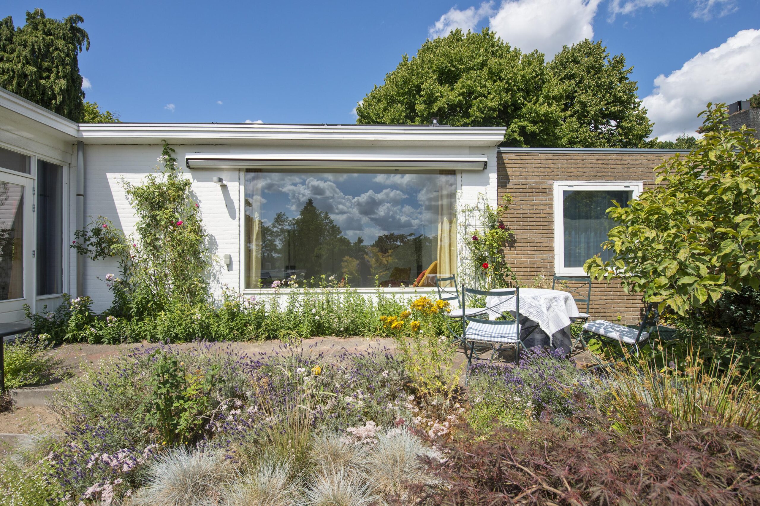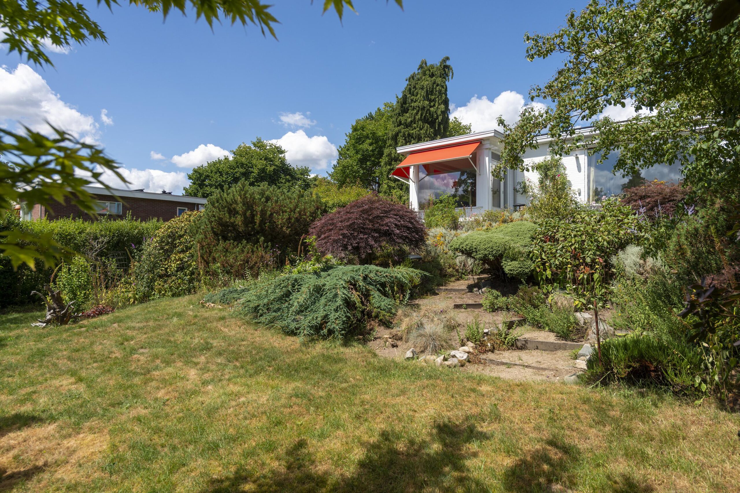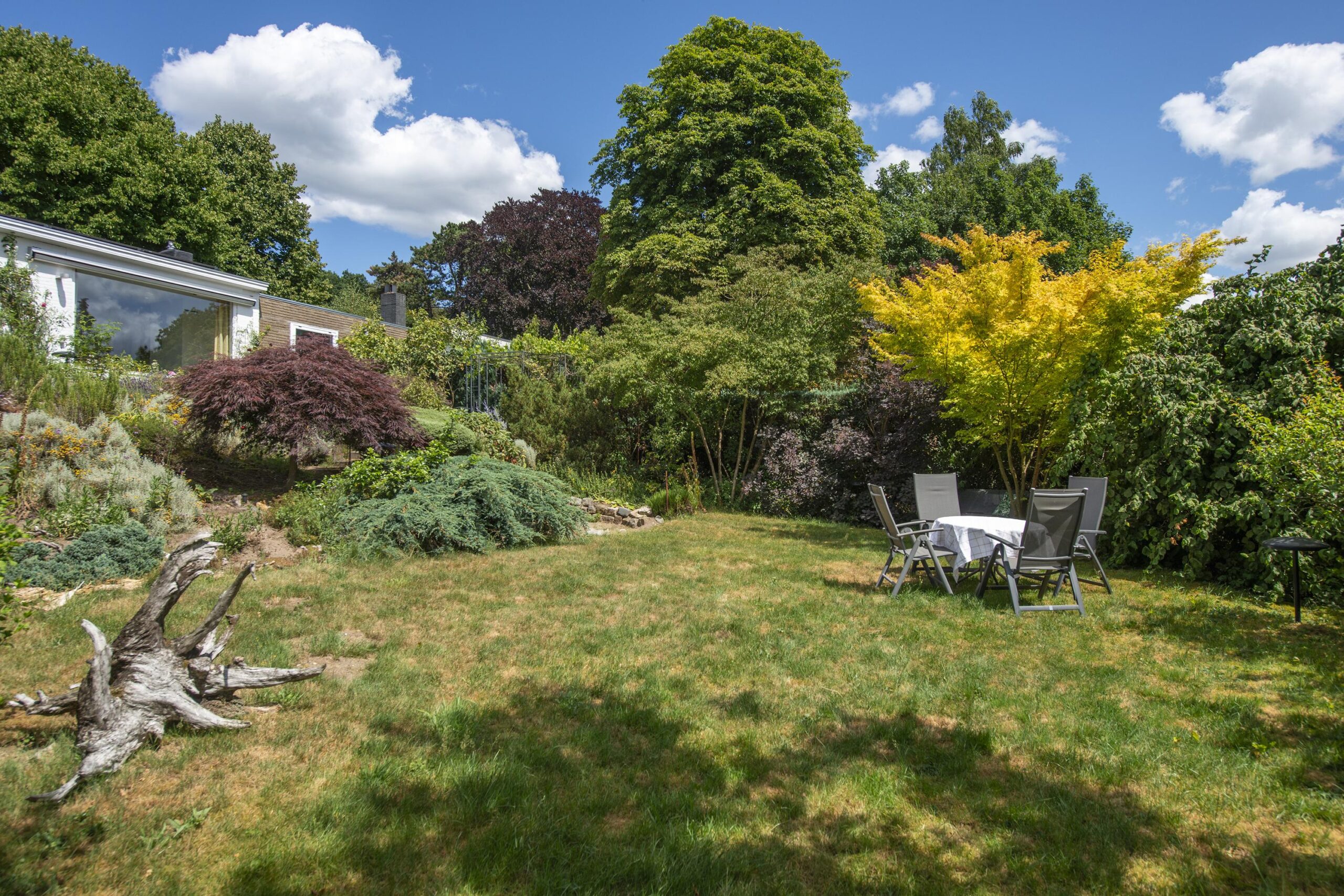 De rondom gelegen fraai aangelegde tuin loopt naast de woning omlaag naar de garage. De achtertuin ligt gunstig op het zuiden. Vanaf het terras aan de achterzijde loopt de tuin omlaag naar een omsloten gedeelte met zon en schaduw.