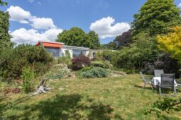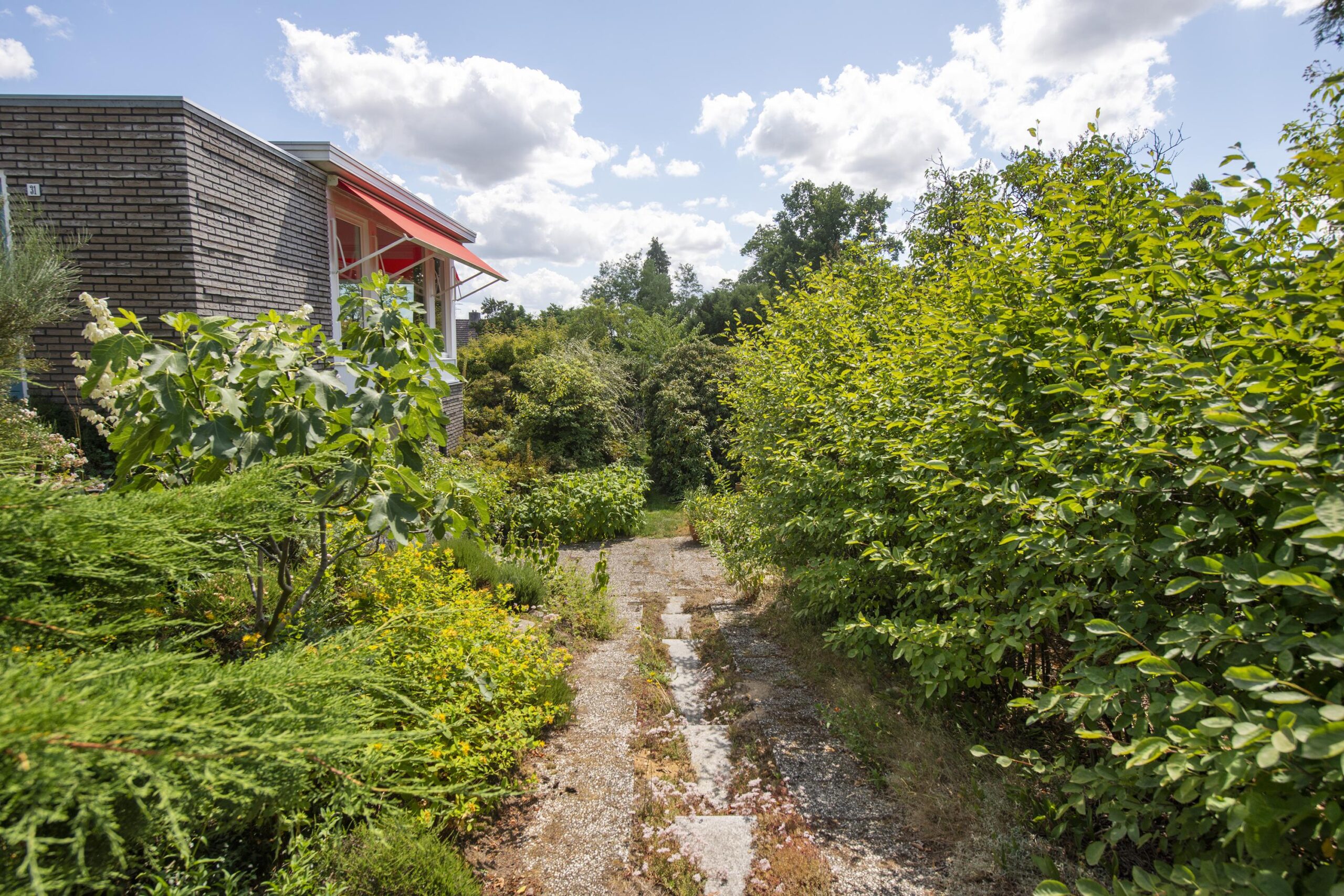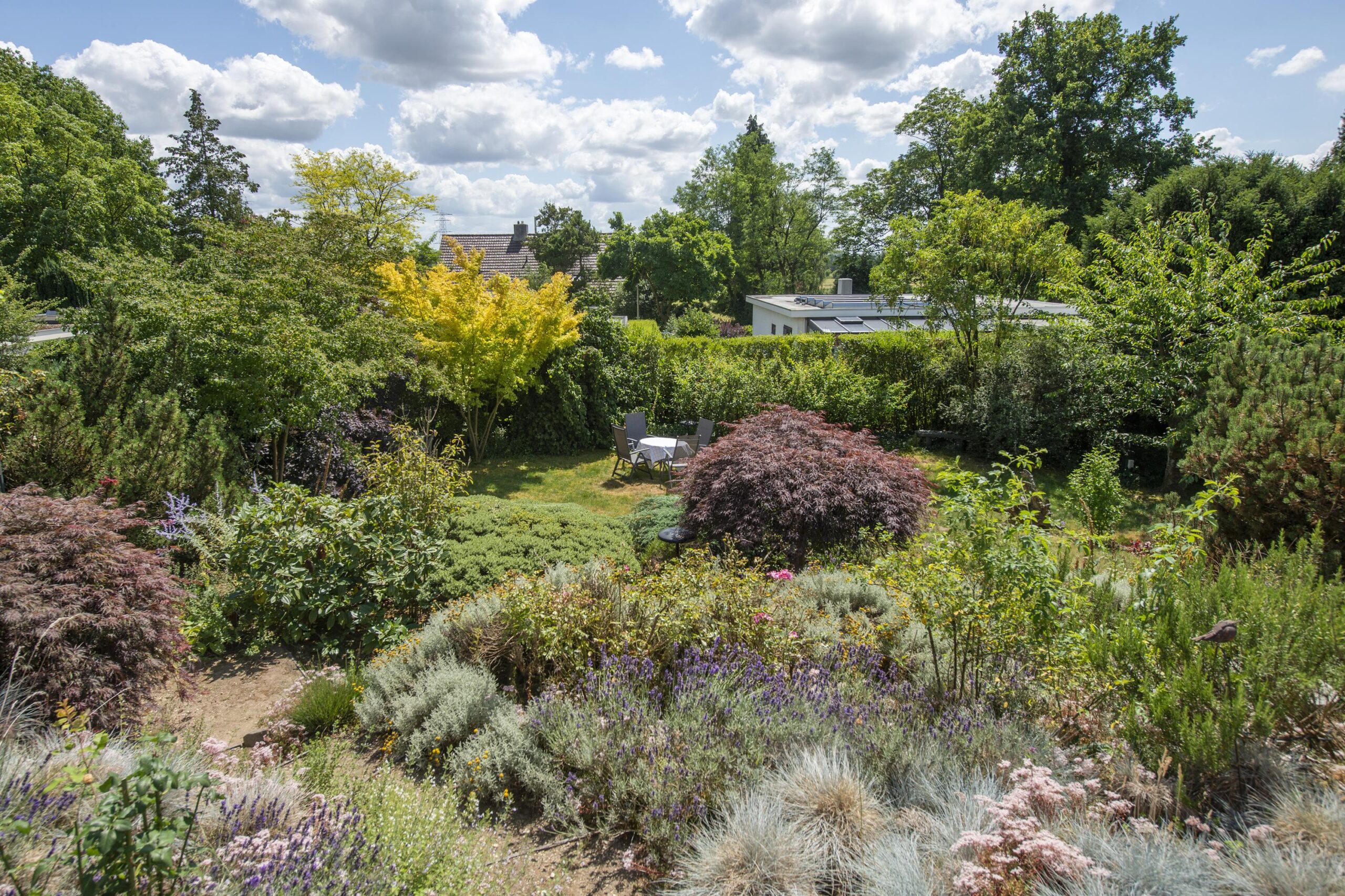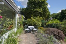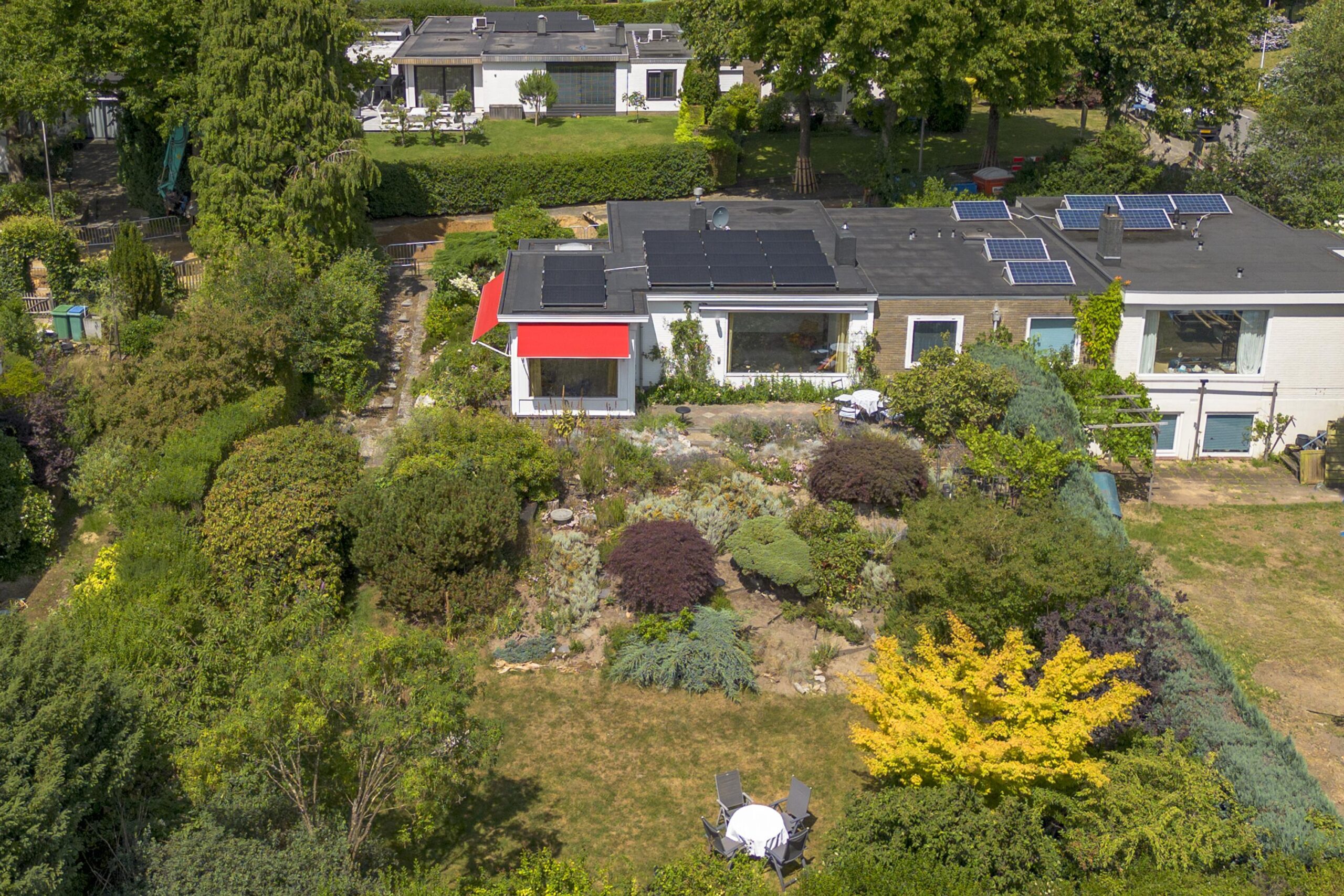 De rondom gelegen fraai aangelegde tuin loopt naast de woning omlaag naar de garage. De achtertuin ligt gunstig op het zuiden. Vanaf het terras aan de achterzijde loopt de tuin omlaag naar een omsloten gedeelte met zon en schaduw.