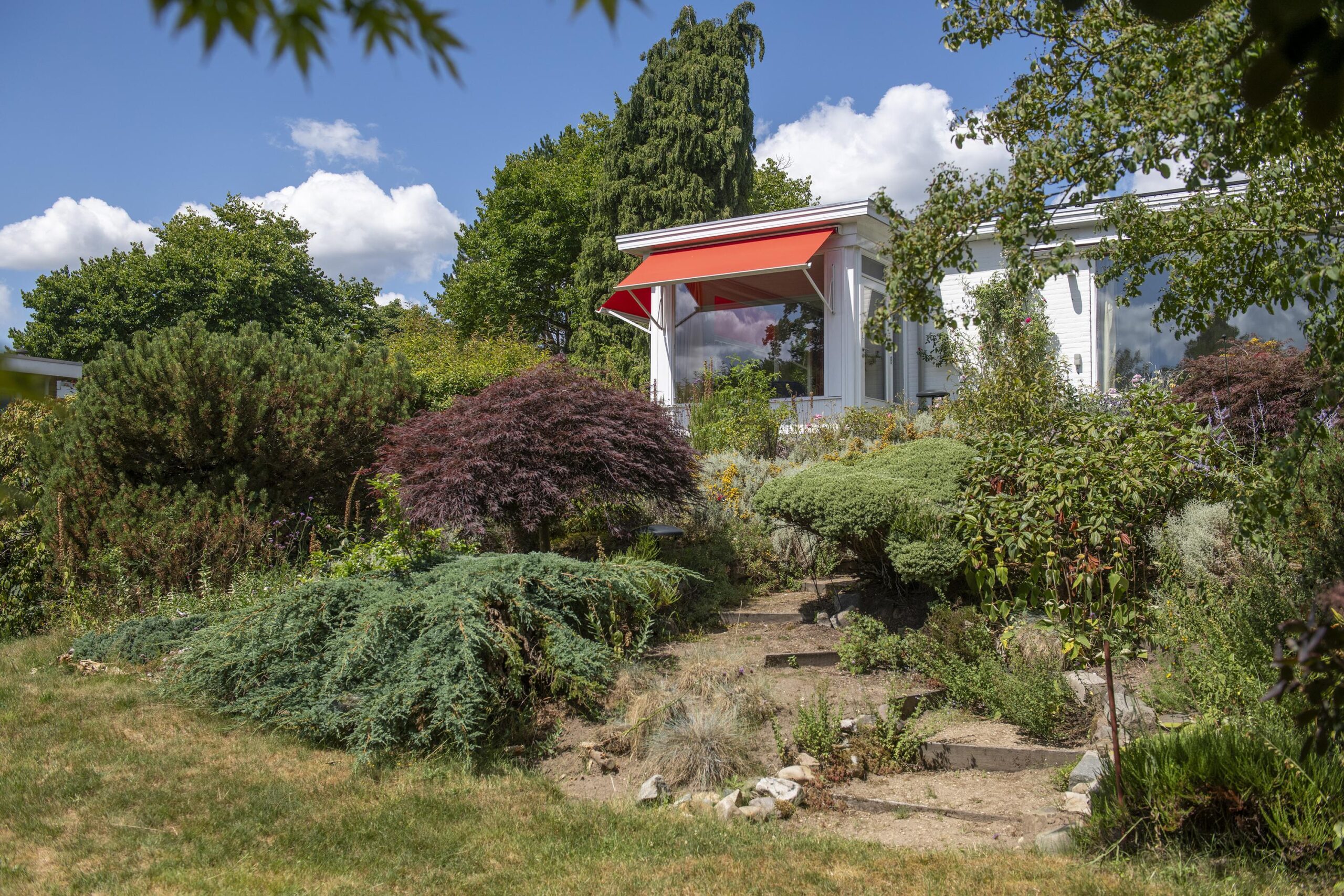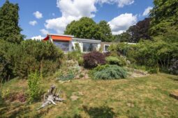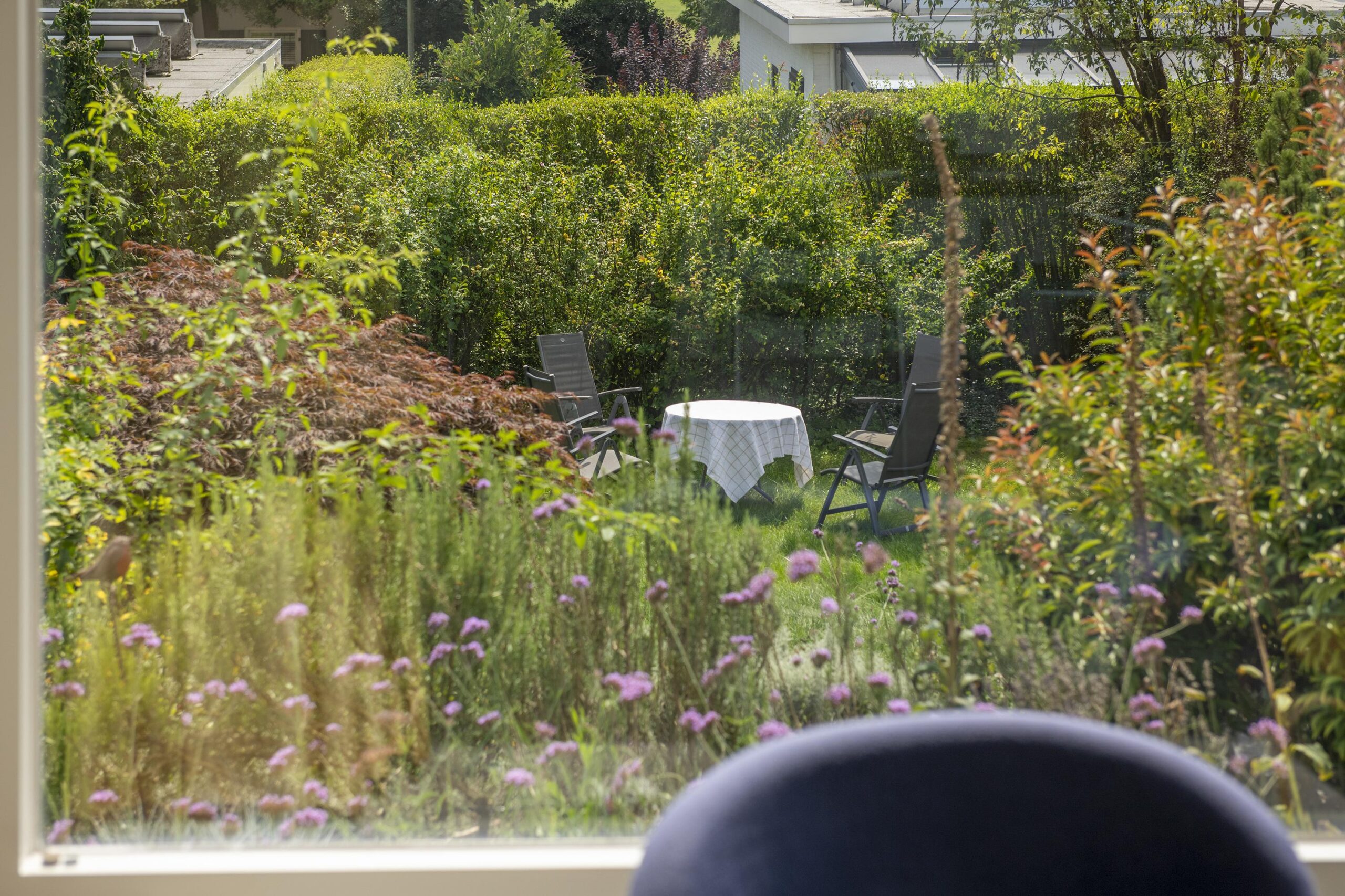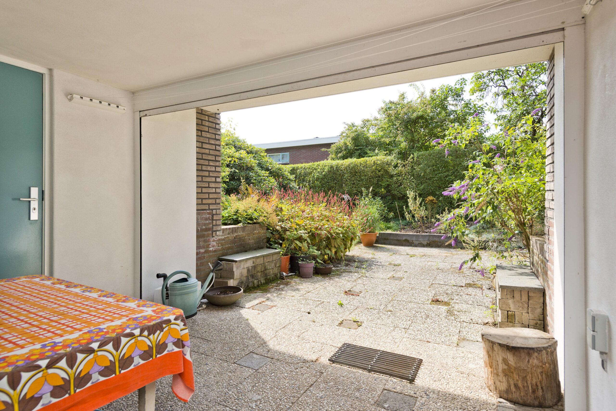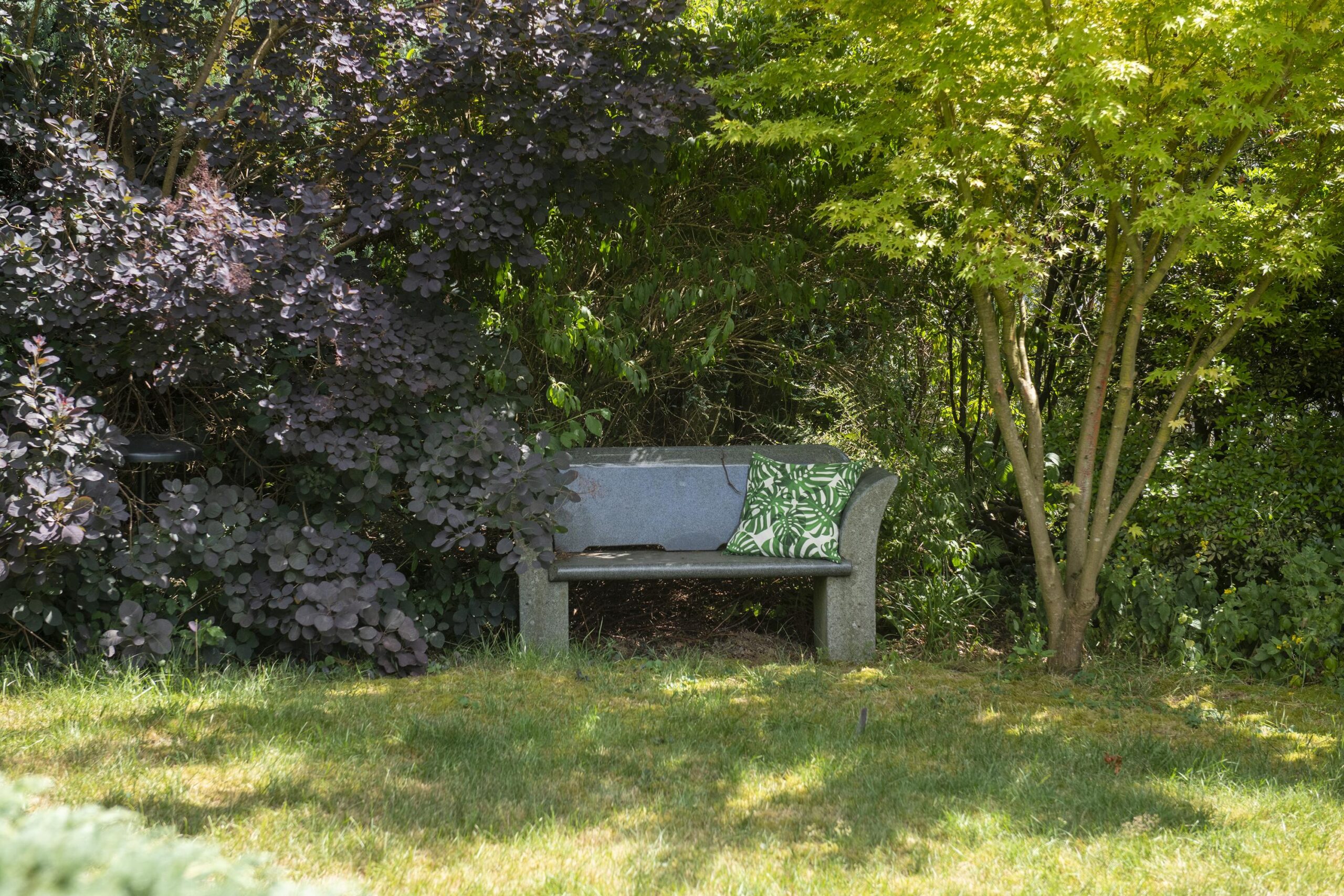 De rondom gelegen fraai aangelegde tuin loopt naast de woning omlaag naar de garage. De achtertuin ligt gunstig op het zuiden. Vanaf het terras aan de achterzijde loopt de tuin omlaag naar een omsloten gedeelte met zon en schaduw.