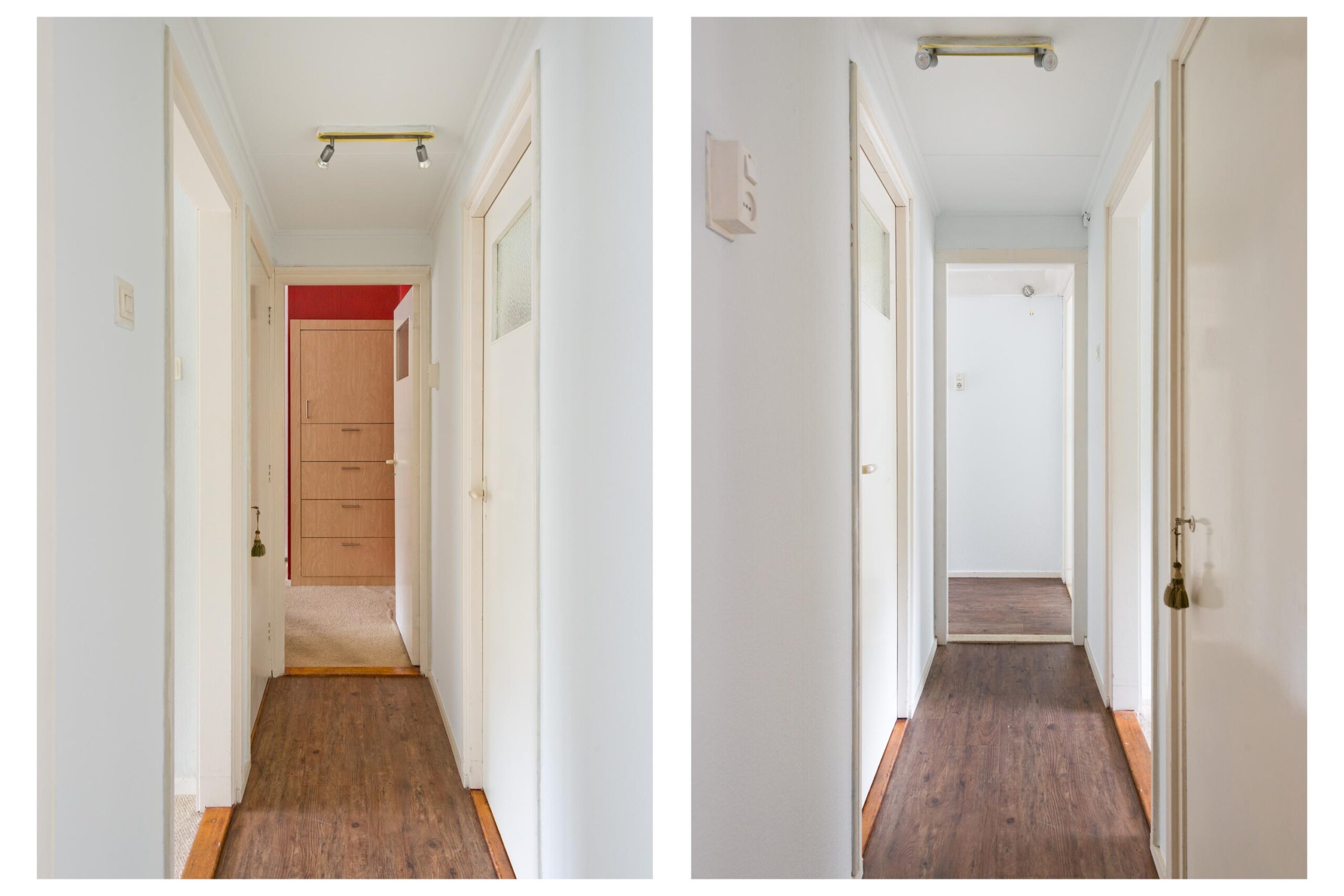 Het appartement beschikt over een ruime hal met meterkast, een lichte woonkamer met schouw en grote raampartijen op het zuiden en een deur naar het balkon. De keuken is eenvoudig maar verzorgd en voorzien van een praktische inbouwkast. Via zowel de keuken als de hal is de badkamer bereikbaar, met douche, wastafel en handdoekenradiator. Er zijn drie goed bemeten slaapkamers met vaste kasten; twee daarvan grenzen aan het balkon en hebben elk een eigen deur naar buiten. De derde, grootste slaapkamer ligt aan de rustige galerijzijde. Naast de voordeur bevindt zich een extra bergkast met de cv-installatie en in de onderbouw is nog een handige berging met elektra aanwezig.