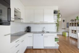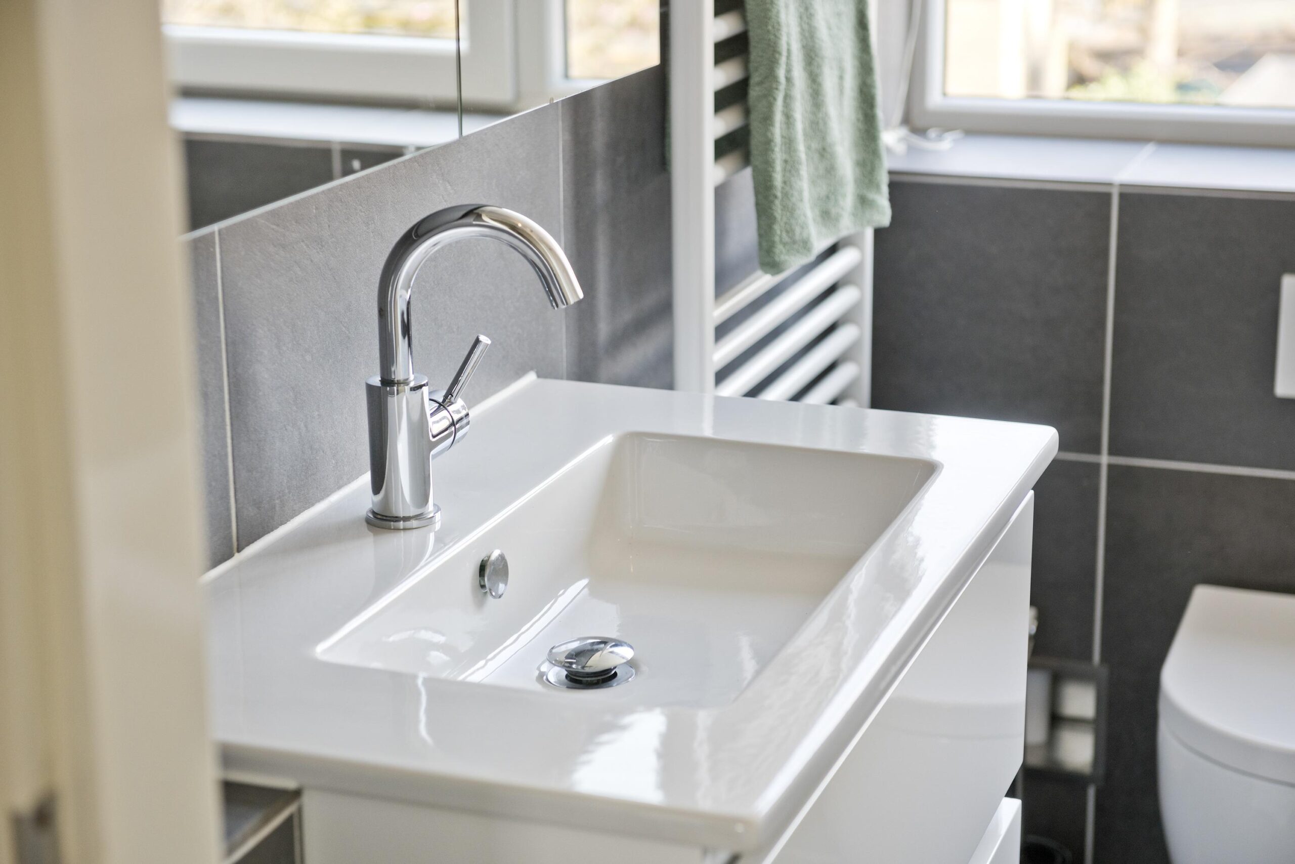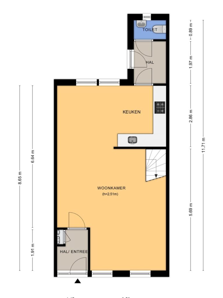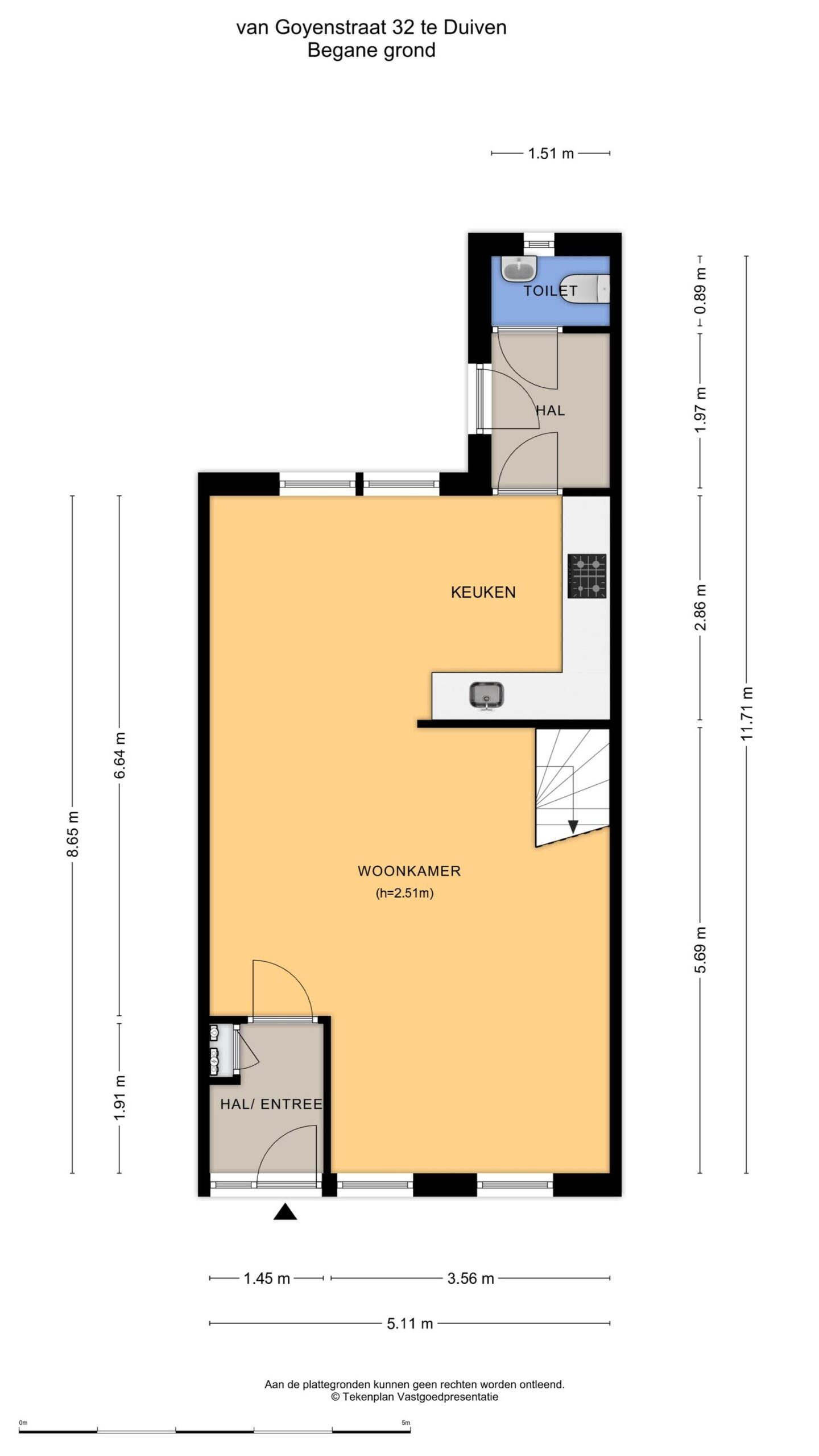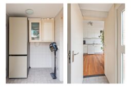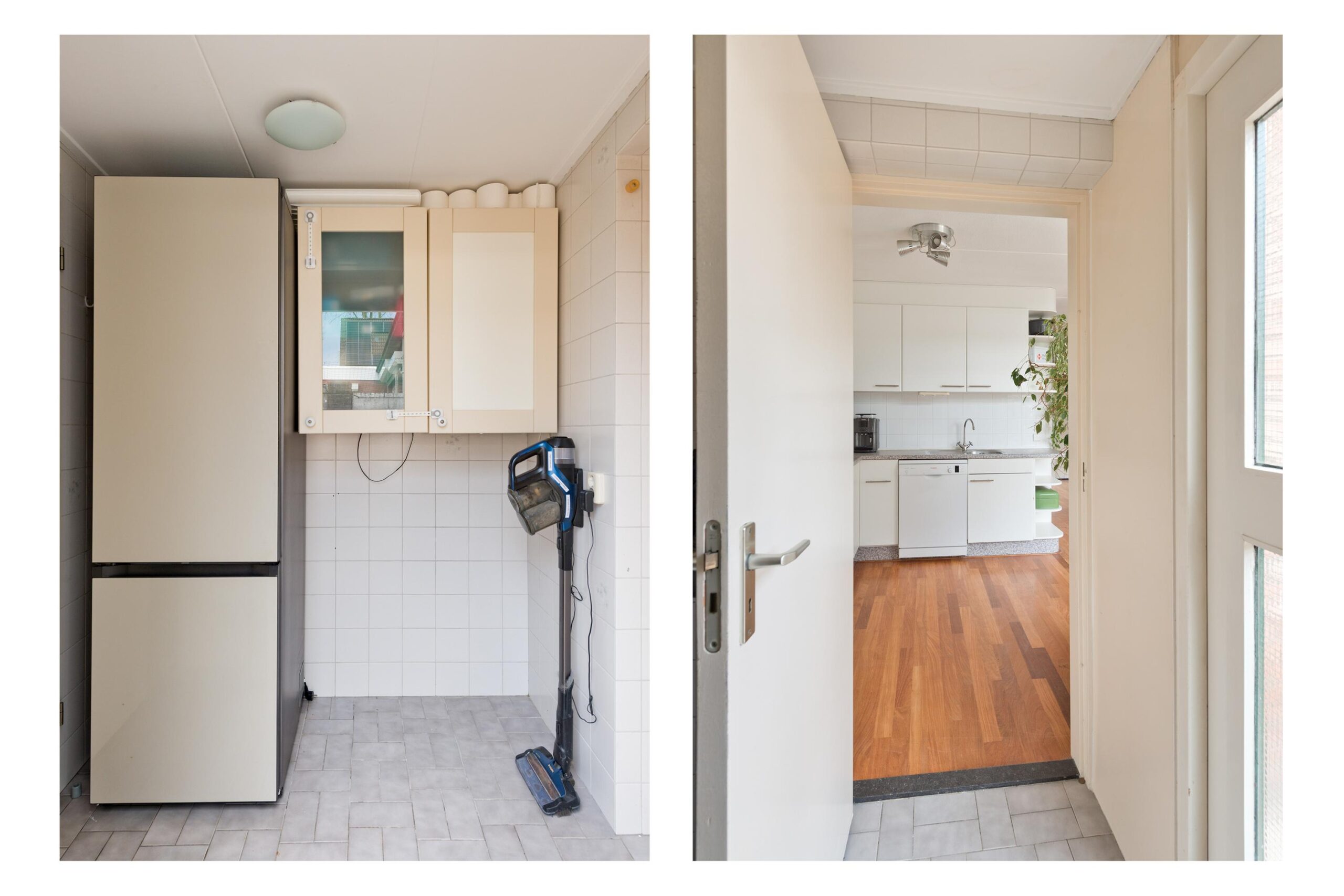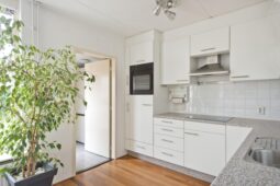 Entree, hal, meterkast met moderne automatische groepen en stadsverwarmingsunit. De lichte, ruime woonkamer is voorzien van een houten vloer en een open keuken met een net keukenblok in lichte kleurtinten. Vanuit de praktische bijkeuken met tuindeur is de achtertuin bereikbaar. Daarnaast bevindt zich op de begane grond een toiletruimte met fonteintje en raam.
