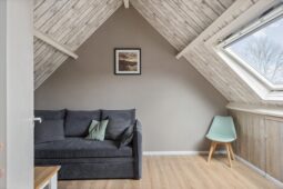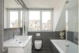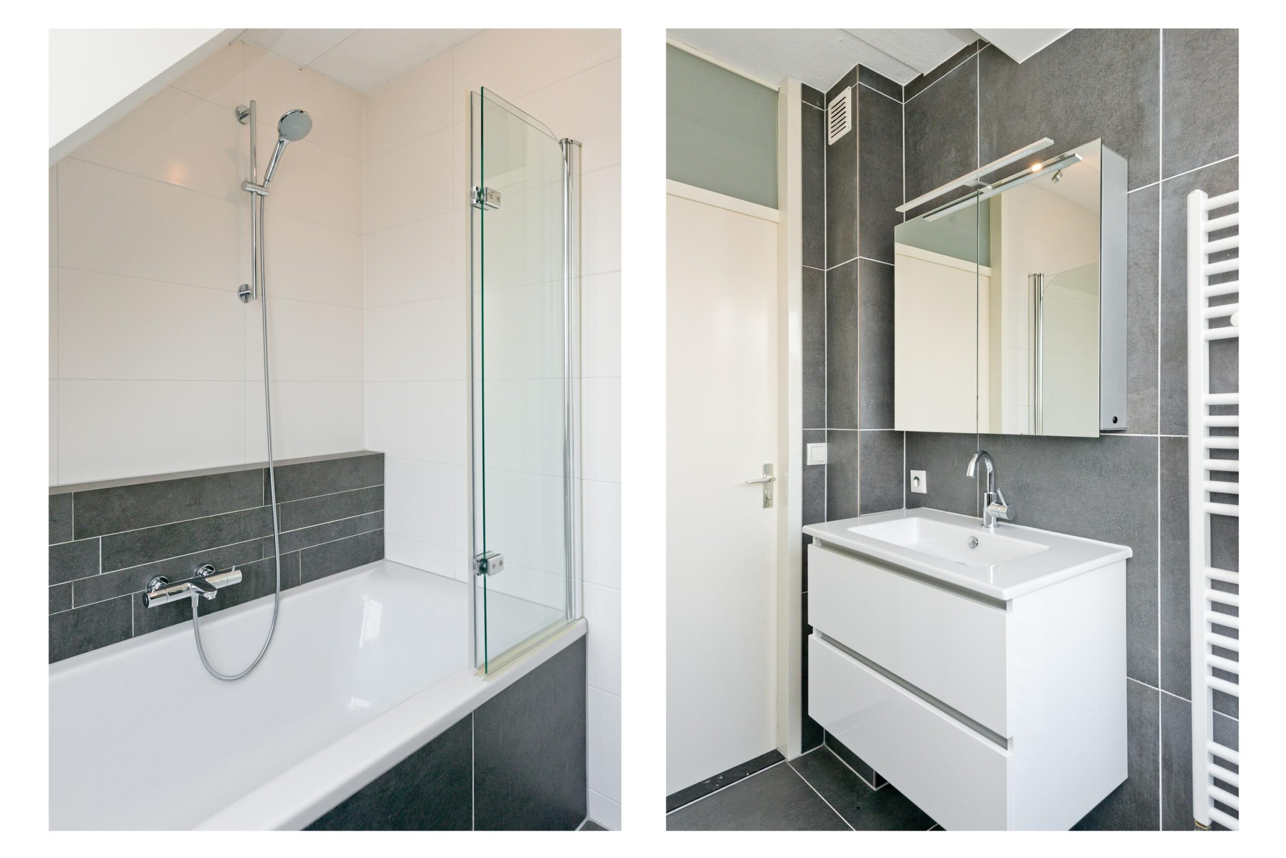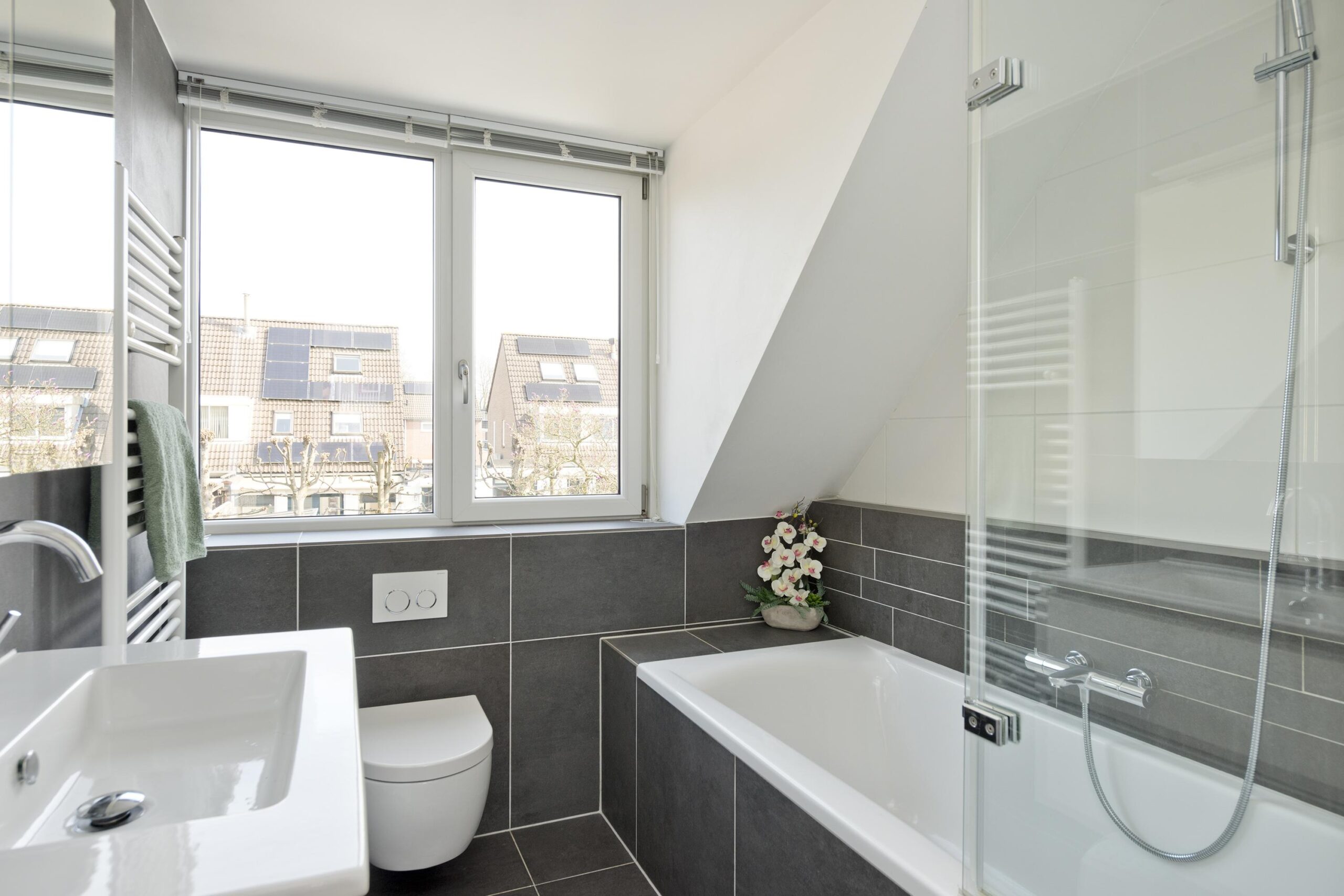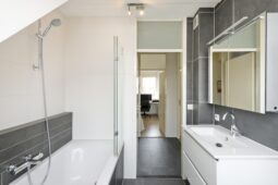 Overloop met toegang tot drie ruime slaapkamers, waarvan één is voorzien van een brede dakkapel die doorloopt in de badkamer. De moderne badkamer beschikt over een ligbad/douchecombinatie, een stijlvol wastafelmeubel, een handdoekradiator en mechanische ventilatie.